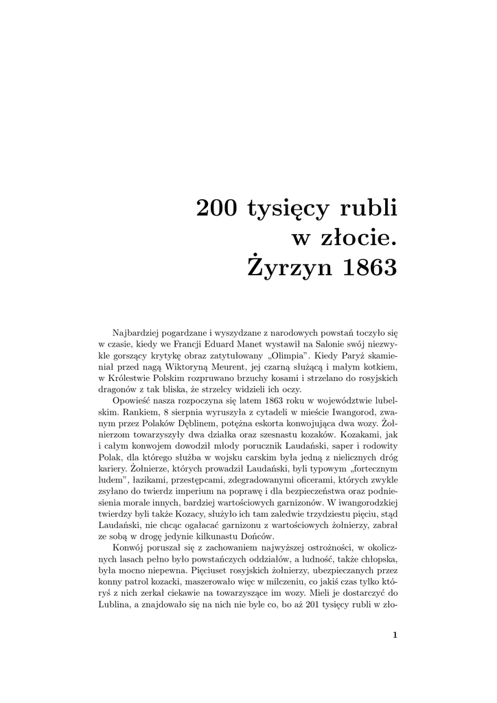 200 tysięcy rubli w złocie. Żyrzyn 1863 Najbardziej pogardzane i wyszydzane z narodowych powstań toczyło się w czasie, kiedy we Francji Eduard Manet wystawił na Salonie swój niezwykle gorszący krytykę obraz zatytułowany „Olimpia”. Kiedy Paryż skamieniał przed nagą Wiktoryną Meurent, jej czarną służącą i małym kotkiem, w Królestwie Polskim rozpruwano brzuchy kosami i strzelano do rosyjskich dragonów z tak bliska, że strzelcy widzieli ich oczy. Opowieść nasza rozpoczyna się latem 1863 roku w województwie lubelskim. Rankiem, 8 sierpnia wyruszyła z cytadeli w mieście Iwangorod, zwanym przez Polaków Dęblinem, potężna eskorta konwojująca dwa wozy. Żołnierzom towarzyszyły dwa działka oraz szesnastu kozaków. Kozakami, jak i całym konwojem dowodził młody porucznik Laudański, saper i rodowity Polak, dla którego służba w wojsku carskim była jedną z nielicznych dróg kariery. Żołnierze, których prowadził Laudański, byli typowym „fortecznym ludem”, łazikami, przestępcami, zdegradowanymi oficerami, których zwykle zsyłano do twierdz imperium na poprawę i dla bezpieczeństwa oraz podniesienia morale innych, bardziej wartościowych garnizonów. W iwangorodzkiej twierdzy byli także Kozacy, służyło ich tam zaledwie trzydziestu pięciu, stąd Laudański, nie chcąc ogałacać garnizonu z wartościowych żołnierzy, zabrał ze sobą w drogę jedynie kilkunastu Dońców. Konwój poruszał się z zachowaniem najwyższej ostrożności, w okolicznych lasach pełno było powstańczych oddziałów, a ludność, także chłopska, była mocno niepewna. Pięciuset rosyjskich żołnierzy, ubezpieczanych przez konny patrol kozacki, maszerowało więc w milczeniu, co jakiś czas tylko któryś z nich zerkał ciekawie na towarzyszące im wozy. Mieli je dostarczyć do Lublina, a znajdowało się na nich nie byle co, bo aż 201 tysięcy rubli w zło1 200 tysięcy rubli w złocie. Żyrzyn 1863 cie i asygnatach. 123 tysiące rubli wysłane przez warszawską intendenturę wojskową do Lublina, 72 tysiące rubli należące do osób prywatnych oraz 6 tysięcy rubli w papierach wartościowych. Prawdziwy skarb. O zrabowanie takiego skarbu mógł się pokusić każdy, a już na pewno każdy z powstańczych dowódców operujących w tamtym regionie. Generał Jan Michał Heidenreich używający pseudonimu Kruk był postacią szczególną. Ten słabo mówiący po polsku absolwent Petersburskiej Akademii Sztabu Generalnego wyróżniał się od samego początku powstania, jego bojowe akcje charakteryzowało dobre przygotowanie i odpowiedzialność za życie ludzi. W warunkach trudnych odnosił sukcesy, a w bardzo trudnych udawało mu się uniknąć porażek. W pierwszych dniach sierpnia 1863 roku liczący około trzech tysięcy ludzi oddział Kruka pokonał Rosjan w potyczce nieopodal wsi Chruślina w pobliżu Urzędowa. Potem powstańcy ruszyli na północ i w Opolu Lubelskim doszła ich wieść, że z twierdzy dęblińskiej wyruszy niebawem konwój transportujący do Lublina ogromną sumę pieniędzy. Heidenreich nie zawahał się i rozpoczął przygotowywanie zasadzki. Spośród podległych sobie ludzi wyznaczył 1400 najbardziej doświadczonych, najlepiej uzbrojonych i najsprawniejszych fizycznie strzelców. Prócz posiadanej prywatnej amunicji każdy z nich otrzymał dodatkowo jeszcze siedem nabojów. Heidenreich odrzucił myśl o tym, by przypuścić atak na kolumnę carskiego wojska oddziałem kosynierów. Nie sprzyjały temu naturalne warunki. Trakt wiodący do Lublina, tak samo jak dziś, otoczony był gęstym lasem, ukryci w zaroślach strzelcy mogli razić Rosjan sami nie ponosząc zbyt dużych strat, atak kosynierów na pewno zakończyłby się klęską. Zasadzka przygotowana została pomiędzy miejscowościami Żyrzyn a Jaworów, w odległości mniej więcej dwóch kilometrów od Żyrzyna. Kruk liczył się z możliwością klęski. Pozostałym w Żyrzynie żołnierzom przykazał, by widząc cofających się od Jaworowa strzelców, natychmiast formowali szyk do odwrotu. Dlaczego? Owe siedem naboi wydane każdemu uczestnikowi zasadzki było ostatnim zapasem amunicji, jaki posiadał jego oddział. Pozostali w Żyrzynie powstańcy nie mieliby po prostu czym walczyć. Plan przewidywał zablokowanie traktu niewielkim oddziałem, który zwiąże walką całą rosyjską kolumnę, w tym czasie reszta powstańców uderzy na tyły Rosjan i rozpocznie ostrzał konwoju z obydwu stron drogi. Bitwa rozpoczęła się jednak inaczej niż przewidywał to Heidenreich, oddział który miał blokować drogę, już o piątej rano został zaatakowany przez kozacki patrol. Wywiązała się strzelanina, która nie zostawiła Polakom zbyt wiele czasu na dokładne wypełnienie rozkazów dowódcy. Uderzono na Rosjan z marszu. Pierwsze natarcie ruszyło z lewej strony kolumny i z tyłu, skupieni po prawej stronie drogi Rosjanie stracili orientację i bronili się bezładnie. Heidenreich przeliczył się jednak nieco. Pogardzani forteczni strzelcy okazali się dobrymi wojakami. Wystawieni na ogień ze wszystkich stron, zmuszeni wrzaskiem dowódcy i jego rewolwerem do obrony wozów ze złotem stali, strzelali i umierali w milczeniu. Nikt się nie modlił i nie prosił o litość. 2 200 tysięcy rubli w złocie. Żyrzyn 1863 Powstańcy mogli podejść do rosyjskich strzelców na odległość trzydziestu kroków, byli bezpieczni, ukryci wśród zarośli, a mimo to nie udało im się zakończyć bitwy w pierwszej godzinie zmagań. Już po pierwszej salwie konwój wyglądał strasznie, od razu bowiem zabito wszystkie konie. W powietrzu unosił się zapach zwierzęcego potu, krwi, prochu i sosnowej żywicy wypływającej z rozdartych kulami pni. Rosjanie bronili się zza końskich trupów, odpierając kilka kolejnych natarć. Przewaga Polaków była jednak na tyle znacząca, że obrona nie miała szans powodzenia. Laudański przez pierwsze godziny walki liczył na to, że potworna kanona