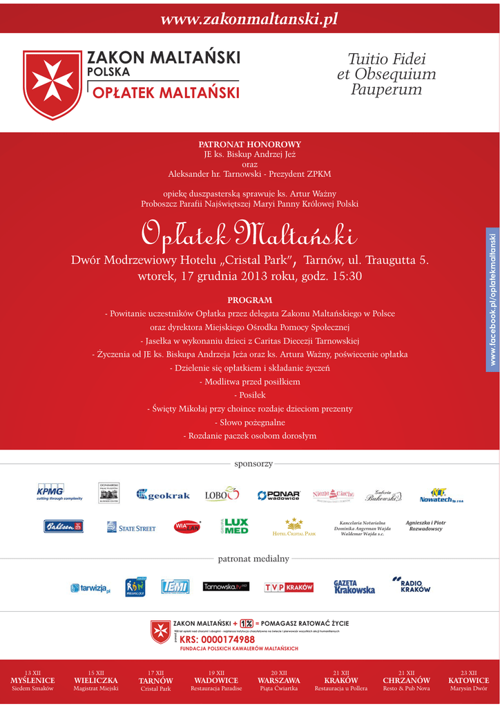 www.zakonmaltanski.pl ZAKON MALTAŃSKI Tuitio Fidei et Obsequium Pauperum POLSKA OPŁATEK MALTAŃSKI PATRONAT HONOROWY JE ks. Biskup Andrzej Jeż oraz Aleksander hr. Tarnowski - Prezydent ZPKM www.facebook.pl/oplatekmaltanski opiekę duszpasterską sprawuje ks. Artur Ważny Proboszcz Parafii Najświętszej Maryi Panny Królowej Polski , Dwór Modrzewiowy Hotelu „Cristal Park” Tarnów, ul. Traugutta 5. wtorek, 17 grudnia 2013 roku, godz. 15:30 PROGRAM - Powitanie uczestników Opłatka przez delegata Zakonu Maltańskiego w Polsce oraz dyrektora Miejskiego Ośrodka Pomocy Społecznej - Jasełka w wykonaniu dzieci z Caritas Diecezji Tarnowskiej - Życzenia od JE ks. Biskupa Andrzeja Jeża oraz ks. Artura Ważny, poświecenie opłatka - Dzielenie się opłatkiem i składanie życzeń - Modlitwa przed posiłkiem - Posiłek - Święty Mikołaj przy choince rozdaje dzieciom prezenty - Słowo pożegnalne - Rozdanie paczek osobom dorosłym sponsorzy Kancelaria Notarialna Dominika Angerman Wajda Waldemar Wajda s.c. Agnieszka i Piotr Rozwadowscy patronat medialny ZAKON MALTAŃSKI + = POMAGASZ RATOWAĆ ŻYCIE ponad 900 lat opieki nad chorymi i ubogimi - najstarsza instytucja charytatywna na świecie i pierwowzór wszystkich akcji humanitarnych FUNDACJA POLSKICH KAWALERÓW MALTAŃSKICH 13 XII 15 XII 17 XII 19 XII 20 XII 21 XII 21 XII 23 XII MYŚLENICE WIELICZKA TARNÓW WADOWICE WARSZAWA KRAKÓW CHRZANÓW KATOWICE Siedem Smaków Magistrat Miejski Cristal Park Restauracja Paradise Piąta Ćwiartka Restauracja u Pollera Resto & Pub Nova Marysin Dwór