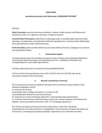 REGULAMIN sprzedaży premiowej marki Mastercook „URZĄDZAMY KUCHNIĘ” Definicje: Akcja Promocyjna: sprzedaż premiowa produktów z rabatem modeli sprzętu marki Mastercook wskazanych w pkt. 3.11 regulaminu promocji „Urządzamy Kuchnię” Uczestnik Akcji Promocyjnej: osoba fizyczna nabywająca jeden ze sprzętów bądź zestaw do użytku własnego, nie związanego z prowadzeniem działalności gospodarczej, w punkcje handlu detalicznego lub za pośrednictwem studia mebli kuchennych. Punkt Sprzedaży: punkt sprzedaży detalicznej lub studio mebli kuchennych, znajdujące się na terenie Rzeczypospolitej Polskiej. I. Postanowienia ogólne 1.1 Organizatorem Akcji czyli sprzedaży premiowej zwanej w dalszej części niniejszego Regulaminu „Promocją lub Akcją Promocyjną”, jest FagorMastercook S.A. z siedzibą we Wrocławiu przy ul.Żmigrodzkiej143, zwany dalej Organizatorem. 1.2 Akcja organizowana jest na terytorium Rzeczypospolitej Polskiej. 1.3 Czas trwania Promocji obejmuje okres od 01 .02.2012 roku do 31.05.2012 roku lub do wyczerpania zapasów Akcji Promocyjnej. II. Warunki uczestnictwa w Promocji 2.1 Promocja jest przeznaczona wyłącznie dla osób, które w momencie wzięcia udziału w Akcji spełniają następujące warunki: a) ukończyły 18 rok życia, b) posiadają miejsce stałego zamieszkania na terytorium RP , c) posiadają pełną zdolność do czynności prawnych, d) zapoznały się z treścią niniejszego regulaminu i zaakceptowały jego postanowienia, e) w okresie trwania Promocji dokonały zakupu sprzętu lub zestawu sprzętów marki Mastercook objętych promocją (modele wymienione w pkt. 3.11 niniejszego regulaminu) 2.2 W Akcji nie mogą uczestniczyć pracownicy Organizatora, właściciele, udziałowcy, współwłaściciele lub osoby zatrudnione w jakiejkolwiek formie prawnej w Punktach Sprzedaży oraz hurtowniach , prowadzących sprzedaż produktów Organizatora oraz członkowie ich rodzin. 2.3 Przez członków rodziny, o których mowa w punktach 2.2 rozumie się: wstępnych, zastępczych, rodzeństwo, małżonków, małżonków rodzeństwa, rodziców małżonków, kuzynów i osoby pozostające w stosunku przysposobienia. 2.4 Udział w Akcji i podanie związanych z udziałem w Akcji danych osobowych jest całkowicie dobrowolne. Dane osobowe uczestników przetwarzane będą na potrzeby prowadzenia Akcji oraz marketingu własnych produktów i usług Organizatora. III. Zasady Promocji 3.1 W akcji może wziąć udział każdy klient ostateczny, który kupi w terminie 01.02.2012 – 31.05.2011 wybrany produkt lub zestaw produktów marki Mastercook wskazany w pkt. 3.12 3.2 Nagrody promocyjne określone w pkt. 4.1 niniejszego regulaminu, otrzyma uczestnik który kupi jeden ze sprzętów lub zestaw sprzętów objęty promocją w punkcje sprzedaży i prześle listem poleconym: - wypełniony i podpisany własnoręcznie i czytelnie kupon promocyjny wycięty z ulotki lub wydrukowany ze strony internetowej www.mastercook.pl - kopię karty / kart gwarancyjnej z widocznym modelem sprzętu i numerem fabrycznym, -kopię faktury VAT lub kopię paragonu potwierdzającego zakup produktów objętych promocją na adres: FagorMastercook ul. Żmigrodzka 143, 51-130 Wrocław z dopiskiem „Urządzamy Kuchnię” 3.3 Termin nadsyłania kuponów upływa z dniem 15.06.2012 r. (decyduje data stempla pocztowego ). 3.4 Prawidłowo wypełniony kupon powinien zawierać dane osobowe uczestnika Akcji Promocyjnej w postaci imienia i nazwiska , daty urodzenia , adresu zamieszkania wraz z kodem pocztowym, numeru telefonu kontaktowego, adresu email i własnoręcznego podpisu. Podanie tych danych jest jednoznaczne z akceptacją warunków Promocji określonych w niniejszym regulaminie. Wraz z przesłaniem wymaganych dokumentów Uczestnik wyraża zgodę na przetwarzanie danych osobowych przez Organizatora Akcji. Dane będą przetwarzane zgodnie z ustawą z dnia 29 sierpnia 1997r. o ochronie danych osobowych na potrzeby prowadzenia Akcji oraz marketingu własnych produktów i usług Organizatora. Do kuponu musi zostać dołączona kopia dowodu (lub dowodów)zakupu i karty gwarancyjnej z widocznym numerem fabrycznym i modelem sprzętu (jeżeli jest to zestaw kilku sprzętów muszą to być kopie wszystkich kart gwarancyjnych). 3.5Kupony wraz z kopią paragonu lub faktury VAT z zakupem urządzenia datowanym przed 1 lutego i po 31 maja 2012 nie będą brane pod uwagę przy przydzielaniu Nagrody Promocyjnej. 3.6 Akcja obejmuje wyłącznie zakupy dokonane w punktach sprzedaży w tym zakupy przez Internet. 3.7 Organizator dokona weryfikacji zgłoszeń nadesłanych przez Uczestników pod kątem ich prawdziwości oraz kompletności. Organizator zastrzega sobie prawo kontaktu z Uczestnikiem celem weryfikacji lub uzupełnienia danych zawartych w zgłoszeniu . Organizatorowi przysługuje prawo żądania okazania oryginału paragonu lub faktury VAT potwierdzającej zakup sprzętu marki Mastercook oraz oryginału karty/kart gwarancyjnej. 3.8 Nagrody wysyłane będą kurierem do uczestnika akcji po otrzymaniu kuponu z wymaganymi dokumentami w terminie do 21 dni od zarejestrowania poprawnego zgłoszenia maksymalnie do 15.08.2012. termin 21 dni nie dotyczy zestawów garnków Viena Plus i zestawów naczyń żaroodpornych Termisil. W przypadku nieodebrania przez Uczestnika w terminie określonym przez operatora kurierskiego przesyłki zawierającej Nagrodę, Uczestnik traci uprawnienie do jej otrzymania. Za nieodebranie przesyłki w terminie uważa się jej zwrot Organizatorowi przez firmę kurierską. 3.8 W Akcji Promocyjnej nie będą brały udziału zgłoszenia wypełnione niekompletnie, nieprawidłowo, niezawierające wszystkich danych osobowych, numeru telefonu lub niepodpisane własnoręcznie przez uczestnika, a także nie będą przyjmowane zgłoszenia zawierające dane nie prawdziwe lub dane więcej niż jednej osoby. 3.9 Organizator nie ponosi odpowiedzialności za zgłoszenia zniszczone, opóźnione lub niedo
