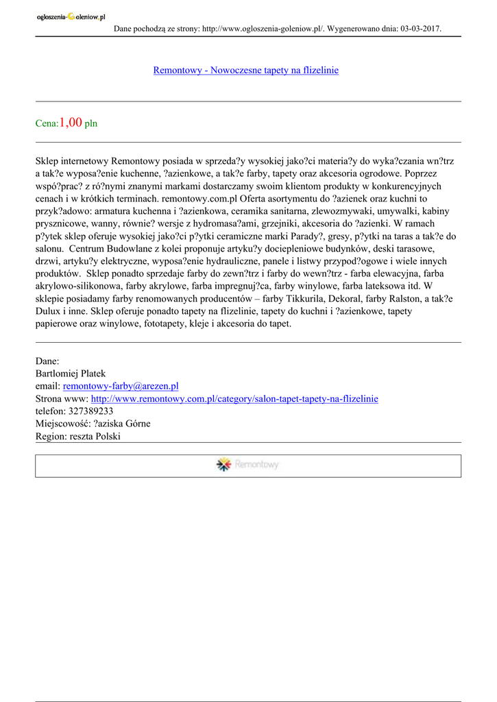 Dane pochodzą ze strony: http://www.ogloszenia-goleniow.pl/. Wygenerowano dnia: 03-03-2017. Remontowy - Nowoczesne tapety na flizelinie Cena:1,00 pln Sklep internetowy Remontowy posiada w sprzeda?y wysokiej jako?ci materia?y do wyka?czania wn?trz a tak?e wyposa?enie kuchenne, ?azienkowe, a tak?e farby, tapety oraz akcesoria ogrodowe. Poprzez wspó?prac? z ró?nymi znanymi markami dostarczamy swoim klientom produkty w konkurencyjnych cenach i w krótkich terminach. remontowy.com.pl Oferta asortymentu do ?azienek oraz kuchni to przyk?adowo: armatura kuchenna i ?azienkowa, ceramika sanitarna, zlewozmywaki, umywalki, kabiny prysznicowe, wanny, równie? wersje z hydromasa?ami, grzejniki, akcesoria do ?azienki. W ramach p?ytek sklep oferuje wysokiej jako?ci p?ytki ceramiczne marki Parady?, gresy, p?ytki na taras a tak?e do salonu. Centrum Budowlane z kolei proponuje artyku?y dociepleniowe budynków, deski tarasowe, drzwi, artyku?y elektryczne, wyposa?enie hydrauliczne, panele i listwy przypod?ogowe i wiele innych produktów. Sklep ponadto sprzedaje farby do zewn?trz i farby do wewn?trz - farba elewacyjna, farba akrylowo-silikonowa, farby akrylowe, farba impregnuj?ca, farby winylowe, farba lateksowa itd. W sklepie posiadamy farby renomowanych producentów – farby Tikkurila, Dekoral, farby Ralston, a tak?e Dulux i inne. Sklep oferuje ponadto tapety na flizelinie, tapety do kuchni i ?azienkowe, tapety papierowe oraz winylowe, fototapety, kleje i akcesoria do tapet. Dane: Bartlomiej Platek email: [email protected] Strona www: http://www.remontowy.com.pl/category/salon-tapet-tapety-na-flizelinie telefon: 327389233 Miejscowość: ?aziska Górne Region: reszta Polski