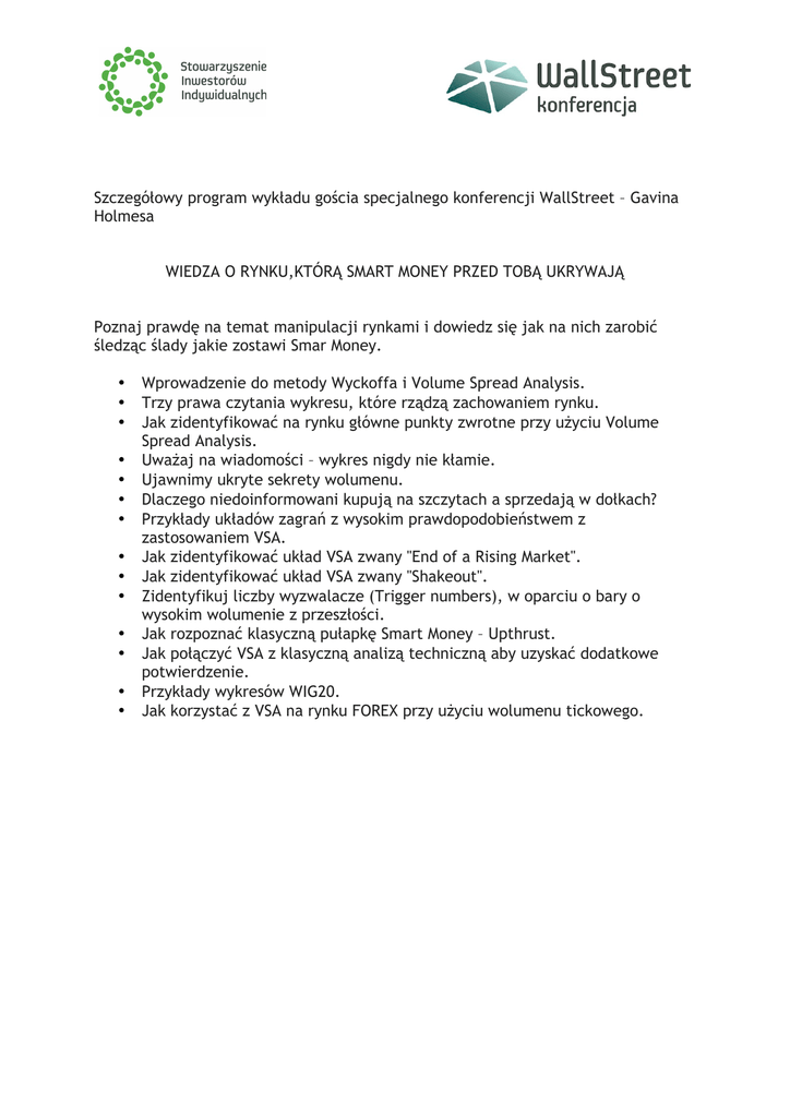 Szczegółowy program wykładu gościa specjalnego konferencji WallStreet – Gavina Holmesa WIEDZA O RYNKU,KTÓRĄ SMART MONEY PRZED TOBĄ UKRYWAJĄ Poznaj prawdę na temat manipulacji rynkami i dowiedz się jak na nich zarobić śledząc ślady jakie zostawi Smar Money. • • • • • • • • • • • • • • Wprowadzenie do metody Wyckoffa i Volume Spread Analysis. Trzy prawa czytania wykresu, które rządzą zachowaniem rynku. Jak zidentyfikować na rynku główne punkty zwrotne przy użyciu Volume Spread Analysis. Uważaj na wiadomości – wykres nigdy nie kłamie. Ujawnimy ukryte sekrety wolumenu. Dlaczego niedoinformowani kupują na szczytach a sprzedają w dołkach? Przykłady układów zagrań z wysokim prawdopodobieństwem z zastosowaniem VSA. Jak zidentyfikować układ VSA zwany "End of a Rising Market". Jak zidentyfikować układ VSA zwany "Shakeout". Zidentyfikuj liczby wyzwalacze (Trigger numbers), w oparciu o bary o wysokim wolumenie z przeszłości. Jak rozpoznać klasyczną pułapkę Smart Money – Upthrust. Jak połączyć VSA z klasyczną analizą techniczną aby uzyskać dodatkowe potwierdzenie. Przykłady wykresów WIG20. Jak korzystać z VSA na rynku FOREX przy użyciu wolumenu tickowego.