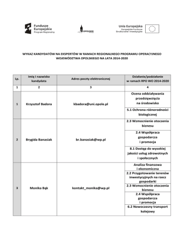 WYKAZ KANDYDATÓW NA EKSPERTÓW W RAMACH REGIONALNEGO PROGRAMU OPERACYJNEGO WOJEWÓDZTWA OPOLSKIEGO NA LATA 2014-2020 Lp. Imię i nazwisko kandydata Adres poczty elektronicznej Działanie/podziałanie w ramach RPO WO 2014-2020 1 2 3 4 [email protected] Ocena oddziaływania przedsięwzięcia na środowisko 1 Krzysztof Badora 5.1 Ochrona różnorodności biologicznej 2.3 Wzmocnienie otoczenia biznesu 2 Brygida Banasiak [email protected] 2.4 Współpraca gospodarcza i promocja 8.1 Dostęp do wysokiej jakości usług zdrowotnych i społecznych 3 Monika Bąk [email protected] Analiza finansowa i ekonomiczna 2.2 Przygotowanie terenów inwestycyjnych na rzecz gospodarki 2.3 Wzmocnienie otoczenia biznesu 2.4 Współpraca gospodarcza i promocja 6.2 Nowoczesny transport kolejowy Lp. Imię i nazwisko kandydata Adres poczty elektronicznej Działanie/podziałanie w ramach RPO WO 2014-2020 8.1 Dostęp do wysokiej jakości usług zdrowotnych i społecznych 8.2 Włączenie społeczne 9.1.2 Wsparcie kształcenia ogólnego w Aglomeracji Opolskiej 9.1.4 Wsparcie edukacji przedszkolnej w Aglomeracji Opolskiej 9.2.2 Wsparcie kształcenia zawodowego w Aglomeracji Opolskiej 9.3 Wsparcie kształcenia ustawicznego Analiza finansowa i ekonomiczna 4 Piotr Bębenek [email protected] 2.2 Przygotowanie terenów inwestycyjnych na rzecz gospodarki 2.3 Wzmocnienie otoczenia biznesu 2.4 Współpraca gospodarcza i promocja Analiza finansowa i ekonomiczna 5 Cecylia Brylka [email protected] 2.2 Przygotowanie terenów inwestycyjnych na rzecz gospodarki 2.3 Wzmocnienie otoczenia biznesu 2.4 Współpraca gospodarcza Lp. Imię i nazwisko kandydata Adres poczty elektronicznej Działanie/podziałanie w ramach RPO WO 2014-2020 i promocja Analiza finansowa i ekonomiczna 6 7 Maria Bucka Irena ZiomekBurzawa [email protected] [email protected] 2.4 Współpraca gospodarcza i promocja 2.4 Współpraca gospodarcza i promocja 8.1 Dostęp do wysokiej jakości usług zdrowotnych i społecznych 2.2 Przygotowanie terenów inwestycyjnych na rzecz gospodarki 2.3 Wzmocnienie otoczenia biznesu 2.4 Współpraca gospodarcza i promocja 8 Tomasz Cisek [email protected] 9.1.2 Wsparcie kształcenia ogólnego w Aglomeracji Opolskiej 9.1.4 Wsparcie edukacji przedszkolnej w Aglomeracji Opolskiej 9.2.2 Wsparcie kształcenia zawodowego w Aglomeracji Opolskiej 9.3 Wsparcie kształcenia ustawicznego 9 Rafał Piotr Ciupa [email protected] 9.1.2 Wsparcie kształcenia ogólnego w Aglomeracji Opolskiej 9.1.4 Wsparcie edukacji Lp. Imię i nazwisko kandydata Adres poczty elektronicznej Działanie/podziałanie w ramach RPO WO 2014-2020 przedszkolnej w Aglomeracji Opolskiej 9.2.2 Wsparcie kształcenia zawodowego w Aglomeracji Opolskiej 9.3 Wsparcie kształcenia ustawicznego 10 Irena Dąbrowska [email protected] Analiza finansowa i ekonomiczna 8.2 Włączenie społeczne 9.1.2 Wsparcie kształcenia ogólnego w Aglomeracji Opolskiej 11 Arkadiusz Dąbrowski [email protected] 9.1.4 Wsparcie edukacji przedszkolnej w Aglomeracji Opolskiej 9.2.2 Wsparcie kształcenia zawodowego w Aglomeracji Opolskiej 9.3 Wsparcie kształcenia ustawicznego Analiza finansowa i ekonomiczna 2.2 Przygotowanie terenów inwestycyjnych na rzecz gospodarki 12 Marek Derski [email protected] 2.3 Wzmocnienie otoczenia biznesu 8.2 Włączenie społeczne 9.3 Wsparcie kształcenia ustawicznego 13 Łukasz Dymek [email protected] 2.2 Przygotowanie terenów inwestycyjnych na rzecz gospodarki Lp. Imię i nazwisko kandydata Adres poczty elektronicznej Działanie/podziałanie w ramach RPO WO 2014-2020 2.3 Wzmocnienie otoczenia biznesu 2.4 Współpraca gospodarcza i promocja 14 Andrzej Gabrych [email protected] 8.2 Włączenie społeczne 2.2 Przygotowanie terenów inwestycyjnych na rzecz gospodarki 15 Tomasz Ganczarek [email protected] 2.3 Wzmocnienie otoczenia biznesu 2.4 Współpraca gospodarcza i promocja 16 Roman Grzebel [email protected] Analiza finansowa i ekonomiczna 17 Grzegorz Hebda [email protected] 5.1 Ochrona różnorodności biologicznej 18 Jolanta JafernikHubert [email protected] Analiza finansowa i ekonomiczna 19 Karolina Idryjan [email protected] 8.1 Dostęp do wysokiej jakości usług zdrowotnych i społecznych 8.2 Włączenie społeczne 20 Alicja Janik [email protected] 2.4 Współpraca gospodarcza i promocja 21 Wojciech Jankowski [email protected] Analiza finansowa i ekonomiczna 22 Andrzej Jaworowicz [email protected] 2.2 Przygotowanie terenów inwestycyjnych na rzecz gospodarki 2.3 Wzmocnienie otoczenia Lp. Imię i nazwisko kandydata Adres poczty elektronicznej Działanie/podziałanie w ramach RPO WO 2014-2020 biznesu 2.4 Współpraca gospodarcza i promocja 2.3 Wzmocnienie otoczenia biznesu 23 Piotr Jurkowski [email protected] 2.4 Współpraca gospodarcza i promocja 2.3 Wzmocnienie otoczenia biznesu 24 Dariusz Kajstura [email protected] 25 Paweł Knop [email protected] 2.3 Wzmocnienie otoczenia biznesu 26 Krzysztof Kociuga [email protected] Analiza finansowa i ekonomiczna 2.4 Współpraca gospodarcza i promocja Analiza finansowa i ekonomiczna 2.3 Wzmocnienie otoczenia biznesu 2.4 Współpraca gospodarcza i promocja 27 Damian Kocot [email protected] 9.1.2 Wsparcie kształcenia ogólnego w Aglomeracji Opolskiej 9.1.4 Wsparcie edukacji przedszkolnej w Aglomeracji Opolskiej 9.2.2 Wsparcie kształcenia zawodowego w Aglomeracji Opolskiej Lp. Imię i nazwisko kandydata Adres poczty elektronicznej Działanie/podziałanie w ramach RPO WO 2014-2020 9.3 Wsparcie kształcenia ustawicznego 9.1.2 Wsparcie kształcenia ogólnego w Aglomeracji Opolskiej 28 Ewa Korybska [email protected] 9.1.4 Wsparcie edukacji przedszkolnej w Aglomeracji Opolskiej 9.2.2 Wsparcie kształcenia zawodowego w Aglomeracji Opolskiej 9.3 Wsparcie kształcenia ustawicznego 29 Artur Kotara [email protected] 6.1 Infrastruktura drogowa 2.3 Wzmocnienie otoczenia biznesu 30 Rafał Koszyk [email protected] 2.4 Współpraca gospodarcza i promocja 9.1.2 Wsparcie kształcenia ogólnego w Aglomeracji Opolskiej 31 Przemysław Krawczyk [email pr