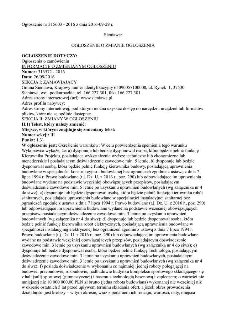 Ogłoszenie nr 315603 - 2016 z dnia 2016-09-29 r. Sieniawa: OGŁOSZENIE O ZMIANIE OGŁOSZENIA OGŁOSZENIE DOTYCZY: Ogłoszenia o zamówieniu INFORMACJE O ZMIENIANYM OGŁOSZENIU Numer: 313572 - 2016 Data: 26/09/2016 SEKCJA I: ZAMAWIAJĄCY Gmina Sieniawa, Krajowy numer identyfikacyjny 65090057100000, ul. Rynek 1, 37530 Sieniawa, woj. podkarpackie, tel. 166 227 301, faks 166 227 301. Adres strony internetowej (url): www.sieniawa.pl Adres profilu nabywcy: Adres strony internetowej, pod którym można uzyskać dostęp do narzędzi i urządzeń lub formatów plików, które nie są ogólnie dostępne: SEKCJA II: ZMIANY W OGŁOSZENIU II.1) Tekst, który należy zmienić: Miejsce, w którym znajduje się zmieniany tekst: Numer sekcji: III Punkt: 1.3) W ogłoszeniu jest: Określenie warunków: W celu potwierdzenia spełnienia tego warunku Wykonawca wykaże, że: a) dysponuje lub będzie dysponował osobą, która będzie pełnić funkcję Kierownika Projektu, posiadającą wykształcenie wyższe techniczne lub ekonomiczne lub menedżerskie i posiadającym doświadczenie zawodowe min. 5 letnie, b) dysponuje lub będzie dysponował osobą, która będzie pełnić funkcję kierownika budowy, posiadającą uprawnienia budowlane w specjalności konstrukcyjno - budowlanej bez ograniczeń zgodnie z ustawą z dnia 7 lipca 1994 r. Prawo budowlane (t.j. Dz. U. z 2016 r., poz. 290) lub odpowiadające im uprawnienia budowlane wydane na podstawie wcześniej obowiązujących przepisów, posiadającym doświadczenie zawodowe min. 5 letnie po uzyskaniu uprawnień budowlanych (wg załącznika nr 4 do siwz); c) dysponuje lub będzie dysponował osobą, która będzie pełnić funkcję kierownika robót sanitarnych, posiadającą uprawnienia budowlane w specjalności instalacyjnej sanitarnej bez ograniczeń zgodnie z ustawą z dnia 7 lipca 1994 r. Prawo budowlane (t.j. Dz. U. z 2016 r., poz. 290) lub odpowiadające im uprawnienia budowlane wydane na podstawie wcześniej obowiązujących przepisów, posiadającym doświadczenie zawodowe min. 3 letnie po uzyskaniu uprawnień budowlanych (wg załącznika nr 4 do siwz); d) dysponuje lub będzie dysponował osobą, która będzie pełnić funkcję kierownika robót elektrycznych, posiadającą uprawnienia budowlane w specjalności instalacyjnej elektrycznej bez ograniczeń zgodnie z ustawą z dnia 7 lipca 1994 r. Prawo budowlane (t.j. Dz. U. z 2016 r., poz. 290) lub odpowiadające im uprawnienia budowlane wydane na podstawie wcześniej obowiązujących przepisów, posiadającym doświadczenie zawodowe min. 3 letnie po uzyskaniu uprawnień budowlanych (wg załącznika nr 4 do siwz); e) dysponuje lub będzie dysponował osobą, która będzie pełnić funkcję Technologa, posiadającym doświadczenie zawodowe min. 3 letnie po uzyskaniu uprawnień budowlanych, posiadającym doświadczenie zawodowe min. 3 letnie po uzyskaniu uprawnień budowlanych (wg załącznika nr 4 do siwz); f) posiada doświadczenie w wykonaniu co najmniej: jednej roboty polegającej na budowie, przebudowie, rozbudowie, nadbudowie budynku kompleksu sportowego składającego się z hali (sali) sportowej (gimnastycznej) i basenu z technologią basenową i zapleczem; o wartości nie mniejszej niż 10 000 000,00 PLN zł brutto (jedna robota budowlana) wykonanej nie wcześniej niż w okresie ostatnich 5 lat przed upływem terminu składania ofert, a jeżeli okres prowadzenia działalności jest krótszy – w tym okresie, wraz z podaniem ich rodzaju, wartości, daty, miejsca wykonania i podmiotów, na rzecz których roboty te zostały wykonane, z załączeniem dowodów określających czy te roboty budowlane zostały wykonane należycie, w szczególności informacji o tym czy roboty zostały wykonane zgodnie z przepisami prawa budowlanego i prawidłowo ukończone, przy czym dowodami, o których mowa, są referencje bądź inne dokumenty wystawione przez podmiot, na rzecz którego roboty budowlane były wykonywane, a jeżeli z uzasadnionej przyczyny o obiektywnym charakterze wykonawca nie jest w stanie uzyskać tych dokumentów – inne dokumenty; (wg załącznika nr 3 do siwz)dwóch robót polegających na budowie, przebudowie, rozbudowie, nadbudowie budynku hali z basenem, technologią basenową i zapleczem o wartości nie mniejszej niż 8 000 000,00 PLN brutto (jedna robota budowlana)dwóch robót polegającej na budowie, przebudowie, rozbudowie, nadbudowie budynku hali gimnastycznej/sportowej z zapleczem, o wartości nie mniejszej niż 8 000 000,00 PLN brutto (jedna robota budowlana) W ogłoszeniu powinno być: Określenie warunków: W celu potwierdzenia spełnienia tego warunku Wykonawca wykaże, że: a) dysponuje lub będzie dysponował osobą, która będzie pełnić funkcję Kierownika Projektu, posiadającą wykształcenie wyższe techniczne lub ekonomiczne lub menedżerskie i posiadającym doświadczenie zawodowe min. 3 letnie w zarządzaniou kontraktami (wg załącznika nr 4 do siwz); b) dysponuje lub będzie dysponował osobą, która będzie pełnić funkcję kierownika budowy, posiadającą uprawnienia budowlane w specjalności konstrukcyjno budowlanej bez ograniczeń zgodnie z ustawą z dnia 7 lipca 1994 r. Prawo budowlane (t.j. Dz. U. z 2016 r., poz. 290) lub odpowiadające im uprawnienia budowlane wydane na podstawie wcześniej obowiązujących przepisów, posiadającym doświadczenie zawodowe min. 5 letnie po uzyskaniu uprawnień budowlanych (wg załącznika nr 4 do siwz); c) dysponuje lub będzie dysponował osobą, która będzie pełnić funkcję kierownika robót sanitarnych, posiadającą uprawnienia budowlane w specjalności instalacyjnej sanitarnej bez ograniczeń zgodnie z ustawą z dnia 7 lipca 1994 r. Prawo budowlane (t.j. Dz. U. z 2016 r., poz. 290) lub odpowiadające im uprawnienia budowlane wydane na podstawie wcześniej obowiązujących przepisów, posiadającym doświadczenie zawodowe min. 3 letnie po uzyskaniu uprawnień budowlanych (wg załącznika nr 4 do siwz); d) dysponu