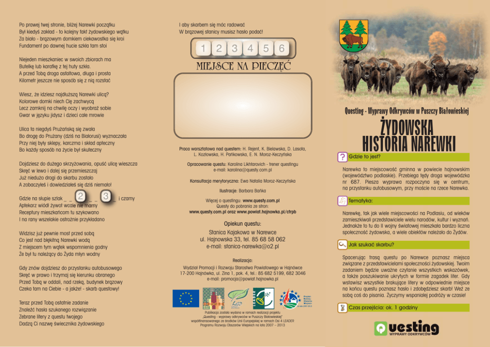 Po prawej twej stronie, bli˝ej Narewki poczàtku Był kiedyÊ zakład - to kolejny fakt ˝ydowskiego wàtku Za biało - bràzowym domkiem ciekawostka si´ kroi Fundament po dawnej hucie szkła tam stoi Niejeden mieszkaniec w swoich zbiorach ma Butelk´ lub karafk´ z tej huty szkła. A przed Tobà droga asfaltowa, długa i prosta Kilometr jeszcze nie sposób si´ z nià rozstaç I aby skarbem si´ móc radowaç W bràzowej stanicy musisz hasło podaç! MIEJSCE NA PIECZ¢å Wiesz, ˝e idziesz najdłu˝szà Narewki ulicà? Kolorowe domki niech Ci´ zachwycà Lecz zamknij na chwil´ oczy i wyobraê sobie Gwar w j´zyku jidysz i dzieci całe mrowie Questing - Wyprawy Odkrywców w Puszczy Białowieskiej Ulica ta niegdyÊ Pru˝aƒskà si´ zwała Bo drog´ do Pru˝any (dziÊ na Białorusi) wyznaczała Przy niej były sklepy, karczma i skład apteczny Bo ka˝dy sposób na ˝ycie był skuteczny Dojdziesz do du˝ego skrzy˝owania, opuÊç ulic´ wieszcza Skr´ç w lewo i dalej si´ przemieszczaj Ju˝ niedu˝o drogi do skarbu zostało A zobaczyłeÊ i dowiedziałeÊ si´ dziÊ niemało! Praca warsztatowa nad questem: H. Rejent, K. Bielawska, D. Lasota, L. Kozłowska, H. Paƒkowska, E. N. Moroz-Keczyƒska Opracowanie questu: Karolina Likhtarovich - trener questingu e-mail: [email protected] Konsultacja merytoryczna: Ewa Natalia Moroz-Keczyƒska Ilustracje: Barbara Baƒka Gdzie na słupie szlak _ _ _ _ Aptekarz wiódł ˝ywot wcale nie marny Receptury mieszkaƒcom tu szykowano I na rany wszelakie ostro˝nie przykładano _ i czarny Widzisz ju˝ pewnie most przed sobà Co jest nad bł´kitnà Narewki wodà Z miejscem tym wàtek wspomnienia godny ˚e był tu nale˝àcy do ˚yda młyn wodny Wi´cej o questingu: www.questy.com.pl Questy do pobrania ze stron: www.questy.com.pl oraz www.powiat.hajnowka.pl/ctrpb Opiekun questu: Stanica Kajakowa w Narewce ul. Hajnowska 33, tel. 85 68 58 062 e-mail: [email protected] Realizacja: Gdy znów dojdziesz do przystanku autobusowego Skr´ç w prawo i trzymaj si´ kierunku obranego Przed Tobà w oddali, nad rzekà, budynek bràzowy Czeka tam na Ciebie - a jak˝e! - skarb questowy! Teraz przed Tobà ostatnie zadanie Znaleêç hasła szukanego rozwiàzanie Zebrane litery z questu twojego Dadzà Ci nazw´ Êwiecznika ˝ydowskiego Wydział Promocji i Rozwoju Starostwa Powiatowego w Hajnówce 17-200 Hajnówka, ul. Zina 1, pok. 4, tel.: 85 682 5199, 682 3046 e-mail: [email protected] ˚YDOWSKA HISTORIA NAREWKI Gdzie to jest? Narewka to miejscowoÊç gminna w powiecie hajnowskim (województwo podlaskie). Przebiega t´dy droga wojewódzka nr 687. Piesza wyprawa rozpoczyna si´ w centrum, na przystanku autobusowym, przy moÊcie na rzece Narewka. Tematyka: Narewk´, tak jak wiele miejscowoÊci na Podlasiu, od wieków zamieszkiwali przedstawiciele wielu narodów, kultur i wyznaƒ. Jednak˝e to tu do II wojny Êwiatowej mieszkała bardzo liczna społecznoÊç ˝ydowska, a wiele obiektów nale˝ało do ˚ydów. Jak szukaç skarbu? Spacerujàc trasà questu po Narewce poznasz miejsca zwiàzane z przedstawicielami społecznoÊci ˝ydowskiej. Twoim zadaniem b´dzie uwa˝ne czytanie wszystkich wskazówek, a tak˝e poszukiwanie ukrytych w formie zagadek liter. Gdy wstawisz wszystkie brakujàce litery w odpowiednie miejsce na koƒcu questu poznasz hasło i zdob´dziesz skarb! Weê ze sobà coÊ do pisania. ˚yczymy wspaniałej podró˝y w czasie! Czas przejÊcia: ok. 1 godziny Publikacja została wydana w ramach realizacji projektu „Questing - wyprawy odkrywców w Puszczy Białowieskiej” współfinansowanego ze Êrodków Unii Europejskiej w ramach Osi 4 LEADER Programu Rozwoju Obszarów Wiejskich na lata 2007 – 2013 Co informujà, jak daleko stàd do TrzeÊcianki O innej miejscowoÊci te˝ nie brak wzmianki A liczba kilometrów do „owocowej” wioski Miejsce w haÊle „O” litery wska˝e - wpisz jà bez ˝adnej troski! S TA R T Zanim ruszysz dalej, odszukaj na tablicach jezioro Na pewno je znajdziesz, bo nie ma ich tu sporo Warto tam pojechaç, mamy o nim quest I kolejna litera do hasła te˝ tutaj jest Gdzie? W jego nazwie, to ostatnia samogłoska Wpisz jà w ostatnie miejsce w haÊle - prawda ˝e drobnostka? Witaj Przybyszu drogi w naszej miejscowoÊci Która zawsze serdecznie przyjmuje swoich goÊci Zobaczysz dziÊ Narewk´ w całej swej krasie Zapraszamy Ci´ na prawdziwà podró˝ w czasie Czas ruszaç dalej, skr´ç w lewà stron´ I pod górk´ prowadê nogi jeszcze nie zm´czone Spieszyç si´ nie musisz, skr´ç w Ogrodowà wolno Co niegdyÊ, przed wojnà, była ulicà Szkolnà Narewka jest - przyznasz - pi´knie poło˝ona Łàkami i lasami od Êwiata oddzielona ˚yjemy tutaj w zgodzie z matkà naturà Mo˝emy si´ te˝ pochwaliç bogatà kulturà Skàd ta nazwa? Odpowiedê jest jedna: Była tu ˝ydowska szkoła modlitewna Zało˝ona tu˝ obok miejscowej synagogi Tam, gdzie zaraz zaprowadzà Ci´ nogi Ale i lokalna historia jest naprawd´ ró˝norodna Ciekawa i ze wszech miar uwagi godna Dlatego dzisiaj opowiedzieç Ci chcemy O dawnych mieszkaƒcach narewkowskiej ziemi Gdy znajdziesz si´ przy asfaltowej ulicy Co do Szkolnej dochodzi po twojej lewicy Naprzeciw niej synagoga właÊnie stała ˚ydowska społecznoÊç na modlitwach tu si´ spotkała Na przestrzeni wieków, przez kilkaset lat ˚yli tu obok siebie ró˝ni ludzie - jak z bratem brat I choç innego mogli byç wyznania czy pochodzenia Wszyscy byli przyzwyczajeni do takiego „współistnienia” W ulic´ t´ nie skr´caj, idê dalej prosto Na piaszczystej drodze skr´ç w lewo ostro Zobaczysz przed sobà budynek bielony Zielonymi okiennicami ładnie ozdobiony Niewielka Narewka tym si´ wyró˝niała ˚e liczna społecznoÊç ˝ydowska tutaj mieszkała I od pierwszej połowy wieku dziewi´tnastego ˚yda mo˝na było spotkaç tu niejednego Pora ju˝ wykonaç kolejne zadanie B´dzie to naprawd´ łatwe odejmowanie Od liczby zielonych okien na białej Êcianie odejmij „2” A wynik miejsce „R” litery w ha