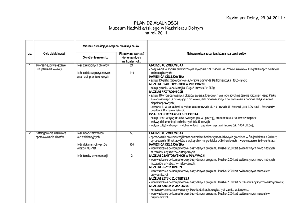 Kazimierz Dolny, 29.04.2011 r. PLAN DZIAŁALNOŚCI Muzeum