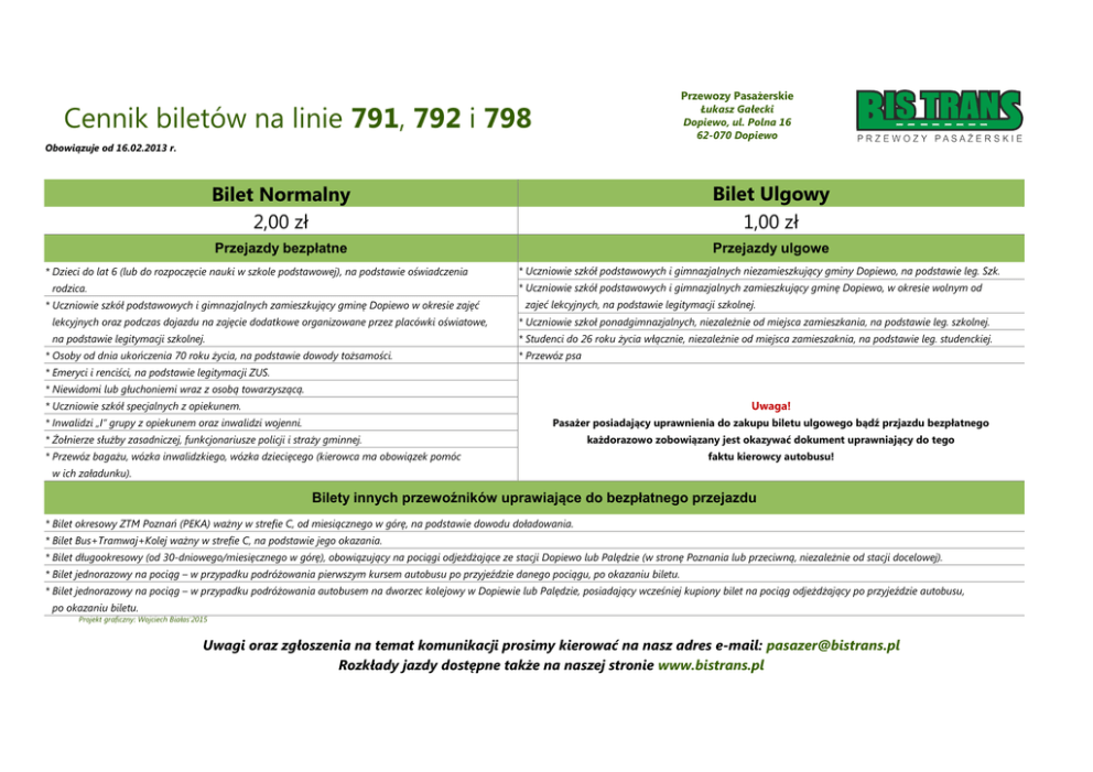 Przewozy Pasażerskie Cennik biletów na linie 791, 792 i 798 Łukasz Gałecki Dopiewo, ul. Polna 16 62-070 Dopiewo Obowiązuje od 16.02.2013 r. Bilet Normalny 2,00 zł Bilet Ulgowy 1,00 zł Przejazdy bezpłatne Przejazdy ulgowe * Dzieci do lat 6 (lub do rozpoczęcie nauki w szkole podstawowej), na podstawie oświadczenia * Uczniowie szkół podstawowych i gimnazjalnych niezamieszkujący gminy Dopiewo, na podstawie leg. Szk. * rodzica. * Uczniowie szkół podstawowych i gimnazjalnych zamieszkujący gminę Dopiewo, w okresie wolnym od * Uczniowie szkół podstawowych i gimnazjalnych zamieszkujący gminę Dopiewo w okresie zajęć * zajeć lekcyjnych, na podstawie legitymacji szkolnej. * lekcyjnych oraz podczas dojazdu na zajęcie dodatkowe organizowane przez placówki oświatowe, * Uczniowie szkoł ponadgimnazjalnych, niezależnie od miejsca zamieszkania, na podstawie leg. szkolnej. * na podstawie legitymacji szkolnej. * Studenci do 26 roku życia włącznie, niezależnie od miejsca zamieszaknia, na podstawie leg. studenckiej. * Osoby od dnia ukończenia 70 roku życia, na podstawie dowody tożsamości. * Przewóz psa * Emeryci i renciści, na podstawie legitymacji ZUS. * Niewidomi lub głuchoniemi wraz z osobą towarzyszącą. Uwaga! * Uczniowie szkół specjalnych z opiekunem. * Inwalidzi „I” grupy z opiekunem oraz inwalidzi wojenni. Pasażer posiadający uprawnienia do zakupu biletu ulgowego bądź przjazdu bezpłatnego * Żołnierze służby zasadniczej, funkcjonariusze policji i straży gminnej. każdorazowo zobowiązany jest okazywać dokument uprawniający do tego * Przewóz bagażu, wózka inwalidzkiego, wózka dziecięcego (kierowca ma obowiązek pomóc faktu kierowcy autobusu! * w ich załadunku). Bilety innych przewoźników uprawiające do bezpłatnego przejazdu * Bilet okresowy ZTM Poznań (PEKA) ważny w strefie C, od miesiącznego w górę, na podstawie dowodu doładowania. * Bilet Bus+Tramwaj+Kolej ważny w strefie C, na podstawie jego okazania. * Bilet długookresowy (od 30-dniowego/miesięcznego w górę), obowiązujący na pociągi odjeżdżające ze stacji Dopiewo lub Palędzie (w stronę Poznania lub przeciwną, niezależnie od stacji docelowej). * Bilet jednorazowy na pociąg – w przypadku podróżowania pierwszym kursem autobusu po przyjeździe danego pociągu, po okazaniu biletu. * Bilet jednorazowy na pociąg – w przypadku podróżowania autobusem na dworzec kolejowy w Dopiewie lub Palędzie, posiadający wcześniej kupiony bilet na pociąg odjeżdżający po przyjeździe autobusu, * po okazaniu biletu. Projekt graficzny: Wojciech Białas'2015 Uwagi oraz zgłoszenia na temat komunikacji prosimy kierować na nasz adres e-mail: [email protected] Rozkłady jazdy dostępne także na naszej stronie www.bistrans.pl