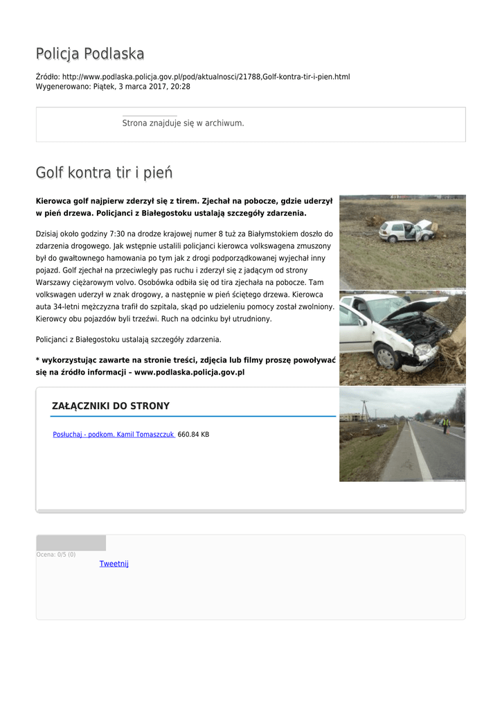 Policja Podlaska Źródło: http://www.podlaska.policja.gov.pl/pod/aktualnosci/21788,Golf-kontra-tir-i-pien.html Wygenerowano: Piątek, 3 marca 2017, 20:28 Strona znajduje się w archiwum. Golf kontra tir i pień Kierowca golf najpierw zderzył się z tirem. Zjechał na pobocze, gdzie uderzył w pień drzewa. Policjanci z Białegostoku ustalają szczegóły zdarzenia. Dzisiaj około godziny 7:30 na drodze krajowej numer 8 tuż za Białymstokiem doszło do zdarzenia drogowego. Jak wstępnie ustalili policjanci kierowca volkswagena zmuszony był do gwałtownego hamowania po tym jak z drogi podporządkowanej wyjechał inny pojazd. Golf zjechał na przeciwległy pas ruchu i zderzył się z jadącym od strony Warszawy ciężarowym volvo. Osobówka odbiła się od tira zjechała na pobocze. Tam volkswagen uderzył w znak drogowy, a następnie w pień ściętego drzewa. Kierowca auta 34-letni mężczyzna trafił do szpitala, skąd po udzieleniu pomocy został zwolniony. Kierowcy obu pojazdów byli trzeźwi. Ruch na odcinku był utrudniony. Policjanci z Białegostoku ustalają szczegóły zdarzenia. * wykorzystując zawarte na stronie treści, zdjęcia lub filmy proszę powoływać się na źródło informacji – www.podlaska.policja.gov.pl ZAŁĄCZNIKI DO STRONY Posłuchaj - podkom. Kamil Tomaszczuk 660.84 KB Ocena: 0/5 (0) Tweetnij