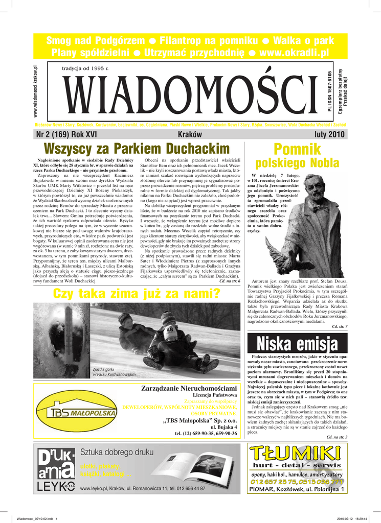 Egzemplarz bezpłatny Przekaż dalej! www.wiadomosci.krakow.pl WIADOMOŚCI tradycja od 1995 r. PL ISSN 1507-6105 Smog nad Podgórzem l Filantrop na pomniku l Walka o park Plany spółdzielni l Utrzymać przychodnię l www.okradli.pl Bieżanów Nowy i Stary, Kozłówek, Kurdwanów, Łagiewniki, os. Cegielniana, Piaski Nowe i Wielkie, Prokocim Nowy i Stary, Rżąka, Swoszowice, Wola Duchacka Wschód i Zachód Nr 2 (169) Rok XVI Kraków Wszyscy za Parkiem Duchackim Nagłośnione spotkanie w siedzibie Rady Dzielnicy XI, które odbyło się 28 stycznia br. w sprawie działań na rzecz Parku Duchackiego - nie przyniosło przełomu. Zaproszony na nie wiceprezydent Kazimierz Bujakowski w imieniu swoim oraz dyrektor Wydziału Skarbu UMK Marty Witkowicz – przesłał list na ręce przewodniczącej Dzielnicy XI Bożeny Piekarczyk, w którym powtórzył to, co już powszechnie wiadomo: że Wydział Skarbu zlecił wycenę działek zaoferowanych przez rodzinę Bemów do sprzedaży Miastu z przeznaczeniem na Park Duchacki. I to zlecenie wyceny działek trwa... Słowem: Gmina potrzebuje potwierdzenia, że ich wartość rynkowa odpowiada ofercie. Ryzyko takiej procedury polega na tym, że w wycenie szacunkowej nie bierze się pod uwagę walorów krajobrazowych, przyrodniczych etc., w które park podworski jest bogaty. W kuluarowej opinii zaoferowana cena nie jest wygórowana (w sumie 9 mln zł, rozłożone na dwie raty, za ok. 3 ha terenu, z zabytkowym starym dworem, drzewostanem, w tym pomnikami przyrody, stawem etc). Przypomnijmy, że teren ten, między ulicami Malborską, Albańską, Białoruską i Laszczki, z ulicą Estońską jako przyszłą aleją o statusie ciągu pieszo-jezdnego (dojazd do przedszkola) – stanowi historyczno-kulturowy fundament Woli Duchackiej. Obecni na spotkaniu przedstawiciel właścicieli Stanisław Bem oraz ich pełnomocnik mec. Jacek Wczelik – nie kryli rozczarowania postawą władz miasta, które zamiast szukać rozwiązań wychodzących naprzeciw złożonej ofercie lub przynajmniej je sygnalizować poprzez prowadzenie rozmów, piętrzą problemy proceduralne w formie dalekiej od dyplomatycznej. Tak jakby nikomu na Parku Duchackim nie zależało, choć podobno (kogo nie zapytać) jest wprost przeciwnie. Na dobitkę wiceprezydent przypomniał w przysłanym liście, że w budżecie na rok 2010 nie zapisano środków finansowych na pozyskanie terenu pod Park Duchacki. I wreszcie, że wykupienie terenu jest możliwe dopiero w końcu br., gdy zostaną do rozdziału wolne środki z innych zadań. Mecenas Wczelik zapytał retorycznie, czy jego klientom starczy cierpliwości, aby wciąż czekać w niepewności, gdy nie brakuje im poważnych zachęt ze strony deweloperów do zbycia tych działek pod zabudowę. Na spotkanie prowadzone przez radnych dzielnicy (z niżej podpisanym), stawili się radni miasta: Marta Suter i Włodzimierz Pietrus (z zaproszonych innych radnych, tylko Małgorzata Radwan-Ballada i Grażyna Fijałkowska usprawiedliwiły się telefonicznie, zaznaczając, że „całym sercem” są za Parkiem Duchackim). Cd. na str. 6 Czy taka zima już za nami? luty 2010 Pomnik polskiego Nobla W niedzielę 7 lutego, w 101. rocznicę śmierci Erazma Józefa Jerzmanowskiego odsłonięto i poświęcono jego pomnik. Uroczystość ta zgromadziła przedstawicieli władzy różnego szczebla oraz społeczność Prokocimia, która pamięta o swoim dobroczyńcy. Autorem jest znany rzeźbiarz prof. Stefan Dousa. Pomnik wielkiego Polaka jest zwieńczeniem starań Towarzystwa Przyjaciół Prokocimia, w tym szczególnie radnej Grażyny Fijałkowskiej i prezesa Romana Rozlachowskiego. Wsparcia udzielała aż do skutku także była przewodnicząca Rady Miasta Krakowa Małgorzata Radwan-Ballada. Wielu, którzy przyczynili się do całorocznych obchodów Roku Jerzmanowskiego, nagrodzono okolicznościowymi medalami. Cd. str. 7 Niska emisja Zjazd z górki w Parku Kurdwanowskim Zarządzanie Nieruchomościami Licencja Państwowa Zapraszamy do współpracy Deweloperów, Wspólnoty Mieszkaniowe, osoby prywatne. „TBS Małopolska” Sp. z o.o. ul. Bujaka 4 tel. (12) 659-90-35, 659-90-36 Sztuka dobrego druku ulotki, plakaty, książki, katalogi ... www.leyko.pl, Kraków, ul. Romanowicza 11, tel. 012 656 44 87 Wiadomosci_02'10-02.indd 1 Podczas siarczystych mrozów, jakie w styczniu opanowały nasze miasto, zanotowano przekroczenie norm stężenia pyłu zawieszonego, przekroczony został nawet poziom alarmowy. Broniliśmy się przed 20 stopniowymi mrozami dogrzewaniem mieszkań i domów na wszelkie – dopuszczalne i niedopuszczalne – sposoby. Najwięcej palenisk typu piece i lokalne kotłownie jest jeszcze na obrzeżach miasta, w tym w Podgórzu; to one oraz to, czym się w nich pali – stanowią źródło tzw. niskiej emisji zanieczyszczeń. Jednak zalegający często nad Krakowem smog „nie musi się obawiać”, że krakowianie zaczną z nim stanowczo walczyć w najbliższych tygodniach. Nie ma bowiem żadnych zachęt skłaniających do takich działań, a strażnicy miejscy nie są w stanie zajrzeć do każdego pieca. Cd. na str. 3 tłumiki hurt - detal - serwis opony, haki hol., hamulce, amortyzatory 012 657 23 75, 0513 096 771 PIOMAR, Kozłówek, ul. Polonijna 1 2010-02-12 16:29:44 2 WIADOMOŚCI ■ Lokalne Forum ■ email: [email protected] www.okradli.pl Kupując w Polsce mieszkanie od dewelopera, grasz w rosyjską ruletkę. Wydaje Ci się, że jesteś ostrożny. Przeanalizowałeś kilkadziesiąt ofert. Rozmawiałeś ze specjalistami z branży budowlanej. Przeczytałeś wnikliwie umowę, poprosiłeś o opinię prawnika lub sam jesteś prawnikiem. Wreszcie poprosiłeś Twój bank o pożyczkę. Wydawać by się mogło, że bank powinien rozpoznać sytuację i unikać ryzykownych inwestycji. Bank jednak nie ponosi żadnego ryzyka i zawsze znajdzie sposób, by odzyskać swoje pieniądze. Za to ty zostaniesz bez mieszkania i będziesz spłacał zaciągnięty dług w banku przez najbliżs