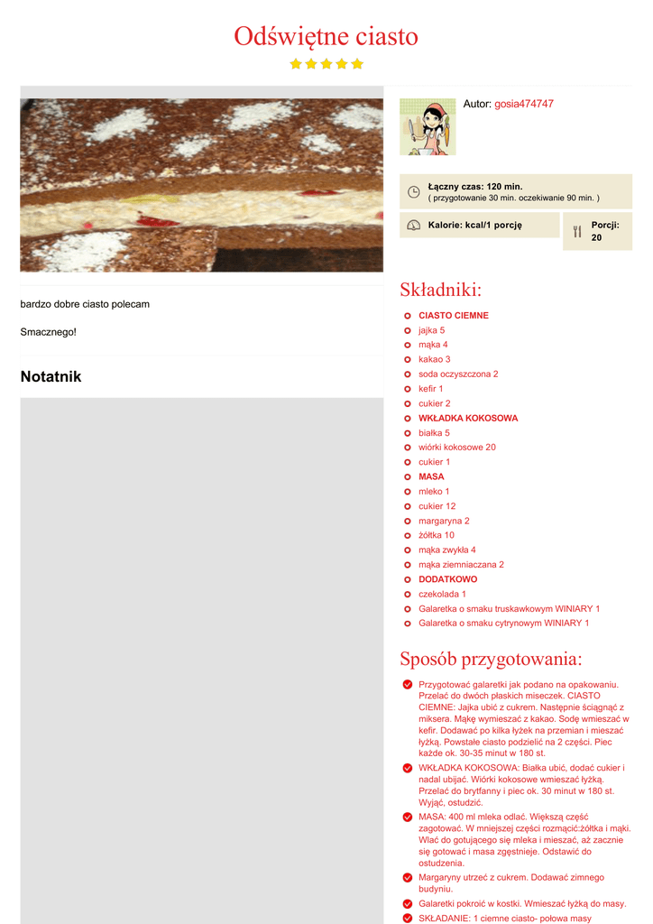 Odświętne ciasto Autor: gosia474747 Łączny czas: 120 min. ( przygotowanie 30 min. oczekiwanie 90 min. ) Kalorie: kcal/1 porcję bardzo dobre ciasto polecam Porcji: 20 Składniki: CIASTO CIEMNE Smacznego! jajka 5 mąka 4 kakao 3 Notatnik soda oczyszczona 2 kefir 1 cukier 2 WKŁADKA KOKOSOWA białka 5 wiórki kokosowe 20 cukier 1 MASA mleko 1 cukier 12 margaryna 2 żółtka 10 mąka zwykła 4 mąka ziemniaczana 2 DODATKOWO czekolada 1 Galaretka o smaku truskawkowym WINIARY 1 Galaretka o smaku cytrynowym WINIARY 1 Sposób przygotowania: Przygotować galaretki jak podano na opakowaniu. Przelać do dwóch płaskich miseczek. CIASTO CIEMNE: Jajka ubić z cukrem. Następnie ściągnąć z miksera. Mąkę wymieszać z kakao. Sodę wmieszać w kefir. Dodawać po kilka łyżek na przemian i mieszać łyżką. Powstałe ciasto podzielić na 2 części. Piec każde ok. 3035 minut w 180 st. WKŁADKA KOKOSOWA: Białka ubić, dodać cukier i nadal ubijać. Wiórki kokosowe wmieszać łyżką. Przelać do brytfanny i piec ok. 30 minut w 180 st. Wyjąć, ostudzić. MASA: 400 ml mleka odlać. Większą część zagotować. W mniejszej części rozmącić:żółtka i mąki. Wlać do gotującego się mleka i mieszać, aż zacznie się gotować i masa zgęstnieje. Odstawić do ostudzenia. Margaryny utrzeć z cukrem. Dodawać zimnego budyniu. Galaretki pokroić w kostki. Wmieszać łyżką do masy. SKŁADANIE: 1 ciemne ciasto połowa masy budyniowej wkładka kokosowa połowa masy budyniowej (zostawić trochę na dekorację) drugie ciasto ciemne pozostałość masy zetrzeć czekoladę (ozdobić wg uznania)