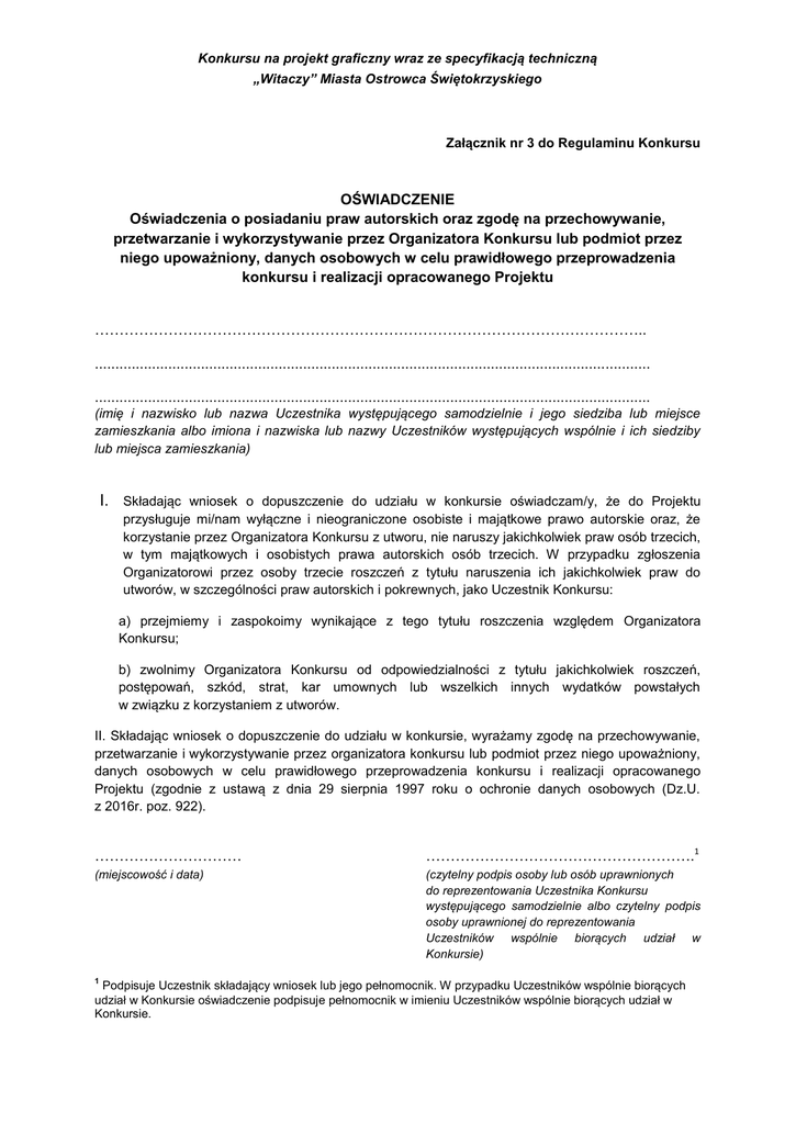 Konkursu na projekt graficzny wraz ze specyfikacją techniczną „Witaczy” Miasta Ostrowca Świętokrzyskiego Załącznik nr 3 do Regulaminu Konkursu OŚWIADCZENIE Oświadczenia o posiadaniu praw autorskich oraz zgodę na przechowywanie, przetwarzanie i wykorzystywanie przez Organizatora Konkursu lub podmiot przez niego upoważniony, danych osobowych w celu prawidłowego przeprowadzenia konkursu i realizacji opracowanego Projektu ………………………………………………………………………………………………….. ........................................................................................................................................ ........................................................................................................................................ (imię i nazwisko lub nazwa Uczestnika występującego samodzielnie i jego siedziba lub miejsce zamieszkania albo imiona i nazwiska lub nazwy Uczestników występujących wspólnie i ich siedziby lub miejsca zamieszkania) I. Składając wniosek o dopuszczenie do udziału w konkursie oświadczam/y, że do Projektu przysługuje mi/nam wyłączne i nieograniczone osobiste i majątkowe prawo autorskie oraz, że korzystanie przez Organizatora Konkursu z utworu, nie naruszy jakichkolwiek praw osób trzecich, w tym majątkowych i osobistych prawa autorskich osób trzecich. W przypadku zgłoszenia Organizatorowi przez osoby trzecie roszczeń z tytułu naruszenia ich jakichkolwiek praw do utworów, w szczególności praw autorskich i pokrewnych, jako Uczestnik Konkursu: a) przejmiemy i zaspokoimy wynikające z tego tytułu roszczenia względem Organizatora Konkursu; b) zwolnimy Organizatora Konkursu od odpowiedzialności z tytułu jakichkolwiek roszczeń, postępowań, szkód, strat, kar umownych lub wszelkich innych wydatków powstałych w związku z korzystaniem z utworów. II. Składając wniosek o dopuszczenie do udziału w konkursie, wyrażamy zgodę na przechowywanie, przetwarzanie i wykorzystywanie przez organizatora konkursu lub podmiot przez niego upoważniony, danych osobowych w celu prawidłowego przeprowadzenia konkursu i realizacji opracowanego Projektu (zgodnie z ustawą z dnia 29 sierpnia 1997 roku o ochronie danych osobowych (Dz.U. z 2016r. poz. 922). ………………………… ……………………………………………….1 (miejscowość i data) (czytelny podpis osoby lub osób uprawnionych do reprezentowania Uczestnika Konkursu występującego samodzielnie albo czytelny podpis osoby uprawnionej do reprezentowania Uczestników wspólnie biorących udział w Konkursie) 1 Podpisuje Uczestnik składający wniosek lub jego pełnomocnik. W przypadku Uczestników wspólnie biorących udział w Konkursie oświadczenie podpisuje pełnomocnik w imieniu Uczestników wspólnie biorących udział w Konkursie.