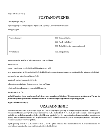 Sygn. akt III Ca 60/15 POSTANOWIENIE Dnia 19 lutego 2015 r. Sąd Okręgowy w Nowym Sączu, Wydział III Cywilny Odwoławczy w składzie następującym: Przewodniczący: SSO Tomasz Białka SSO Jacek Małodobry SSO Zofia Klisiewicz (sprawozdawca) Protokolant: staż. Kinga Burny po rozpoznaniu w dniu 19 lutego 2015 r. w Nowym Sączu na rozprawie sprawy z wniosku (...) Spółdzielni Mieszkaniowej w N. przy uczestnictwie M. B., małoletnich P. K. i K. K. (1) reprezentowanych przez przedstawicielkę ustawową K. K. (2) o stwierdzenie nabycia spadku po G. K. na skutek apelacji uczestniczki M. B. od postanowienia Sądu Rejonowego w Nowym Targu z dnia 25 listopada 2014 r., sygn. akt I Ns 911/14 postanawia: uchylić zaskarżone postanowienie i sprawę przekazać Sądowi Rejonowemu w Nowym Targu do ponownego rozpoznania oraz orzeczenia o kosztach postępowania apelacyjnego. Sygn. akt III Ca 60/15 UZASADNIENIE Postanowieniem z dnia 25.11.2014r. (sygn. akt I Ns 911/14) Sąd Rejonowy w Nowym Targu w sprawie z wniosku (...) Spółdzielni Mieszkaniowej w N. przy uczestnictwie M. B., małoletnich P. K. i K. K. (1) o stwierdzenie nabycia spadku po G. K., stwierdził, że spadek po G. K., s. R. i M., zm. w dniu (...). w N. i tam ostatnio stale zamieszkałym na podstawie ustawy nabyła w całości siostra M. B. (pkt I) oraz orzekł, ze każdy uczestnik ponosi koszty postępowania związane ze swoim udziałem w sprawie (pkt II). Sąd Rejonowy ustalił, że G. K. zmarł w dniu (...) w N., gdzie ostatnio stale zamieszkiwał. G. K. w chwili śmierci był rozwiedziony, posiadał dwoje małoletnich dzieci: P. i K. K. (1). P. i K. K. (1) za zezwoleniem Sądu Rejonowego w R. Wydział Rodzinny i Nieletnich wyrażonym w postanowieniu z dnia 6.05.2013r., IV Nsm 298/13/10, w dniu 25.06.2013r. spadek po ojcu odrzucili W związku z tym do dziedziczenia powołana została jedyna siostra spadkodawcy M. B. - rodzice spadkodawcy R. i M. zmarli przed nim. Poza wymienioną nie ma innych osób uprawnionych do dziedziczenia z ustawy, a spadkodawca nie pozostawił testamentu. W terminie określonym w art 1015 § 1 k.c. M. B. nie złożyła oświadczenia w przedmiocie odrzucenia bądź przyjęcia spadku. Na tle ustalonego stanu faktycznego Sąd Rejonowy uznał, że skoro dzieci spadkodawcy odrzuciły spadek w terminie określonym w art. 1015 § 1 k.c., dlatego też dziedziczy po nim siostra - M. B., która takiego oświadczenia w terminie nie złożyła, a zatem należy traktować ją jako osobę, która spadek przyjęła. Zdaniem Sądu Rejonowego termin z art. 1015 § 1 k.c. zaczął biec dla uczestniczki w chwili otwarcia spadku, bowiem choć nie wiedziała ona wcześniej, iż spadek może odrzucić, to świadomość spadkobiercy co do możliwości złożenia oświadczenia w przedmiocie przyjęcia bądź odrzucenia spadku, pozostaje bez znaczenia dla upływu terminu z art. 1015 § 1 k.c. Powyższe postanowienie zaskarżyła uczestniczka M. B. apelacją, w której zarzuciła: 1. naruszenie art. 1015 § 1 k.c. przez błędną jego wykładnię i przyjęcie, że spadkobierca po upływie sześciu miesięcy od chwili dowiedzenia się o otwarciu spadku nabywa go wprost, podczas gdy literalne brzmienie tego przepisu wskazuje, iż oświadczenie o przyjęciu lub odrzuceniu spadku może być złożone w ciągu sześciu miesięcy od dnia, w którym spadkobierca dowiedział się o tytule swojego powołania, co skutkowało niewłaściwym zastosowaniem art. 1015 § 2 k.c. i uznaniem, iż na dzień zamknięcia rozprawy uczestniczka M. B. przyjęła spadek wprost, podczas gdy sześciomiesięczny termin na złożenie oświadczenia o przyjęciu lub odrzuceniu spadku rozpoczął się dla niej w momencie doręczenia jej odpisu wniosku o stwierdzeniu praw do spadku po G. K. tj. od dnia 17.11.2014r., kiedy to dowiedziała się o tytule swojego powołania i w dniu zamknięcia rozprawy termin ten jeszcze nie upłynął, 2. naruszenie art. 643 k.p.c. przez niepoinformowanie uczestniczki o odrzuceniu spadku przez małoletnich P. i K. K. (1), w sytuacji kiedy wniosek o stwierdzenie nabycia spadku po G. K. wraz z załącznikami został złożony w Sądzie spadku w dniu 5.08.2014r., 3. naruszenie art. 640 § 2 k.p.c. przez jego niezastosowanie i brak odebrania od uczestniczki oświadczenia o przyjęciu albo odrzuceniu spadku w sytuacji, kiedy uczestniczka zeznała, iż do dnia rozprawy nie składała oświadczenia w tym przedmiocie, 4. naruszenie art. 670 k.p.c. przez niewyjaśnienie, od jakiej daty biegnie dla uczestniczki M. B. termin do złożenia oświadczenia o przyjęciu lub odrzuceniu spadku, w sytuacji gdy powołani w pierwszej kolejności do dziedziczenia po G. K. odrzucili spadek po ojcu, co skutkowało bezzasadnym przyjęciem, iż uczestniczka ta przyjęła spadek po G. K., 5. naruszenie art. 932 § 4 k.c. przez jego zastosowanie i przyjęcie, że M. B. nabyła spadek po G. K., w sytuacji gdy nie upłynął jeszcze termin do złożenia przez nią oświadczenia o przyjęciu bądź odrzuceniu spadku. Wskazując na powyższe uchybienia, apelująca wniosła o uchylenie zaskarżonego postanowienia i przekazanie sprawy Sądowi Rejonowemu do ponownego rozpoznania, a także o zasądzenie kosztów postępowania za I i II instancję. Do apelacji uczestniczka dołączyła wypis aktu notarialnego z dnia 1.12.2014r. (Rep. (...)) zawierający jej oświadczenie o odrzuceniu w całości spadku po swoim bracie G. K.. W odpowiedzi na apelację – piśmie z dnia 26.01.2015r. przedstawicielka ustawowa małoletnich uczestników K. K. (2) zaprzeczyła twierdzeniom uczestniczki M. B., jakoby nie wiedziała ona o odrzuceniu spadku przez dzieci spadkodawcy, bowiem została przez matkę małoletnich powiadomiona o zamiarze odrzucenia spadku przez dzieci, ponadto do uczestniczki został wysłany akt notarialny zawierający oświadczenie o odrzuceniu spadku przez P. i K. K. (1), zatem wiedziała ona zarówno o śmierci spadkodawcy, jak i o tytule powołania jej do dziedzicz