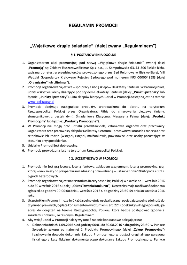 REGULAMIN PROMOCJI „Wyjątkowe drugie śniadanie” (dalej zwany „Regulaminem”) § 1. POSTANOWIENIA OGÓLNE 1. Organizatorem akcji promocyjnej pod nazwą ,,Wyjątkowe drugie śniadanie” zwanej dalej „Promocją” są; Zakłady Tłuszczowe Bielmar Sp. z o.o., ul. Sempołowska 63, 43-300 Bielsko Biała, wpisana do rejestru przedsiębiorców prowadzonego przez Sąd Rejonowy w Bielsku-Białej, VIII Wydział Gospodarczy Krajowego Rejestru Sądowego pod numerem KRS 0000049583 (dalej „Organizator” lub „Bielmar”). 2. Promocja organizowana jest we współpracy z siecią sklepów Delikatesy Centrum. W Promocji biorą udział wszystkie sklepy działające pod szyldem Delikatesy Centrum (dalej: „Punkt Sprzedaży” lub łącznie: „Punkty Sprzedaży”). Lista sklepów biorących udział w Promocji dostępna jest na stronie www.delikatesy.pl 3. Promocja obejmuje następujące produkty, wprowadzone do obrotu na terytorium Rzeczypospolitej Polskiej przez Organizatora: Fithia do smarowania pieczywa (lniany, słonecznikowy, z pestek dyni), Śniadaniowa Klasyczna, Margaryna Palma (dalej: „Produkt Promocyjny” lub łącznie: „Produkty Promocyjne”). 4. W Promocji nie mogą brać udziału przedstawiciele, członkowie organów oraz pracownicy Organizatora oraz pracownicy sklepów Delikatesy Centrum i pracownicy Eurocash Franczyza oraz członkowie ich rodzin (wstępni, zstępni, małżonkowie, powinowaci oraz osoby pozostające w stosunku przysposobienia). 5. Udział w Promocji jest dobrowolny. 6. Promocja prowadzona jest na terytorium Rzeczypospolitej Polskiej. § 2. UCZESTNICTWO W PROMOCJI 1. Promocja nie jest grą losową, loterią fantową, zakładem wzajemnym, loterią promocyjną, grą, której wynik zależy od przypadku ani żadną inną przewidzianą w ustawie z dnia 19 listopada 2009 r. o grach hazardowych. 2. Promocja organizowana jest na terytorium Rzeczypospolitej Polskiej w okresie od 1 września 2016 r. do 30 września 2016 r. (dalej: „Okres Trwania Konkursu”). Uczestnicy maja możliwość dokonania zgłoszeń od godziny 00:00:00 dnia 1 września 2016 r. do godziny 23:59:59 dnia 30 września 2016 roku. 3. Uczestnikiem Promocji może być każda pełnoletnia osoba fizyczna, posiadająca pełną zdolność do czynności prawnych, będąca konsumentem w rozumieniu art. 22 1 Kodeksu Cywilnego i posiadająca adres do doręczeń na terenie Rzeczypospolitej Polskiej, która będzie postępować zgodnie z zasadami Konkursu, określonymi Regulaminem. 4. Aby wziąć udział w Promocji należy wykonać zadanie konkursowe polegające na: a. Dokonaniu dniach 1.09.2016 r. od godziny 00:01 do 30.08.2016 r. do godziny 23:59 w Punkcie Sprzedaży zakupu co najmniej 1 Produktu Promocyjnego (dalej „Zakup Promocyjny”) i zachowaniu dowodu dokonania Zakupu Promocyjnego w postaci oryginalnego paragonu fiskalnego z kasy fiskalnej dokumentującego dokonanie Zakupu Promocyjnego w Punkcie Sprzedaży w Okresie Trwania Konkursu. Data na dowodzie zakupu nie może być późniejsza niż dzień dokonania zgłoszenia, o którym mowa w lit. b. poniżej. b. Przesłaniu w Okresie Trwania Promocji skanu lub zdjęcia dowodu dokonania Zakupu Promocyjnego na adres mailowy [email protected] wraz z odpowiedzią na pytanie konkursowe: Jak powinno wyglądać wyjątkowe drugie śniadanie? Udzielenie odpowiedzi na pytanie konkursowe jest niezbędnym warunkiem wzięcia udziału w Promocji. 5. Przesłany przez Uczestnika Promocji dowód dokonania Zakupu Promocyjnego musi być czytelny, nie może nosić znamion przeróbek lub innych ingerencji w jego treść i musi dokumentować zakup Produktu Promocyjnego w sklepach Delikatesy Centrum w okresie określonym w regulaminie 6. W przypadku niespełnienia przez Uczestnika kryteriów określonych w § 2 ust. 3 lub w przypadku wykonania zadania konkursowego w sposób niezgodny z wytycznymi określonymi w § 2 ust. 4 Regulaminu, Organizator ma prawo wyłączyć zgłoszenie Uczestnika z procesu konkursowego. 7. Decyzje Organizatora są nieodwołalne. 8. Ze wszystkich zebranych zgłoszeń w terminie od godziny 00:00 dnia 30.09.2016 r. do godz. 00:00 dnia 15.10.2016r. Komisja Konkursowa wyłoni 1 zwycięzcę głównego i 10 wyróżnionych uczestników i ogłosi wyniki na www.delikatesy.pl/konkursy oraz www.bielmar.com.pl 9. Kryteriami równoważnymi oceny będą: a. Kreatywność odpowiedzi, b. Oryginalność przedstawionej odpowiedzi względem reszty zgłoszeń. 10. Decyzje komisji konkursowej są niepodważalne. § 3. NAGRODY I WYŁONIENIE ZWYCIĘZCÓW 1. Organizator przewiduje w Konkursie jedną nagrodę główną w postaci VOUCHER ‘a na trzydniowy pobyt dla dwóch osób w hotelu Nosalowy Dwór oraz 10 nagród wyróżniających, składających się z tabletów marki Lenovo (dalej łącznie jako „Nagrody”) o wartości: I. Nagroda główna: 2880 zł brutto II. Nagroda wyróżnienia: 800 zł brutto każda. 2. Każdy uczestnik może wygrać tylko 1 Nagrodę w Konkursie. 3. Informacja z listą zwycięzców zostanie zamieszczona na stronie www.delikatesy/konkursy do godziny 23:59 dnia 16.10.2016 r. Ponadto zwycięzcy zostaną w ww. terminie poinformowani o wygranej za pomocą odpowiedzi mailowej na wiadomość ze zgłoszeniem. 4. Zwycięzca powinien w terminie do 18.10.2016 r. przesłać w wiadomości email swoje dane teleadresowe, tj. imię, nazwisko, nr telefonu, adres email oraz adres pocztowy niezbędny do wysłania Nagrody. Niedotrzymanie terminu przesłania danych osobowych skutkuje odebraniem prawa do Nagrody i przyznaniem Nagrody osobie wyłonionej jako rezerwowa. 5. Nagrody zostaną wydane do dnia 30.10.2016 r. zgodnie z obowiązującymi przepisami podatkowymi. 6. Za wydanie Nagród odpowiada Organizator. 7. Zwycięzca ma prawo zrezygnować z Nagrody bez prawa do jakiegokolwiek ekwiwalentu. 8. Zwycięzcy nie przysługuje prawo zamiany Nagrody na inną nagrodę rzeczową, ani na ekwiwalent pieniężny. 9. Organizator ma prawo poprosić zwycięzcę o skan dowo