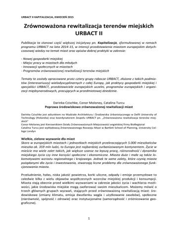 URBACT II KAPITALIZACJA, KWIECIEŃ 2015 Zrównoważona rewitalizacja terenów miejskich URBACT II Publikacja ta stanowi część większej inicjatywy pn. Kapitalizacja, sformułowanej w ramach programu URBACT na lata 2014-15, w intencji przedstawienia miastom europejskim dotychczasowej wiedzy na temat miast oraz opisów dobrej praktyki w zakresie: - Nowej gospodarki miejskiej - Miejsc pracy w miastach dla młodych - Innowacji społecznych w miastach - Programów zrównoważonej rewitalizacji terenów miejskich Tematy te zostały opracowane przez cztery grupy robocze URBACT, złożone z takich podmiotów (interesariuszy) wielodyscyplinarnych z całej Europy, jak praktycy gospodarki miejskiej i specjaliści URBACT, przedstawiciele europejskich uczelni, programów europejskich i organizacji międzynarodowych, pracujących w przedmiotowej dziedzinie. Darinka Czischke, Conor Moloney, Catalina Turcu Poprawa środowiskowo zrównoważonej rewitalizacji miast Darinka Czischke jest adiunktem na Wydziale Architektury i Środowiska Urbanistycznego w Delft University of Technology (Holandia) oraz koordynatorem Zespołu URBACT pn. „Zrównoważona rewitalizacja terenów miejskich” Conor Moloney jest Kierownikiem Działu Zrównoważonych Miejscowości angielskiej firmy BioRegional Catalina Turcu jest wykładowcą Zrównoważonego Rozwoju Miast w Bartlett School of Planning, University College Londyn Wielkie, zielone wyzwanie dla miast Skoro w europejskich miastach i jednostkach miejskich przekraczających 5.000 mieszkańców mieszka ok. 359 mln ludzi, to Europa jest najbardziej zurbanizowanym kontynentem. Życie w mieście ma wiele zalet takich, jak większe szanse na lepszą pracę, różnorodność i dynamika miejskiego życia czy inne korzyści społeczne i ekonomiczne. Miasta duże i małe są także lokomotywami wzrostu regionalnego i krajowego. Jednak te same zalety, które czynią miasta pożądanymi dla życia i inwestowania, stwarzają liczne problemy dla zrównoważonego funkcjonowania miasta. Przeludnienie, hałas, niska jakość powietrza, korki uliczne, odpady i emisje przemysłowe to zaledwie kilka z wielu objawów współczesnych wzorców miejskiej produkcji i konsumpcji. Miasta stają obecnie przed wielkimi wyzwaniami w zakresie jakości życia i wachlarza możliwości, jakie środowiska miejskie mogą zaoferować swoim mieszkańcom. Możemy mówić o trzech głównych grupach wyzwań, stających przed zrównoważoną rewitalizacją miast: środowiskowe (zmiany klimatu, emisja dwutlenku węgla i użytkowanie zasobów), społeczne (nierówność, spójność i zdrowie) oraz instytucjonalne (samorządność i zróżnicowanie geograficzne). 1 Rzeczywistość zmian klimatycznych stawia szczególne wyzwania przed miastami. Powodzie, fale upałów, susze i inne ekstremalne zjawiska pogodowe wpływają fizycznie na dzielnice miast i infrastrukturę miasta, a następnie na zdrowie i śmiertelność populacji miejskich. Mogą również wpływać pośrednio na miejskie społeczności i gospodarkę w wyniku zniszczenia kluczowego majątku komunalnego i powstawania obaw o przyszłość, które w sumie podważają pewność inwestowania zarówno w kapitał społeczny, jak i finansowy. Nierówności społeczno-ekonomiczne powinny także być postrzegane, jako wielkie wyzwanie dla zrównoważonej rewitalizacji miasta. W kontekście globalnym rosnące konkurowanie o energię i zasoby może się połączyć ze skutkami zmian klimatycznych, co wywrze nieproporcjonalny wpływ na najbiedniejszych i najsłabszych. Jest to równie prawdziwe w odniesieniu do Europy, a szczególnie europejskich miast, gdzie nierówności pogłębiają się w wyniku licznych zjawisk demograficznych i ekonomicznych, a w szczególności starzenia się społeczeństwa (kiedy coraz więcej osób starszych nie jest w stanie radzić sobie ze skutkami zmian środowiskowych) czy wzrastającej różnorodności etnicznej i rosnącej liczby ludzi popadających w biedę i (lub) wykluczenie społeczne. Tego rodzaju sytuacje są ze sobą powiązane i w sumie dają różne konfiguracje słabości środowiska w danym mieście. Wyzwania instytucjonalne dla zrównoważonego rozwoju miejskiego są powiązane z napięciami pomiędzy podejściem odgórnym w technice i kierowaniu rewitalizacją miasta oraz oddolnym formułowaniem potrzeb, oczekiwań i inicjatyw środowiskowych. Powszechnie akceptuje się, że w społeczeństwach demokratycznych procesy rewitalizacji miast powinny stosować podejścia oparte na działaniach samorządnych, angażujących licznych interesariuszy (zainteresowane podmioty), w tym mieszkańców i inne grupy i społeczności obywatelskie. Jednak zbyt często zauważamy niekończące się konflikty pomiędzy tym, czego chcą społeczności lokalne dla swojego otoczenia, a planami zarządu miasta. Ponadto interesy korporacyjne deweloperów komercyjnych również pogarszają sytuację, co może tworzyć wieloletnie blokady procesu podejmowania decyzji, albo sytuacje, w których jedna strona wygrywa, a druga przegrywa. Zespół „Zrównoważonej rewitalizacji terenów miejskich” URBACT zbadał tego rodzaju problemy i udokumentował niektóre z rozwiązań, jakie zastosowały miasta europejskie dla rozwiązania tych problemów poprzez działania skupione na środowisku. Szczególny akcent postawiliśmy na fizyczne interwencje na szczeblu lokalnym w miastach dużych i małych oraz rozpatrywaliśmy innowacyjne działania charakteryzujące się niską emisją dwutlenku węgla i wysoką wydajnością energetyczną, sprawdzając także szersze relacje społecznego i instytucjonalnego wymiaru zrównoważonego rozwoju. O czym mówimy, kiedy mówimy o „zrównoważonej rewitalizacji miast” Zanim przejdziemy do tematu, dobrze byłoby wyjaśnić, co rozumiemy pod hasłem „zrównoważona rewitalizacja”. Chociaż okazało się, że nie jest możliwe przyjęcie jednolitej definicji „zrównoważonego rozwoju miejskiego” albo