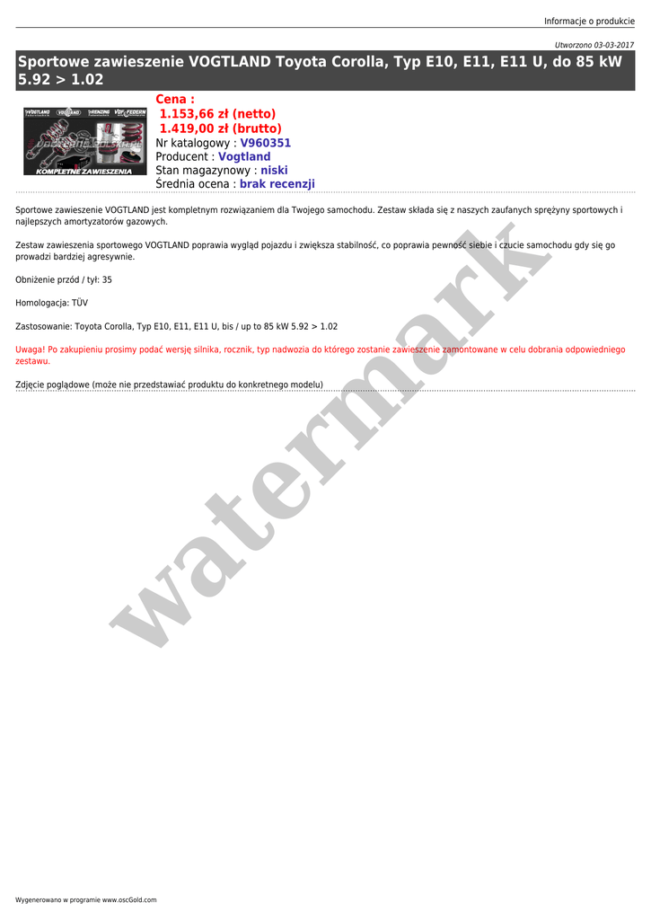 Informacje o produkcie Utworzono 03-03-2017 Sportowe zawieszenie VOGTLAND Toyota Corolla, Typ E10, E11, E11 U, do 85 kW 5.92 > 1.02 Cena : 1.153,66 zł (netto) 1.419,00 zł (brutto) Nr katalogowy : V960351 Producent : Vogtland Stan magazynowy : niski Średnia ocena : brak recenzji Sportowe zawieszenie VOGTLAND jest kompletnym rozwiązaniem dla Twojego samochodu. Zestaw składa się z naszych zaufanych sprężyny sportowych i najlepszych amortyzatorów gazowych. Obniżenie przód / tył: 35 Homologacja: TÜV er m ar k Zestaw zawieszenia sportowego VOGTLAND poprawia wygląd pojazdu i zwiększa stabilność, co poprawia pewność siebie i czucie samochodu gdy się go prowadzi bardziej agresywnie. Zastosowanie: Toyota Corolla, Typ E10, E11, E11 U, bis / up to 85 kW 5.92 > 1.02 Uwaga! Po zakupieniu prosimy podać wersję silnika, rocznik, typ nadwozia do którego zostanie zawieszenie zamontowane w celu dobrania odpowiedniego zestawu. w at Zdjęcie poglądowe (może nie przedstawiać produktu do konkretnego modelu) Wygenerowano w programie www.oscGold.com