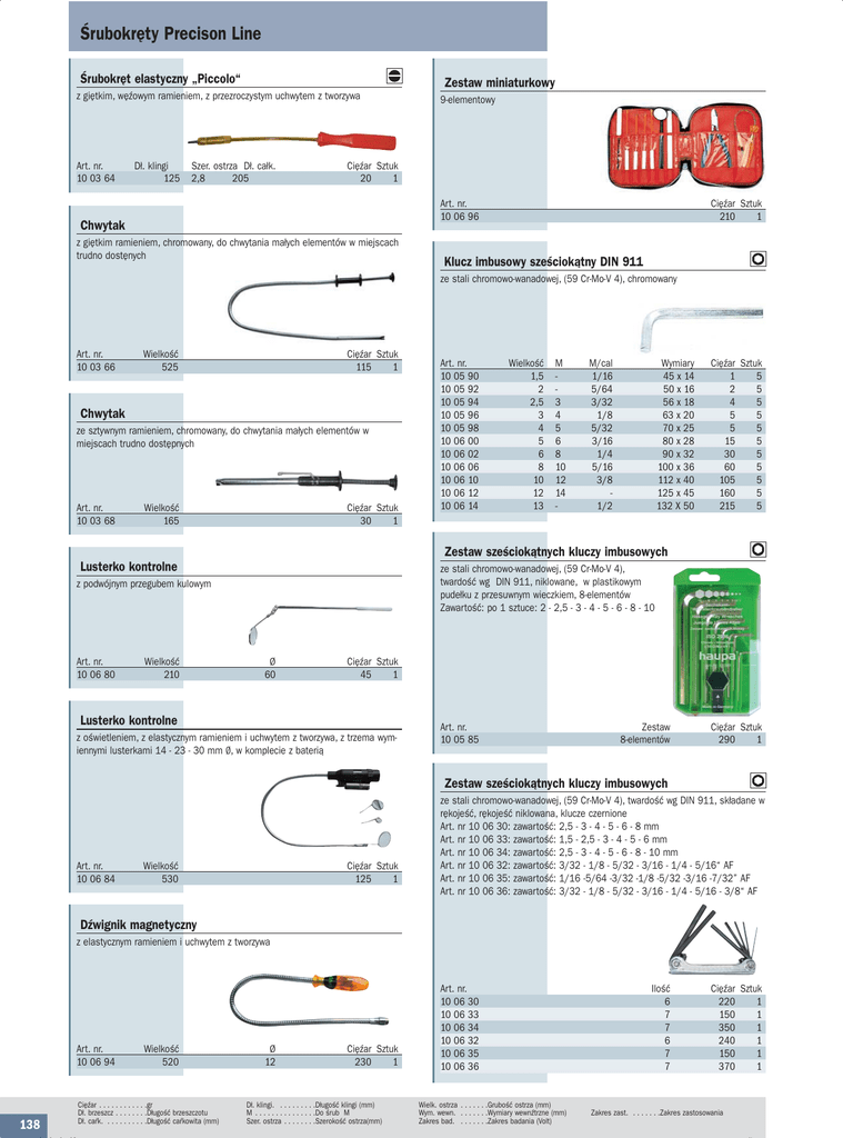 Śrubokręty Precison Line Śrubokręt elastyczny „Piccolo“ Zestaw miniaturkowy z giętkim, węźowym ramieniem, z przezroczystym uchwytem z tworzywa Art. nr. 10 03 64 Dł. klingi 125 Szer. ostrza Dł. całk. 2,8 205 9-elementowy Cięźar Sztuk 20 1 Art. nr. 10 06 96 Chwytak z giętkim ramieniem, chromowany, do chwytania małych elementów w miejscach trudno dostęnych Cięźar Sztuk 210 1 Klucz imbusowy sześciokątny DIN 911 ze stali chromowo-wanadowej, (59 Cr-Mo-V 4), chromowany Art. nr. 10 03 66 Wielkość 525 Cięźar Sztuk 115 1 Chwytak ze sztywnym ramieniem, chromowany, do chwytania małych elementów w miejscach trudno dostępnych Art. nr. 10 03 68 Wielkość 165 Cięźar Sztuk 30 1 M 3 4 5 6 8 10 12 14 - M/cal 1/16 5/64 3/32 1/8 5/32 3/16 1/4 5/16 3/8 1/2 Wymiary 45 x 14 50 x 16 56 x 18 63 x 20 70 x 25 80 x 28 90 x 32 100 x 36 112 x 40 125 x 45 132 X 50 Cięźar Sztuk 1 5 2 5 4 5 5 5 5 5 15 5 30 5 60 5 105 5 160 5 215 5 ze stali chromowo-wanadowej, (59 Cr-Mo-V 4), twardość wg DIN 911, niklowane, w plastikowym pudełku z przesuwnym wieczkiem, 8-elementów Zawartość: po 1 sztuce: 2 - 2,5 - 3 - 4 - 5 - 6 - 8 - 10 z podwójnym przegubem kulowym Wielkość 210 Wielkość 1,5 2 2,5 3 4 5 6 8 10 12 13 Zestaw sześciokątnych kluczy imbusowych Lusterko kontrolne Art. nr. 10 06 80 Art. nr. 10 05 90 10 05 92 10 05 94 10 05 96 10 05 98 10 06 00 10 06 02 10 06 06 10 06 10 10 06 12 10 06 14 Ø 60 Cięźar Sztuk 45 1 Lusterko kontrolne z oświetleniem, z elastycznym ramieniem i uchwytem z tworzywa, z trzema wymiennymi lusterkami 14 - 23 - 30 mm Ø, w komplecie z baterią Art. nr. 10 05 85 Zestaw 8-elementów Cięźar Sztuk 290 1 Zestaw sześciokątnych kluczy imbusowych Art. nr. 10 06 84 Wielkość 530 Cięźar Sztuk 125 1 ze stali chromowo-wanadowej, (59 Cr-Mo-V 4), twardość wg DIN 911, składane w rękojeść, rękojeść niklowana, klucze czernione Art. nr 10 06 30: zawartość: 2,5 - 3 - 4 - 5 - 6 - 8 mm Art. nr 10 06 33: zawartość: 1,5 - 2,5 - 3 - 4 - 5 - 6 mm Art. nr 10 06 34: zawartość: 2,5 - 3 - 4 - 5 - 6 - 8 - 10 mm Art. nr 10 06 32: zawartość: 3/32 - 1/8 - 5/32 - 3/16 - 1/4 - 5/16“ AF Art. nr 10 06 35: zawartość: 1/16 -5/64 -3/32 -1/8 -5/32 -3/16 -7/32” AF Art. nr 10 06 36: zawartość: 3/32 - 1/8 - 5/32 - 3/16 - 1/4 - 5/16 - 3/8“ AF Dźwignik magnetyczny z elastycznym ramieniem i uchwytem z tworzywa Art. nr. 10 06 94 138 Wielkość 520 Cięźar . . . . . . . . . . . .gr Dł. brzeszcz . . . . . . . .Długość brzeszczotu Dł. caŕk. . . . . . . . . . .Długość caŕkowita (mm) Ø 12 Cięźar Sztuk 230 1 Dł. klingi. . . . . . . . . .Długość klingi (mm) M . . . . . . . . . . . . . . .Do śrub M Szer. ostrza . . . . . . . .Szerokość ostrza(mm) Art. nr. 10 06 30 10 06 33 10 06 34 10 06 32 10 06 35 10 06 36 Wielk. ostrza . . . . . . .Grubość ostrza (mm) Wym. wewn. . . . . . . .Wymiary wewnźtrzne (mm) Zakres bad. . . . . . . .Zakres badania (Volt) Ilość 6 7 7 6 7 7 Cięźar Sztuk 220 1 150 1 350 1 240 1 150 1 370 1 Zakres zast. . . . . . . .Zakres zastosowania Zestaw sześciokątnych kluczy imbusowych 1 Klucz imbusowy sześciokątny z ruchomą głowicą ze stali chromowo-wanadowej, (59 Cr-Mo-V 4), twardość wg DIN 911, na kółku Zawartość: 2,5 - 3 - 4 - 5 - 6 - 8 - 10 prosta klinga ze stali chromowo-wanadowej, (59 Cr-Mo-V 4), wg DIN 911, niklowany, z uchwytem z tworzywa 2 3 Art. nr. 10 06 40 Ilość 8 Cięźar Sztuk 250 10 Klucz imbusowy sześciokątny z ruchomą głowicą ze stali chromowo-wanadowej, (59 Cr-Mo-V 4), niklowany Art. nr. 10 10 06 10 10 08 10 10 12 10 10 14 10 10 16 10 10 18 10 10 20 10 10 22 10 10 24 Wielkość 1,5 2 3 4 5 6 8 10 12 Dł. klingi 75 100 100 100 100 125 150 150 150 Dł. całk. 155 180 180 200 200 225 250 250 260 Cięźar Sztuk 30 12 30 12 35 12 50 12 75 12 90 12 155 12 225 12 300 12 Dł. brzeszcz 2,5 3 4 5 6 8 10 Wym. wewn 56 x 18 63 x 20 70 x 25 80 X 28 90 x 32 100 x 36 112 x 40 Cięźar Sztuk 4 10 5 10 10 10 18 10 30 10 59 5 103 5 Zestaw sześciokątnych kluczy imbusowych z ruchomą głowicą ze stali chromowo-wanadowej, (59 Cr-Mo-V 4), twardość wg DIN 911, składane w rękojeść, rękojeść niklowana, klucze czarne. Zawartość: 2,5 - 3 - 4 - 5 - 6 - 8 - 10 5 6 7 8 9 Śrubokręt kątowy Tx ze stali chromowo-wanadowej, (59 Cr-Mo-V 4), niklowany Art. nr. 10 09 02 10 09 03 10 09 04 10 09 05 10 09 06 10 09 08 10 09 09 4 10 11 Art. nr. 10 09 64 10 09 66 10 09 68 10 09 70 10 09 72 10 09 74 10 09 88 Wielkość TX 5 TX 6 TX 7 TX 8 TX 9 TX 10 TX 45 Wym. wewn 42 x 16 42 x 16 48 x 16 48 x 16 48 x 16 51 x 17 83 x 29 Cięźar Sztuk 2 10 2 10 2 10 3 10 3 10 4 10 43 10 12 13 14 15 16 Zestaw śrubokrętów kątowych Tx ze stali chromowo-wanadowej, (59 Cr-Mo-V 4), czernione, w plastikowym pudełku z przesuwnym wieczkiem, 8-elementów. Zawartość: po 1 sztuce TX 9 - 10 - 15 - 20 - 25 - 27 - 30 - 40 17 18 19 Art. nr. 10 09 17 Ilość 7 3 20 Cięźar Sztuk 70 1 21 22 Zestaw sześciokątnych kluczy imbusowych z ruchomą głowicą Art. nr. 10 09 41 ze stali chromowo-wanadowej, (59 Cr-Mo-V 4), wg DIN 911, niklowane, w plastikowym pudełku z przesuwnym wieczkiem, 8-elementów Zawartość: po 1 sztuce 2 - 2,5 - 3 - 4 - 5 - 6 - 8 - 10 Zestaw 8-elementów Cięźar Sztuk 110 6 Zestaw śrubokrętów Tx ze stali chromowo-wanadowej, (59 Cr-Mo-V 4), czernione, składane w rękojeść, rękojeść niklowana, klucze czarne. Zawartość: po 1 sztuce TX 9 - 10 - 15 - 20 - 25 - 27 - 30 - 40 23 24 25 26 27 28 29 Art. nr. 10 09 15 Zestaw 8-elementów Cięźar Sztuk 290 6 Art. nr. 10 09 43 Ilość 8 Cięźar Sztuk 260 1 31 ...rozwiązania, które przekonują 139 30 HAUPA, Königstr. 165-169, 42853 Remscheid, Tel.: +49 (0)2191 8418-0, Fax: +49 (0)2191 8418-840, [email protected]; HAUPA POLSKA Sp.z.o.o., ul. Norwida 11, PL 55-100 Trzebnica, Tel.: +48 713874813, Fax: +48 713874814, [email protected] 32