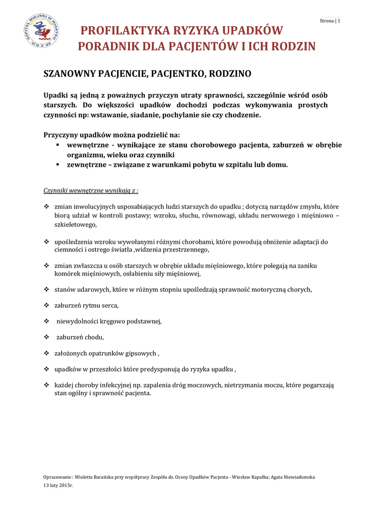 PROFILAKTYKA RYZYKA UPADKÓW PORADNIK DLA PACJENTÓW I ICH RODZIN Strona | 1 SZANOWNY PACJENCIE, PACJENTKO, RODZINO Upadki są jedną z poważnych przyczyn utraty sprawności, szczególnie wśród osób starszych. Do większości upadków dochodzi podczas wykonywania prostych czynności np: wstawanie, siadanie, pochylanie sie czy chodzenie. Przyczyny upadków można podzielić na: wewnętrzne - wynikające ze stanu chorobowego pacjenta, zaburzeń w obrębie organizmu, wieku oraz czynniki zewnętrzne – związane z warunkami pobytu w szpitalu lub domu. Czynniki wewnętrzne wynikają z : zmian inwolucyjnych usposabiających ludzi starszych do upadku ; dotyczą narządów zmysłu, które biorą udział w kontroli postawy; wzroku, słuchu, równowagi, układu nerwowego i mięśniowo – szkieletowego, upośledzenia wzroku wywołanymi różnymi chorobami, które powodują obniżenie adaptacji do ciemności i ostrego światła ,widzenia przestrzennego, zmian zwłaszcza u osób starszych w obrębie układu mięśniowego, które polegają na zaniku komórek mięśniowych, osłabieniu siły mięśniowej, stanów udarowych, które w różnym stopniu upośledzają sprawność motoryczną chorych, zaburzeń rytmu serca, niewydolności kręgowo podstawnej, zaburzeń chodu, założonych opatrunków gipsowych , upadków w przeszłości które predysponują do ryzyka upadku , każdej choroby infekcyjnej np. zapalenia dróg moczowych, nietrzymania moczu, które pogarszają stan ogólny i sprawność pacjenta. Opracowanie : Wioletta Barańska przy współpracy Zespółu ds. Oceny Upadków Pacjenta - Wiesław Kapałka; Agata Niewiadomska 13 luty 2015r. Strona | 2 PROFILAKTYKA RYZYKA UPADKÓW PORADNIK DLA PACJENTÓW I ICH RODZIN I. PROFILAKTYKA RYZYKA POBYTU W SZPITALU UPADKÓW PACJENTÓW PODCZAS Używaj stabilnego obuwia na płaskim obcasie, Unikaj śliskich i mokrych powierzchni, Zwracaj uwagę na znaki ostrzegawcze wskazujace mokrą podłogę, Przestrzegaj zaleceń personelu (zakazu chodzenia, nakazu chodzenia wg wyuczonego przez rehabilitanta schematu), Jeżeli masz trudności z poruszaniem się, wychodzac do toalety pamiętaj o kulach, balkoniku, poproś rehabilitanta, pielegniarkę, rodzinę o pomoc, Zachowaj ostrożność podczas chodzenia w okolicy drzwi otwierających się na zewnątrz, Podczas leżenia w łóżku nie wychylaj sie po przedmioty leżące na podlodze, wezwij dzwonkiem personel, Podczas kąpieli w łazience korzystaj z dostępnego w oddziale wózka toaletowego lub wykonaj kąpiel z pomocą innych osób ( pielęgniarka, rodzina itp), W przypadku wystąpienia zawrotów głowy powiadom pielęgniarkę, Po dłuższym leżeniu w łóżku, wstawaj z łóżka stopniowo tj: usiądź na łóżku, opuść nogi, powoli wstań. W przypadku trudności z chodzeniem po wypisie poproś o wózek inwalidzki w celu odwiezienia do samochodu. Opracowanie : Wioletta Barańska przy współpracy Zespółu ds. Oceny Upadków Pacjenta - Wiesław Kapałka; Agata Niewiadomska 13 luty 2015r. Strona | 3 PROFILAKTYKA RYZYKA UPADKÓW PORADNIK DLA PACJENTÓW I ICH RODZIN I. ZAPOBIEGANIE UPADKOM W DOMU Poniższe porady zawierają przykładowe możliwości zabezpieczające osobę starszą, niepełnosprawną przed upadkiem. Do Państwa decyzji pozostawiamy, które z nich są możliwe do wprowadzenia w domu. Czynniki zewnętrze środowiskowe predysponujące do wystąpienia upadków, związane są z otoczeniem w którym przebywa pacjent. Na upadki może mieć wpływ brak poręczy, uchwytów, nierówna podłoga, ślizga podłoga w łazience oddziału, oświetlenie, brak balkoników oraz wiele innych. Aby zminimalizować upadki w środowisku domowym należy przestrzegać poniższych wskazówek: 1. Usuń zbędne rzeczy, przedmioty, które mogą być przeszkodami, 2. Trzymaj przedmioty, których często używasz w miejscach łatwo dostępnych, do których możesz sięgnąć bez wspinania się, zawsze zamykaj szafki i szuflady, aby się nie potknąć I nie przewrócić się, 3. Pozbądź się podartych, pofałdowanych dywaników, chodniczków i mat, 4. Meble w pomieszczeniach miej stabilne, fotele i krzesła z poręczami, wydłużone do przodu, abyś mógł się bezpiecznie o nie wesprzeć, unikaj krzeseł z kółkami i niestabilnymi nogami, 5. Unikaj śliskiej, mokrej i wypastowanej podłogi, utrzymuj suchą podłogę po kąpieli, zastosuj matę antypoślizgową, zabezpiecz ją tak, aby zmniejszyć ryzyko potknięcia się o nią, 6. Usuń meble z miejsc utrudniających przejście, nie zastawiaj korytarzy, 7. Dbaj o umiarkowane ogrzewanie (nie może być ani zbyt chłodno ani zbyt gorąco), 8. Przewody elektryczne chowaj pod meblami lub listwami przypodłogowymi, 9. Zwróć uwagę na zwierzęta domowe, sprawdź gdzie one są, 10. Przy telefonie trzymaj numery alarmowe napisane dużą czcionką, 11. Zawsze miej telefon w zasięgu ręki, używaj przenośnego telefonu i miej przy sobie Opracowanie : Wioletta Barańska przy współpracy Zespółu ds. Oceny Upadków Pacjenta - Wiesław Kapałka; Agata Niewiadomska 13 luty 2015r. Strona | 4 PROFILAKTYKA RYZYKA UPADKÓW PORADNIK DLA PACJENTÓW I ICH RODZIN numery telefonów alarmowych, 12. W nocy pozostaw włączone światło w przedpokoju, 13. Ogranicz oślepiające światło słoneczne za pomocą zasłon lub żaluzji okiennych, 14. Kontroluj swoje lekarstwa, używając leków bez recepty, zapytaj farmaceutę lub lekarza o skutki uboczne, ponieważ niektóre powodują senność lub zawroty głowy, co sprzyja upadkom. 15. Poproś bliskich o asystowanie w czasie kąpiel, w wannie lub w kabinie prysznicowej połóż na stałe matę antypoślizgową, jeśli mimo to nie czujesz się pewnie zastosuj podczas kąpieli krzesło lub siedzisko kąpielowe, ręczny zestaw prysznicowy, 16. Nigdy nie przytrzymuj się stojaka na ręcznik, podstawki na mydło, półek, czy innych przedmiotów, które nie są wmontowane w ścianę, 17. Zainstaluj podwyższony sedes, 18. Nie zamykaj się w łazience, 