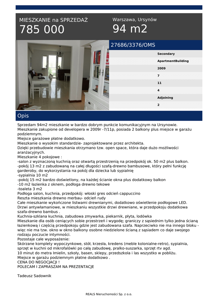 MIESZKANIE na SPRZEDAŻ 785 000 Warszawa, Ursynów 94 m2 27686/3376/OMS Secondary ApartmentBuilding 2009 7 11 4 Adjoining 2 Opis Sprzedam 94m2 mieszkanie w bardzo dobrym punkcie komunikacyjnym na Ursynowie. Mieszkanie zakupione od developera w 2009r -7/11p, posiada 2 balkony plus miejsce w garażu podziemnym. Miejsce garażowe płatne dodatkowo. Mieszkanie o wysokim standardzie- zaprojektowane przez architekta. Dzięki przebudowie mieszkania otrzymano tzw. open space, która daje dużo możliwości aranżacyjnych. Mieszkanie 4 pokojowe : -salon z wyznaczoną kuchnią oraz otwartą przestrzenią na przedpokój ok. 50 m2 plus balkon. -pokój 13 m2 z zabudowaną na całej długości szafą-drewno bambusowe, który pełni funkcję garderoby, do wykorzystania na pokój dla dziecka lub sypialnię -sypialnia 10 m2 -pokój 15 m2 bardzo doświetlony, na każdej ścianie okna plus dodatkowy balkon -10 m2 łazienka z oknem, podłoga drewno tekowe -toaleta 3 m2 Podłoga salon, kuchnia, przedpokój: włoski gres odcień cappuccino Reszta mieszkania drewno merbau- odcień rudy Całe mieszkanie wykończone listwami drewnianymi, dodatkowo oświetlenie podłogowe LED. Drzwi antywłamaniowe, w mieszkaniu wszystkie drzwi drewniane, w przedpokoju dodatkowa szafa-drewno bambus . Kuchnia-szklana kuchnia, zabudowa zmywarka, piekarnik, płyta, lodówka Mieszkanie dla osób ceniących sobie przestrzeń i wygodę; graniczy z sąsiednim tylko jedna ścianą łazienkową i częścią przedpokoju gdzie jest zabudowana szafa. Naprzeciwko nie ma innego bloku więc nie ma tzw. okno w okno balkony osobne niedzielone ścianą z sąsiadem co daje swojego rodzaju poczucie intymności. Pozostaje całe wyposażenie: Skórzane komplety wypoczynkowe, stół, krzesła, kredens (meble kolonialne-retro), sypialnia, sprzęt w kuchni od mikrofalówki po całą zabudowę, pralko-suszarka, sprzęt rtv agd. 10 minut do metra Imielin, szkoły, basen, sklepy, przedszkola i las wszystko w pobliżu. Miejsce w garażu podziemnym płatne dodatkowo . CENA DO NEGOCJACJI ! POLECAM I ZAPRASZAM NA PREZENTACJE Tadeusz Sadownik REALS Nieruchomości Sp. z o.o. Doradca ds. nieruchomości Oddział Tadeusz Sadownik tel. 534 888 810 tel. 22 829 92 10 email: [email protected] REALS Nieruchomości Sp. z o.o. Powered by TCPDF (www.tcpdf.org)