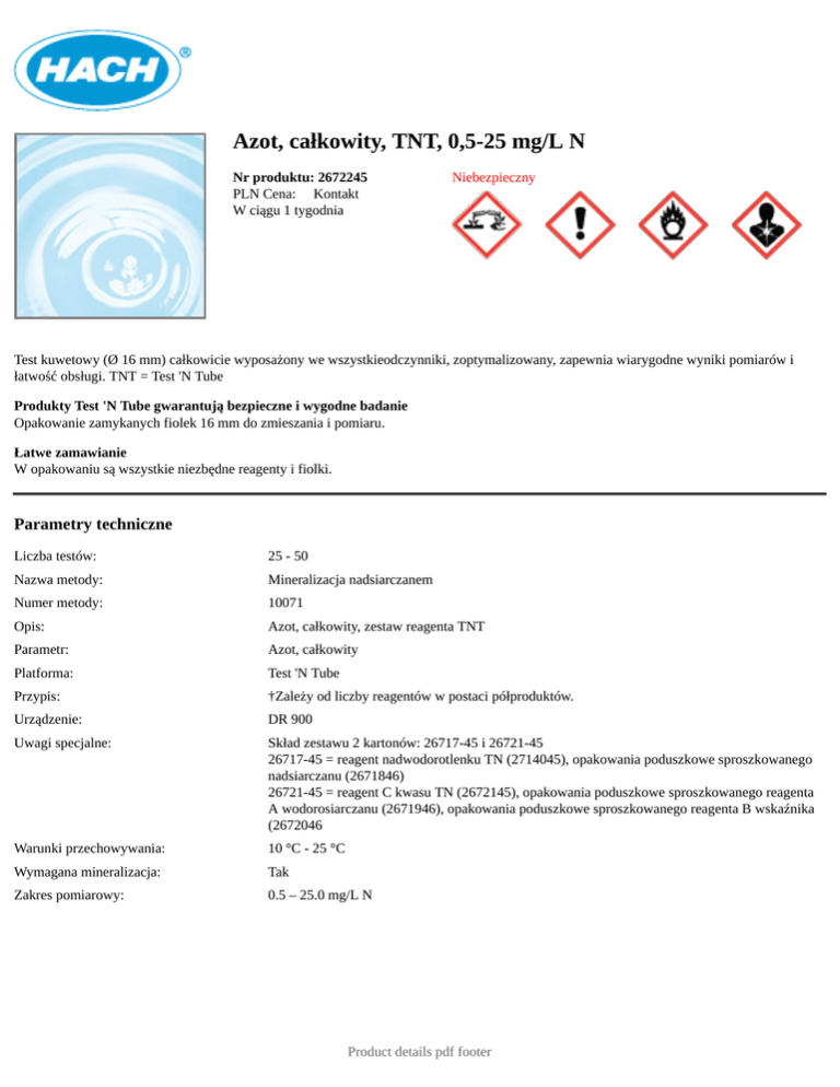 Azot, całkowity, TNT, 0,5-25 mg/L N Nr produktu: 2672245 PLN Cena: Kontakt W ciągu 1 tygodnia Niebezpieczny Test kuwetowy (Ø 16 mm) całkowicie wyposażony we wszystkieodczynniki, zoptymalizowany, zapewnia wiarygodne wyniki pomiarów i łatwość obsługi. TNT = Test 'N Tube Produkty Test 'N Tube gwarantują bezpieczne i wygodne badanie Opakowanie zamykanych fiolek 16 mm do zmieszania i pomiaru. Łatwe zamawianie W opakowaniu są wszystkie niezbędne reagenty i fiolki. Parametry techniczne Liczba testów: 25 - 50 Nazwa metody: Mineralizacja nadsiarczanem Numer metody: 10071 Opis: Azot, całkowity, zestaw reagenta TNT Parametr: Azot, całkowity Platforma: Test 'N Tube Przypis: †Zależy od liczby reagentów w postaci półproduktów. Urządzenie: DR 900 Uwagi specjalne: Skład zestawu 2 kartonów: 26717-45 i 26721-45 26717-45 = reagent nadwodorotlenku TN (2714045), opakowania poduszkowe sproszkowanego nadsiarczanu (2671846) 26721-45 = reagent C kwasu TN (2672145), opakowania poduszkowe sproszkowanego reagenta A wodorosiarczanu (2671946), opakowania poduszkowe sproszkowanego reagenta B wskaźnika (2672046 Warunki przechowywania: 10 °C - 25 °C Wymagana mineralizacja: Tak Zakres pomiarowy: 0.5 – 25.0 mg/L N Product details pdf footer