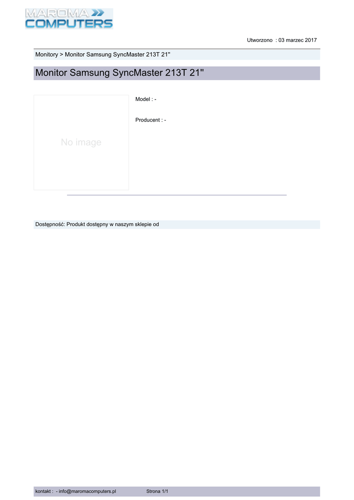 Utworzono : 03 marzec 2017 Monitory > Monitor Samsung SyncMaster 213T 21'' Monitor Samsung SyncMaster 213T 21'' Model : - s r te Producent : - No image C a Dostępność: Produkt dostępny w naszym sklepie od m ro a M kontakt : - [email protected] Strona 1/1 m o u p