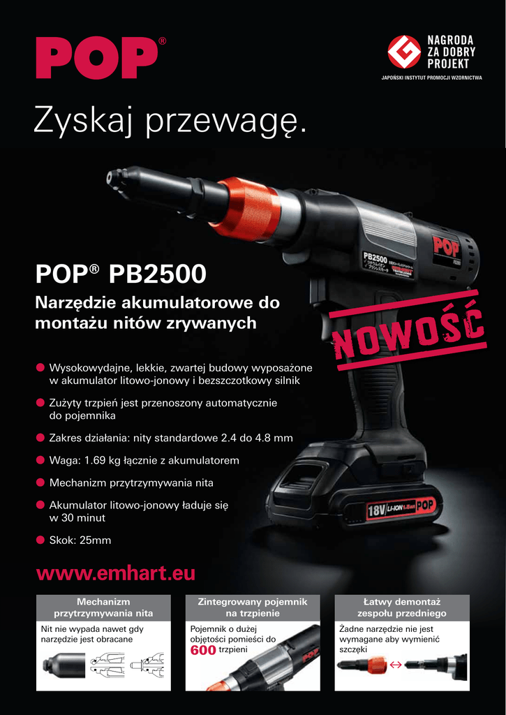 Nagroda za dobry projekt Japoński Instytut Promocji Wzornictwa Zyskaj przewagę. POP® PB2500 Narzędzie akumulatorowe do montażu nitów zrywanych Wysokowydajne, lekkie, zwartej budowy wyposażone w akumulator litowo-jonowy i bezszczotkowy silnik Zużyty trzpień jest przenoszony automatycznie do pojemnika Zakres działania: nity standardowe 2.4 do 4.8 mm Waga: 1.69 kg łącznie z akumulatorem Mechanizm przytrzymywania nita Akumulator litowo-jonowy ładuje się w 30 minut Skok: 25mm Mechanizm przytrzymywania nita Nit nie wypada nawet gdy narzędzie jest obracane Zintegrowany pojemnik na trzpienie Pojemnik o dużej objętości pomieści do 600 trzpieni Łatwy demontaż zespołu przedniego Żadne narzędzie nie jest wymagane aby wymienić szczęki PB2500 Narzędzie akumulatorowe do montażu nitów zrywanych Parametry Wymiary: Akumulator: Ładowarka: Skok: Poziom hałasu: Siła zaciągania: Zakres: Waga: 320mm (L) x 240mm (H) 18V Litowo-Jonowy 1.5 Ah cienki (POP® EBC181-QW) czas ładowania 30 minut 20V dla akum. Lit.-Jon. (POP® EBC105-QW) z kontrolką postępu ładowania 25mm 73.7 dB(A) 8.500 N nity standardowe 2.4 do 4.8mm 1.69 kg łącznie z akumulatorem Duża szybkość montażu Niższe zużycie energii Przy montażu nitów stalowych POP® 4.8mm Przy montażu nitów stalowych POP® 4.8mm POP® PB2500 1.5s / nit POP® PB2500 14.4 kW / rok Narzędzie akumulatorowe Firmy A 1.9s / nit Narzędzie akumulatorowe Firmy A 18.0 kW / rok Narzędzie akumulatorowe Firmy B 2.1s / nit Narzędzie akumulatorowe Firmy B 83.2 kW / rok 1 1.5 2 2.5 (s.) * Rezultaty oparte o badania własne Emhart * Przyjęto 480 000 zamocowań na rok Wydłużona żywotność akumulatora Długi skok Przy montażu nitów stalowych POP® 4.8mm Dla nitów POP® 2.4 do 4.8mm POP® PB2500 900 zamocowań na jedno ładowanie POP® PB2500 25 mm Narzędzie akumulatorowe Firmy A 500 zamocowań na jedno ładowanie Narzędzie akumulatorowe Firmy A 20 mm Narzędzie akumulatorowe Firmy B 90 zamocowań na jedno ładowanie Narzędzie akumulatorowe Firmy B 20 mm 0 500 1000 * Rezultaty oparte o badania własne Emhart * Ilość zamocowań dla w pełni naładowanego akumulatora Emhart Teknologies 6743/PL/1112 0 * Rezultaty oparte o badania własne Emhart * Cykl mierzony od naciśnięcia spustu do pełnej gotowości do montażu kolejnego nita Masterfix Poland 60-124 Poznań ul. Daleka 16 Polska Tel: +48 61 866 62 97 Fax: +48 61 866 57 33 10 * Rezultaty oparte o badania własne Emhart 20 40 60 20 80 100 (kW) 30 (mm)