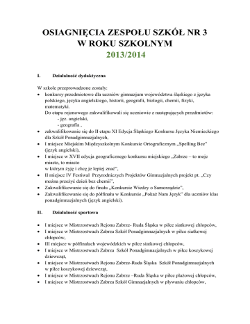 OSIAGNIĘCIA ZESPOŁU SZKÓŁ NR 3 W ROKU SZKOLNYM 2013/2014 I. Działalność dydaktyczna W szkole przeprowadzone zostały: konkursy przedmiotowe dla uczniów gimnazjum województwa śląskiego z języka polskiego, języka angielskiego, historii, geografii, biologii, chemii, fizyki, matematyki. Do etapu rejonowego zakwalifikowali się uczniowie z następujących przedmiotów: - jęz. angielski, - geografia , zakwalifikowanie się do II etapu XI Edycja Śląskiego Konkursu Języka Niemieckiego dla Szkół Ponadgimnazjalnych, I miejsce Miejskim Międzyszkolnym Konkursie Ortograficznym „Spelling Bee” (język angielski), I miejsce w XVII edycja geograficznego konkursu miejskiego „Zabrze – to moje miasto, to miasto w którym żyję i chcę je lepiej znać”, II miejsce IV Festiwal Przyrodniczych Projektów Gimnazjalnych projekt pt. „Czy można przeżyć dzień bez chemii”, Zakwalifikowanie się do finału „Konkursie Wiedzy o Samorządzie”, Zakwalifikowanie się do półfinału w Konkursie „Pokaż Nam Język” dla uczniów klas ponadgimnazjalnych (język angielski). II. Działalność sportowa I miejsce w Mistrzostwach Rejonu Zabrze- Ruda Śląska w piłce siatkowej chłopców, I miejsce w Mistrzostwach Zabrza Szkół Ponadgimnazjalnych w piłce siatkowej chłopców, III miejsce w półfinałach wojewódzkich w piłce siatkowej chłopców, I miejsce w Mistrzostwach Zabrza Szkół Ponadgimnazjalnych w piłce koszykowej dziewcząt, I miejsce w Mistrzostwach Rejonu Zabrze-Ruda Śląska Szkół Ponadgimnazjalnych w piłce koszykowej dziewcząt, I miejsce w Mistrzostwach Rejonu Zabrze –Ruda Śląska w piłce plażowej chłopców, I miejsce w Mistrzostwach Zabrza Szkół Gimnazjalnych w pływaniu chłopców, II miejsce w Mistrzostwach Zabrza Szkół Ponadgimnazjalnych w piłce ręcznej chłopców, II miejsce w Mistrzostwach Zabrza Szkół Ponadgimnazjalnych w tenisie stołowym chłopców, II miejsce w lidze trampkarzy podokręgu Zabrze –piłka nożna, III miejsce w Mistrzostwach Zabrza Szkół Gimnazjalnych w tenisie stołowym dziewcząt, III miejsce Konkurs wiedzy o Górniku Zabrze –etap miejski, III. Działalność europejska Realizacja projektu eTwinning pt.: „Deutsch rund um das Jahr”, Certyfikat – Star Projekt potwierdzający najwyższą jakość projektu edukacyjnego w programie „Uczenie się przez całe życie” – Comenius, uznanego przez Komisję Europejską za przykład dobrej praktyki w ramach międzynarodowego projektu EuropeanSharedTreasure dla Zespołu Szkół Nr 3 za zrealizowanie projektu zatytułowanego „YouCan’tTeachanOld Dog New Tricks, orCanYou…?” – Fundacja Rozwoju Systemu Edukacji - 2013r., Realizacja nowego programu Comenius „Science AroundUsAlongHistory – SARAH (Nauka wokół nas poprzez historię)”. III. Działalność kulturalna I miejsce w konkursie XXI Tygodnia Ziemi – projekt znaczka pocztowego, Wyróżnienie konkursie na etiudę filmową "Jedź, idź, żyj" organizowany jest przez Wojewodę Śląskiego, Wydział Ruchu Drogowego Komendy Wojewódzkiej Policji w Katowicach, Śląskie Kuratorium Oświaty, Wyróżnienie VII edycja konkursu plastycznego „Odkrywamy czystą Polskę” w ramach akcji Sprzątanie Świata 2013 – Czyste Zabrze”, Wyróżnienie w „Miejski konkurs piosenki angielskiej”, II miejsce w konkursie informatycznym na plakat „Klimatyczne dylematy", XXI Tydzień Ziemi, konkurs wojewódzki, organizator Muzeum Górnictwa Węglowego w Zabrzu, Wyróżnienie w konkursie informatycznym na plakat „Klimatyczne dylematy", XXI Tydzień Ziemi, konkurs wojewódzki, organizator Muzeum Górnictwa Węglowegow Zabrzu. Wyróżnienie w konkursie informatyczny na stronę internetową pt. „W trosce o klimat.Inicjatywy lokalne i decyzje indywidualne", XXI Tydzień Ziemi, konkurs wojewódzki, organizator Muzeum Górnictwa Węglowego w Zabrzu, V. Inna działalność Wyróżnienie dla Zespołu Szkół Nr 3 za kultywowanie pamięci o rotmistrzu Witoldzie Pileckim od Ministra Obrony Narodowej Rzeczpospolitej Polskiej Tomasza Siemoniaka – 14 luty 2014r. Wyróżnienie przez Firmę Reba z Warszawy za ogólnoszkolną zbiórkę baterii Wyróżnienie Muzeum Górnictwa Węglowego w Zabrzu dla Zespołu Szkół Nr 3 za udział w konkursach w ramach obchodów „XXI Tygodnia Ziemi” - 24.04.2014r., Organizacja międzyszkolnego konkursu „STAN WOJENNY - represje wobec społeczeństwa polskiego od 1981-1983 roku”( przygotowanie dokumentacji, materiałów tekstowych i audiowizualnych,przeprowadzenie konkursu)-grudzień 2013 Współpraca klas dziennikarskich XI Liceum Ogólnokształcącego z Głosem Zabrza i Rudy Ślaskiej”, Wyższą Szkołą Handlową w Chorzowie, Telewizją Zabrzańską GTV, Akcja „BIEGAJ Z PILECKIM” i wyjazd na maraton do Hamburga , W tamach obchodów dnia patrona szkoły zorganizowano „Wielki Szkolny Maraton Biegaj z Pileckim", spotkanie młodzieży z Krzysztofem Krysienielem, pracownikiem Wyższej Szkoły Bankowej Poznaniu i należącym do grupy Team Europe w ramach szkolnych obchodów 10 rocznicy przystąpienia Polski do UE, Uroczystości poświęcone Narodowemu Dniu Pamięci Żołnierzy Wyklętych m.in. spotkanie młodzieży z zaproszonym gościem – Maciejem Wojciechowskim z Fundacji Centrum Dokumentacji Czynu Niepodległościowego z Krakowa, Spotkanie z Jerzym Wartakiembyłym - działaczem „Solidarności” i jednym z liderów spacyfikowanego przez ZOMO 14-16 grudnia 1981 r. strajku w KWK „Wujek”.