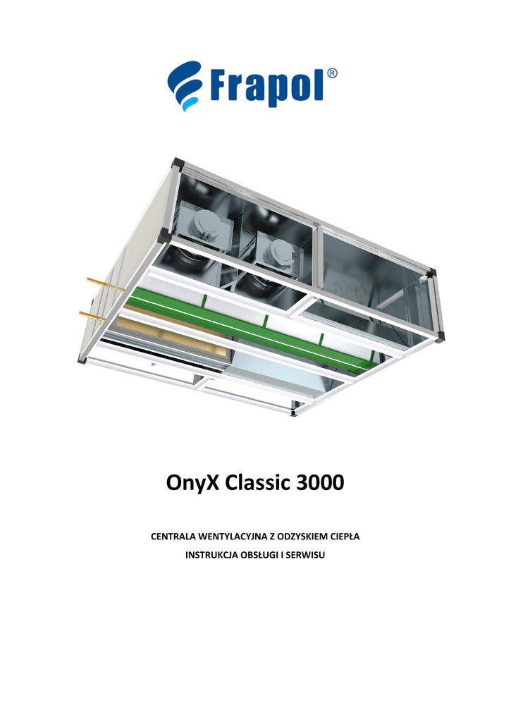 OnyX Classic 3000 CENTRALA WENTYLACYJNA Z ODZYSKIEM CIEPŁA INSTRUKCJA OBSŁUGI I SERWISU DTR CENTRALI WENTYLACYJNEJ OnyX Classic 3000 Spis treści 1. INFORMACJE TECHNICZNE ...................................................................................... 4 1.1 RYSUNKI URZĄDZENIA................................................................................................. 4 1.2 TABELE I WYKRESY .................................................................................................. 6 1.3 POBÓR ENERGII ELEKTRYCZNEJ ORAZ POZIOM MOCY AKUSTYCZNEJ URZĄDZENIA... 7 1.4 DANE TECHNICZNE.................................................................................................. 8 2. MONTAŻ REKUPERATORA ....................................................................................... 9 2.1 INSTALACJA CENTRALI............................................................................................. 9 2.2 PODŁĄCZENIE KANAŁÓW WENTYLACYJNYCH ..............................................................11 2.5 2.3 MONTAŻ STEROWNIKA ..........................................................................................12 2.4 PODŁĄCZENIE ZASILANIA .......................................................................................12 SCHEMAT ELEKTRYCZNY CENTRALI ONYX - SZCZEGÓŁOWY OPIS ZNAJDUJE SIĘ W ZAŁĄCZNIKU NR 1 - SPECYFIKACJA MODUŁÓW FR-04-A-V3.0 ORAZ FR-04-B-V3.0 ..................................13 2.6 PODŁĄCZENIE NAGRZEWNIC ZEWNĘTRZNYCH........................................................14 3EKSPLOATACJA ...............................................................................................................14 3.1 SYSTEM ZAPOBIEGAJĄCY SZRONIENIU ...................................................................14 3.2 WSPÓŁPRACA Z NAGRZEWNICĄ KANAŁOWĄ .........................................................15 4. INSTRUKCJA OBSŁUGI STEROWNIKA CENTRALI.......................................................15 4.1 PODSTAWOWE CECHY STEROWNIKA: .....................................................................15 4.2 SYGNALIZACJA ORAZ PODSTAWOWE KLAWISZE FUNKCYJNE ...................................16 4.3 FUNKCJE STEROWNIKA ..........................................................................................18 4.3.1 USTAWIENIE INTENSYWNOŚCI WENTYLACJI – STRUMIENI POWIETRZA ....................18 4.3.2 PODGLĄD TEMPERATUR URZĄDZENIA ...................................................................21 4.3.3 STEROWANIE PRACĄ NAGRZEWNICY KANAŁOWEJ .................................................22 4.3.4 STEROWANIE PRACĄ CHŁODNICY KANAŁOWEJ ......................................................23 4.3.5 STEROWANIE PRACĄ OBEJŚCIA WYMIENNIKA ........................................................24 4.3.6 STEROWANIE PRACĄ WYMIENNIKA GRUNTOWEGO ...............................................25 4.3.7 STEROWANIE PRACĄ URZĄDZENIA W FUNKCJI ZAWARTOŚCI W POWIETRZU CO2 I WILGOCI 4.3.8 CZYSZCZENIE WYMIENNIKA ...................................................................................26 4.3.9 USTAWIENIA OGÓLNE ............................................................................................27 4.4 DANE TECHNICZNE STEROWNIKA ...........................................................................28 5. CZYNNOŚCI SERWISOWE .......................................................................................28 5.1 KONTROLA STANU FILTRÓW ...................................................................................28 5.2 KONTROLA ODPŁYWU KONDENSATU .....................................................................30 5.3 CZYSZCZENIE I KONSERWACJA ................................................................................30 5.4 WYŁĄCZENIE ODZYSKU CIEPŁA ...............................................................................31 5.5 DEMONTAŻ URZĄDZENIA .......................................................................................31 6. WARUNKI GWARANCJI ..........................................................................................31 2 Firma Frapol zastrzega sobie prawo do wprowadzenia zmian Wer.06-2016 25 DTR CENTRALI WENTYLACYJNEJ OnyX Classic 3000 WPROWADZENIE Rekuperator OnyX Classic 3000 jest urządzeniem stanowiącym główny element systemu wentylacji nawiewno-wywiewnej z odzyskiem ciepła. Zapewnia on ciągły dopływ świeżego powietrza do pomieszczeń mieszkalnych, usuwając jednocześnie powietrze zużyte, redukując przy tym poziom dwutlenku węgla oraz wilgoci. Poprzez ciągłą filtrację zapobiega ponadto wszelkim reakcjom alergicznym, spowodowanym wnikaniem pyłków (alergenów), a także rozwojowi wirusów, bakterii i grzybów. Kontroler urządzenia został zaprojektowany z myślą o zminimalizowaniu kosztów wentylacji (tryb automatyczny) oraz niezawodnym działaniu. Duży, czytelny wyświetlacz LCD oraz łatwość obsługi czyni go przyjaznym dla użytkownika, a zoptymalizowany algorytm sterowania i dynamiczny tryb wyświetlania, podnoszą poziom komfortu stosowania urządzenia. Dziękujemy za wybór centrali OnyX Classic 3000 do Swojego systemu wentylacyjnego. Producent: FRAPOL Sp. z o.o. ul. Mierzeja Wiślana 8, 30-832 Kraków tel. [+48] 12 653 27 66 fax [+48] 12 653 27 89 www.frapol.com.pl e-mail: [email protected] Spółka zarejestrowana w Sądzie Rejonowym dla Krakowa Śródmieścia w Krakowie KRS:0000035090 NIP: 679-00-85-168 Kapitał zakładowy 2.082.500 zł Serwis: FRAPOL Sp. z o.o. ul. Mierzeja Wiślana 8, 30-832 Kraków tel. [+48] 12 653 27 66 wew. 135 Tel. Kom. +48 691 802 803 e-mail: [email protected] 3 Firma Frapol zastrzega sobie prawo do wprowadzenia zmian Wer.06-2016 DTR CENTRALI WENTYLACYJNEJ OnyX Classic 3000 1. Informacje techniczne Niniejszy rozdział zawiera informacje techniczne, pomocne podczas procesu projektowania instalacji wentylacyjnej z udziałem rekuperatora OnyX Classic 3000, a także dane dotyczące bezpieczeńs