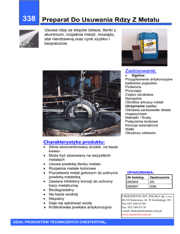 338 Preparat Do Usuwania Rdzy Z Metalu Usuwa rdzę ze stopów żelaza, tlenki z aluminium, rozjaśnia miedź, mosiądz, stal nierdzewną oraz cynk szybko i bezpiecznie. Zastosowanie: • Ogólne: Przygotowanie antykorozyjne kadłubów pojazdów Podwozia Przyrządy Części obrabiane Narzędzia Obróbka arkuszy metali Utrzymanie ruchu: Odnawia zardzewiałe detale magazynowe Nakrętki / Śruby Połączenia śrubowe Korozja wewnętrzna Wałki Obudowy odlewów Charakterystyka produktu: • Silnie skoncentrowany środek, na bazie kwasu • Może być stosowany na wszystkich metalach • Usuwa powłokę tlenku metalu • Rozjaśnia metale kolorowe • Pozostawia metal gotowym do pokrycia powłoką malarską • Zawiera inhibitory korozji do ochrony bazy metalicznej • Biodegradalny • Na bazie wodnej • Niepalny • Daje się spłukiwać wodą ♦ Krótkotrwała powłoka antykorozyjna DZIAŁ PRODUKTÓW TECHNICZNYCH CHESTERTON OPAKOWANIA: Nr katalog. 085904 085907 Opakowanie 20l. 208l. CHESTERTON INT. POLSKA Sp. z o.o. 40-153 Katowice, Al. W Korfantego 191 Tel. 032-249-52-90 Fax. 032-249-53-70 e-mail: [email protected] www.chesterton.com.pl