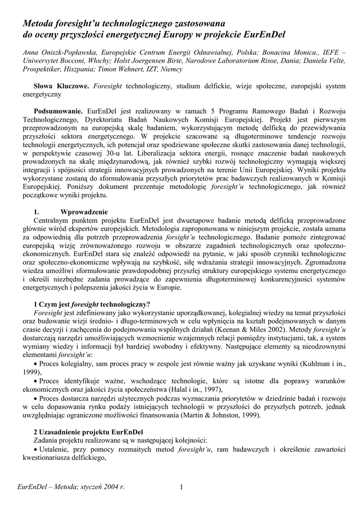 Metoda foresight’u technologicznego zastosowana do oceny przyszłości energetycznej Europy w projekcie EurEnDel Anna Oniszk-Popławska, Europejskie Centrum Energii Odnawialnej, Polska; Bonacina Monica., IEFE – Uniwersytet Bocconi, Włochy; Holst Joergensen Birte, Narodowe Laboratorium Risoe, Dania; Daniela Velte, Prospektiker, Hiszpania; Timon Wehnert, IZT, Niemcy Słowa Kluczowe. Foresight technologiczny, studium delfickie, wizje społeczne, europejski system energetyczny Podsumowanie. EurEnDel jest realizowany w ramach 5 Programu Ramowego Badań i Rozwoju Technologicznego, Dyrektoriatu Badań Naukowych Komisji Europejskiej. Projekt jest pierwszym przeprowadzonym na europejską skalę badaniem, wykorzystującym metodę delficką do przewidywania przyszłości sektora energetycznego. W projekcie szacowane są długoterminowe tendencje rozwoju technologii energetycznych, ich potencjał oraz spodziewane społeczne skutki zastosowania danej technologii, w perspektywie czasowej 30-u lat. Liberalizacja sektora energii, rosnące znaczenie badań naukowych prowadzonych na skalę międzynarodową, jak również szybki rozwój technologiczny wymagają większej integracji i spójności strategii innowacyjnych prowadzonych na terenie Unii Europejskiej. Wyniki projektu wykorzystane zostaną do sformułowania przyszłych priorytetów prac badawczych realizowanych w Komisji Europejskiej. Poniższy dokument prezentuje metodologię foresight’u technologicznego, jak również początkowe wyniki projektu. 1. Wprowadzenie Centralnym punktem projektu EurEnDel jest dwuetapowe badanie metodą delficką przeprowadzone głównie wśród ekspertów europejskich. Metodologia zaproponowana w niniejszym projekcie, została uznana za odpowiednią dla potrzeb przeprowadzenia forsight’u technologicznego. Badanie pomoże zintegrować europejską wizję zrównoważonego rozwoju w obszarze zagadnień technologicznych oraz społecznoekonomicznych. EurEnDel stara się znaleźć odpowiedź na pytanie, w jaki sposób czynniki technologiczne oraz społeczno-ekonomiczne wpływają na szybkość, siłę wdrażania strategii innowacyjnych. Zgromadzona wiedza umożliwi sformułowanie prawdopodobnej przyszłej struktury europejskiego systemu energetycznego i określi niezbędne zadania prowadzące do zapewnienia długoterminowej konkurencyjności systemów energetycznych i polepszenia jakości życia w Europie. 1 Czym jest foresight technologiczny? Foresight jest zdefiniowany jako wykorzystanie uporządkowanej, kolegialnej wiedzy na temat przyszłości oraz budowanie wizji średnio- i długo-terminowych w celu wpłynięcia na kształt podejmowanych w danym czasie decyzji i zachęcenia do podejmowania wspólnych działań (Keenan & Miles 2002). Metody foresight’u dostarczają narzędzi umożliwiających wzmocnienie wzajemnych relacji pomiędzy instytucjami, tak, a system wymiany wiedzy i informacji był bardziej swobodny i efektywny. Następujące elementy są nieodzownymi elementami foresight’u: • Proces kolegialny, sam proces pracy w zespole jest równie ważny jak uzyskane wyniki (Kuhlman i in., 1999), • Proces identyfikuje ważne, wschodzące technologie, które są istotne dla poprawy warunków ekonomicznych oraz jakości życia społeczeństwa (Halal i in., 1997), • Proces dostarcza narzędzi użytecznych podczas wyznaczania priorytetów w dziedzinie badań i rozwoju w celu dopasowania rynku podaży istniejących technologii w przyszłości do przyszłych potrzeb, jednak uwzględniając ograniczone możliwości finansowania (Martin & Johnston, 1999). 2 Uzasadnienie projektu EurEnDel Zadania projektu realizowane są w następującej kolejności: • Ustalenie, przy pomocy rozmaitych metod foresight’u, ram badawczych i określenie zawartości kwestionariusza delfickiego, EurEnDel – Metoda; styczeń 2004 r. 1 • Opracowanie scenariuszy przyszłości łączących w sobie elementy technologiczne i społecznoekonomiczne na podstawie uzyskanych rezultatów badania delfickiego, • Sformułowanie rekomendacji dla przyszłych priorytetów badań i rozwoju w rozszerzonej Unii Europejskiej. Pierwszy etap badania obejmował opracowanie kwestionariusza delfickiego, tj. ankiety internetowej przeznaczonej dla ekspertów i badającej ich opinię na temat, miejsca oraz sposobu realizacji oczekiwanych kolejnych etapów rozwoju technologicznego w sektorze energetycznym, jak również odnośnie prawdopodobieństwa wystąpienia powiązanych poszczególnych wizji społeczno-ekonomicznych. Wspomniany kwestionariusz składa się z dwóch części: 1. Klasyczne tezy delfickie dotyczące rozwoju technologii, 2. Pytania dotyczące zagadnień społeczno-ekonomicznych (wizje społeczne). W każdej części posłużono się innymi metodami w celu zdefiniowania i określenia zakresu merytorycznego kwestionariusza. Poniżej opisano dokładniej kolejne etapy badania EurEnDel. 3 Ustalenie ram badawczych i określenie zawartości kwestionariusza delfickiego Oprócz klasycznych tez delfickich dotyczących rozwoju technologii w projekcie występuje również drugi równie ważny element: wizje społeczno-ekonomiczne. Obie perspektywy (społeczno-ekonomiczną i technologiczną) należy uwzględniać już w początkowej fazie projektu. Wpływ zagadnień społeczno-ekonomicznych na sektor energetyki jest łatwiejszy do zrozumienia, jeśli badanie rozpocznie się od analizy popytu na energię. Stąd, podczas początkowego zdobywania informacji oraz tzw. „burzy mózgów” skupiono się na czynnikach, wywierających wpływ na popyt na energię w Europie (UE25) do roku 2030. Strona podażowa była rozpatrywana głównie w ujęciu zaspokojenia przewidywanego przyszłego popytu na energię, który może się różnić od aktualnego. Drugim niezbędnym elementem było stworzenie wspólnych ram dla poszczególnych obszarów analizy kluczowych elementów, w celu: 1.określenia kluczowych czynników dla przyszłego rozwoju europejskiego systemu en