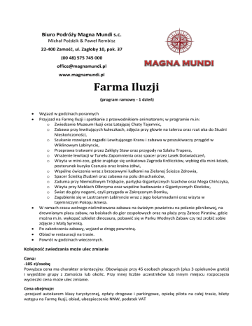 Biuro Podróży Magna Mundi s.c. Michał Poździk & Paweł Rembisz 22-400 Zamość, ul. Zagłoby 10, pok. 37 (00 48) 575 745 000 [email protected] www.magnamundi.pl Farma Iluzji (program ramowy - 1 dzień) Wyjazd w godzinach porannych Przyjazd na Farmę Iluzji i spotkanie z przewodnikiem-animatorem; w programie m.in: o Zwiedzanie Muzeum Iluzji oraz Latającej Chaty Tajemnic, o Zabawa przy lewitujących kuleczkach, zdjęcia przy głowie na talerzu oraz rzut oka do Studni Nieskończoności, o Szukanie rozwiązań zagadki Lewitującego Kranu i zabawa w poszukiwaczy przygód w Wiklinowym Labiryncie, o Przeprawa tratwami przez Zaklęty Staw oraz przygody na Szlaku Trapera, o Wrażenie lewitacji w Tunelu Zapomnienia oraz spacer przez Lasek Doświadczeń, o Wizyta w mini-zoo, gdzie znajduje się unikatowa Zagroda Króliczków, wybieg dla mini-kózek, posterunek kucyka Czarusia oraz kraina żółwi, o Wspólne ćwiczenia wraz z brzozowymi ludkami na Zielonej Ścieżce Zdrowia, o Spacer Ścieżką Złudzeń oraz zabawa na polu dmuchańców, o Zaduma przy Niemożliwym Trójkącie, partyjka Gigantycznych Szachów oraz Mega Chińczyka, o Wizyta przy Meblach Olbrzyma oraz wspólne budowanie z Gigantycznych Klocków, o Świat do góry nogami, czyli przygoda w Zakręconym Domku, o Zagubienie się w Lustrzanym Labiryncie wraz z jego kolumnadami oraz wizyta w tajemniczym Pokoju Amesa. W ramach czasu wolnego nielimitowana zabawa na świeżym powietrzu na polanie piknikowej, na drewnianym placu zabaw, na boiskach do gier zespołowych oraz na plaży przy Zatoce Piratów, gdzie można m.in. wykopać szkielet dinozaura, pobawić się w Parku Wodnych Zabaw czy też zrobić sobie zdjęcie z Małą Syrenką. Po zakończeniu zabawy, wyjazd w drogę powrotną. Obiad w restauracji na trasie. Powrót w godzinach wieczornych. Kolejność zwiedzania może ulec zmianie Cena: -105 zł/osobę Powyższa cena ma charakter orientacyjny. Obowiązuje przy 45 osobach płacących (plus 3 opiekunów gratis) i wyjeździe grupy z Zamościa lub okolic. Przy innej liczbie uczestników lub innym miejscu rozpoczęcia wycieczki cena może ulec zmianie. Cena obejmuje: -przejazd autokarem klasy turystycznej, opłaty drogowe i parkingowe, opiekę pilota na całej trasie, bilety wstępu na Farmę Iluzji, obiad, ubezpieczenie NNW, podatek VAT