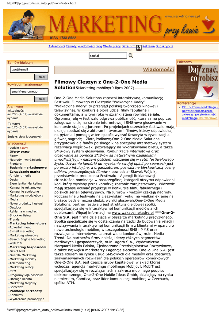 file:///D|/programy/imm_auto_pdf/www/index.html Aktualności Tematy Wiadomości Blog Oferty pracy Baza firm Reklama Subskrypcja szukaj Polecamy Zamów biuletyn Wiadomości twoj@email dalej Powiadom znajomego email@znajomego dalej Archiwum Aktualności: nr 203 (4.07) wszystkie wydania Tematy: nr 176 (5.07) wszystkie wydania Indeks słów kluczowych Wiadomości Ludzie nowy! Oferty pracy Firmy Nagrody i wyróżnienia Przetargi Badania marketingowe Zarządzanie marką Ambient media Design Experiential Marketing Kampanie reklamowe Kampanie społeczne Marketing młodzieżowy Media Nowe produkty i usługi Outdoor Reklama w mediach Shockvertising Trendy Marketing internetowy Advertainment E-mail marketing Marketing wirusowy Search Engine Marketing Web 2.0 Marketing bezpośredni Direct Mail Guerilla Marketing Marketing mobilny Telemarketing Marketing relacji CRM Programy lojalnościowe Obsługa klienta Marketing targowy Sprzedaż Promocje sprzedaży Konkursy Wydarzenia promocyjne Filmowy Cieszyn z One-2-One Media SolutionsMarketing mobilny(9 lipca 2007) One-2-One Media Solutions zapewni interaktywną komunikację Festiwalu Filmowego w Cieszynie "Wakacyjne Kadry". Konferencje "Wakacyjne Kadry" to przegląd polskiej twórczości kinowej i CPI: IV Forum Marketingu telewizyjnej. W konkursie biorą udział filmy fabularne i Nowości technologiczne zwiększające efektywność dokumentalne, a w tym roku w szranki staną również seriale. marketingu2.08, Warszawa Ogromną rolę w festiwalu odgrywa publiczność, która sama poprzez zalogowanie się na stronie internetowej i SMS-owe głosowanie w konkursie staje się jurorem. Po projekcjach uczestnicy festiwalu mają okazję spotkać się z aktorami i twórcami filmów, którzy odpowiedzą na pytania i pomogą w ten sposób wybrać faworyta w rywalizacji o główną nagrodę - Złotą Podkowę.One-2-One Media Solutions przygotował dla fanów polskiego kina specjalny internetowy system rezerwacji wejściówek, pozwalający na wydrukowanie biletu, a także SMS-owy system głosowania. Komunikacja internetowa oraz głosowanie za pomocą SMS-ów są naturalnymi działaniami umożliwiającym naszym gościom włączenie się w rytm festiwalowego życia. Używanie komórki do wyrażania swojej opinii po seansach jest po prostu intuicyjne, a organizatorom pozwala na błyskawiczną ocenę odbioru poszczególnych filmów - powiedział Sławek Wójcik, przedstawiciel producenta Festiwalu - Agencji Reklamowej ck!tv.Każda nominacja w poszczególnej kategorii otrzyma odpowiedni kod, który wysłany przez komórkę zostanie zarejestrowany. Widzowie mają szansę oceniać projekcje w konkursie filmu fabularnego i polskich seriali telewizyjnych. Na jurorów - widzów czekają nagrody. Podczas finału festiwalu na cieszyńskim rynku, na wielkim ekranie na bieżąco będzie można śledzić wyniki głosowań.One-2-One Media Solutions, partner festiwalu jest strukturą giełdowej spółki, specjalizującą się w interaktywnej komunikacji mediów z ich odbiorcami. Więcej informacji na www.wakacyjnekadry.pl ***One-2One S.A. jest firmą działającą w obszarze marketingu precyzyjnego. Spółka specjalizuje się w dostarczaniu narzędzi do budowania relacji i nawiązywania interaktywnej komunikacji firm z klientami w oparciu o nowe technologie mobilne, w szczególności SMS i MMS oraz rozwiązania internetowe. Laureat wielu konkursów, m.in. Media Trend. Do partnerów firmy należą liderzy różnych segmentów mediowych i gospodarczych, m.in. Agora S.A., Wydawnictwo Marquard Media Polska, Zjednoczone Przedsiębiorstwa Rozrywkowe, a także najwięksi marketerzy i agencje sieciowe. One-2-One S.A. jest także liderem na rynku usług SMSowych dla mediów oraz dostawcą zaawansowanych rozwiązań dla polskich operatorów komórkowych. One-2-One S.A. jest częścią grupy kapitałowej w skład której wchodzą: agencja marketingu mobilnego Mobijoy!, MobiTrust, specjalizujący się w rozwiązaniach z zakresu mobilnego podpisu elektronicznego, One-2-One Mobile Ideas Gmbh, działający na rynku niemieckim, Comtica, oraz lider komunikacji mobilnej w Czechach, spółka ATM. file:///D|/programy/imm_auto_pdf/www/index.html (1 z 3) [09-07-2007 19:33:35] ●