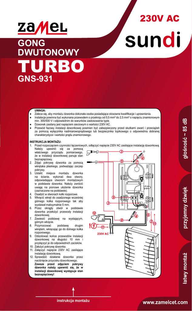 230V AC GONG DWUTONOWY TURBO instrukcja montażu przyjemny dźwięk INSTRUKCJA MONTAŻU: 1. Przed rozpoczęciem czynności łączeniowych, odłączyć napięcie 230V AC zasilające instalację dzwonkową. Należy upewnić się za pomocą właściwego przyrządu pomiarowego, że w instalacji dzwonkowej panuje stan beznapięciowy. 2. Zdjąć pokrywę dzwonka za pomocą wkrętaka płaskiego, podważając zaczep pokrywy. 3. Ustalić miejsce montażu dzwonka na ścianie, wykonać dwa otwory, odpowiadające otworom montażowym w podstawie dzwonka. Należy zwrócić uwagę na pionowe ułożenie dzwonka (zaznaczone na podstawie). 4. Osadzić w otworach kołki rozporowe. 5. Wkręcić wkręt do osadzonego wcześniej górnego kołka rozporowego tak aby wystawał maksymalnie 5 mm. 6. Przez okrągły otwór w podstawie dzwonka przełożyć przewody instalacji dzwonkowej. 7. Zawiesić podstawę na wystającym, górnym wkręcie. 8. Przymocować podstawę drugim wkrętem, wkręcając go do dolnego kołka rozporowego. 9. Odizolować końce przewodów instalacji dzwonkowej na długości 10 mm i przyłączyć je do odpowiednich zacisków. 10. Założyć pokrywę dzwonka. 11. Załączyć napięcie 230V AC zasilające instalację dzwonkową. 12. Sprawdzić działanie dzwonka przez naciśnięcie przycisku dzwonkowego. Zawsze przed zdjęciem pokrywy dzwonka należy upewnić się, że w instalacji dzwonkowej występuje stan beznapięciowy! łatwy montaż UWAGA: ● Zaleca się, aby montażu dzwonka dokonała osoba posiadająca stosowne kwalifikacje i uprawnienia. ● Instalacja powinna być wykonana przewodem o przekroju od 0,5 mm² do 2,5 mm² o napięciu znamionowym min. 300/500 V i odpowiednim do warunków zastosowania typie. ● Dzwonek zasilany jest napięciem sieciowym o wartości 230V AC. ● Przewód fazowy instalacji dzwonkowej powinien być zabezpieczony przed skutkami zwarć i przeciążeń za pomocą wyłącznika nadmiarowoprądowego lub bezpiecznika topikowego o odpowiednio dobranej charakterystyce i wartości prądu znamionowego. głośność ~ 85 dB GNS-931 www.zamelcet.com karta gwarancyjna producent udziela 24 miesięcznej gwarancji pieczęć i podpis sprzedawcy, data sprzedaży 1. ZAMEL Sp. z o.o. udziela 24 - miesięcznej gwarancji na sprzedawane towary. 2. Gwarancją ZAMEL Sp. z o.o. nie są objęte: a) mechaniczne uszkodzenia powstałe w transporcie, załadunku/ rozładunku lub innych okolicznościach, b) uszkodzenia powstałe na skutek wadliwie wykonanego montażu lub eksploatacji wyrobów ZAMEL Sp. z o.o. , c) uszkodzenia powstałe na skutek jakichkolwiek przeróbek dokonanych przez KUPUJĄCEGO lub osoby trzecie a odnoszących się do wyrobów będących przedmiotem sprzedaży lub urządzeń niezbędnych do prawidłowego funkcjonowania wyrobów będących przedmiotem sprzedaży, d) uszkodzenia wynikające z działania siły wyższej lub innych zdarzeń losowych, za które ZAMEL Sp. z o.o. nie ponosi odpowiedzialności e) źródła zasilania (baterie), będące na wyposażeniu urządzenia w momencie jego sprzedaży (jeśli występują). 3. Wszelkie roszczenia z tytułu gwarancji KUPUJĄCY zgłosi w punkcie zakupu lub firmie ZAMEL Sp. z o.o. na piśmie po ich stwierdzeniu. 4. ZAMEL Sp. z o.o. zobowiązuje się do rozpatrywania reklamacji zgodnie z obowiązującymi przepisami prawa polskiego. 5. Wybór formy załatwienia reklamacji, np. wymiana towaru na wolny od wad, naprawa lub zwrot pieniędzy należy do ZAMEL Sp. z o.o. 6. Terytorialny zasięg obowiązywania gwarancji: Rzeczpospolita Polska. 7. Gwarancja nie wyłącza, nie ogranicza, ani nie zawiesza uprawnień KUPUJĄCEGO wynikających z niezgodności towaru z umową. ZAMEL sp. z o.o. 43-200 Pszczyna, ul. Zielona 27, tel.: (32) 210 46 65; fax: (32) 210 80 04 e-mail: [email protected], www.zamelcet.com GNS-931 GONG DWUTONOWY TURBO Gong elektromechaniczny. Dźwięk: dwa tony BIM-BAM powtarzające się ciągle w czasie trzymania przycisku dzwonkowego. Głośność: ~85 dB. 230V AC/60mA; IP20 GNS-931-001 PN-EN 60335-1 Masa netto wyrobu: 0,29 kg Symbol oznaczający selektywne zbieranie sprzętu elektrycznego i elektronicznego. Zakaz Wzór zastrzeżony umieszczania zużytego sprzętu z innymi odpadami. © Zamel Deklaracja zgodności znajduje się na stronie internetowej www.zamelcet.com