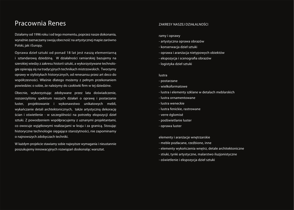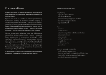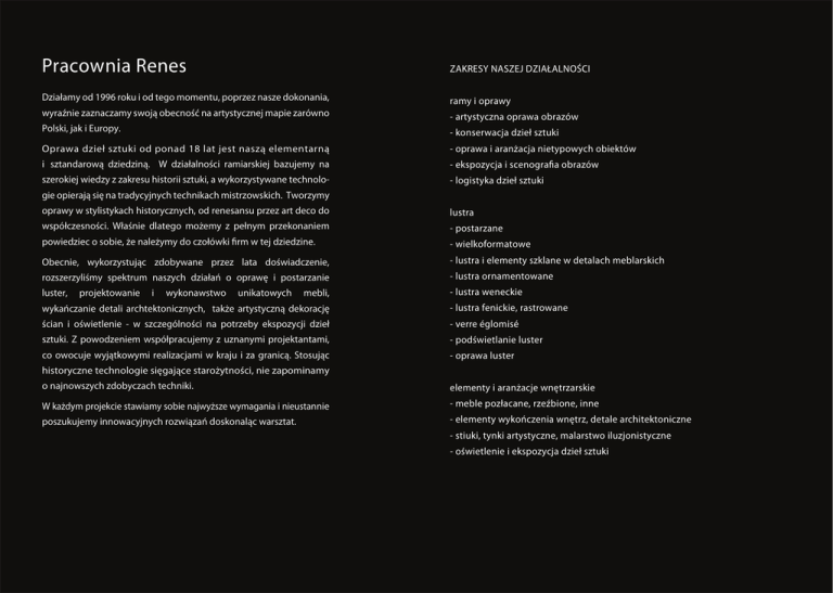 Pracownia Renes ZAKRESY NASZEJ DZIAŁALNOŚCI Działamy od 1996 roku i od tego momentu, poprzez nasze dokonania, ramy i oprawy wyraźnie zaznaczamy swoją obecność na artystycznej mapie zarówno - artystyczna oprawa obrazów Polski, jak i Europy. - konserwacja dzieł sztuki Oprawa dzieł sztuki od ponad 18 lat jest naszą elementarną - oprawa i aranżacja nietypowych obiektów i sztandarową dziedziną. W działalności ramiarskiej bazujemy na - ekspozycja i scenografia obrazów szerokiej wiedzy z zakresu historii sztuki, a wykorzystywane technolo- - logistyka dzieł sztuki gie opierają się na tradycyjnych technikach mistrzowskich. Tworzymy oprawy w stylistykach historycznych, od renesansu przez art deco do lustra współczesności. Właśnie dlatego możemy z pełnym przekonaniem - postarzane powiedziec o sobie, że należymy do czołówki firm w tej dziedzine. - wielkoformatowe Obecnie, wykorzystując zdobywane przez lata doświadczenie, - lustra i elementy szklane w detalach meblarskich rozszerzyliśmy spektrum naszych działań o oprawę i postarzanie - lustra ornamentowane luster, - lustra weneckie projektowanie i wykonawstwo unikatowych mebli, wykańczanie detali archtektonicznych, także artystyczną dekorację - lustra fenickie, rastrowane ścian i oświetlenie - w szczególności na potrzeby ekspozycji dzieł - verre églomisé sztuki. Z powodzeniem współpracujemy z uznanymi projektantami, - podświetlanie luster co owocuje wyjątkowymi realizacjami w kraju i za granicą. Stosując - oprawa luster historyczne technologie sięgające starożytności, nie zapominamy o najnowszych zdobyczach techniki. elementy i aranżacje wnętrzarskie W każdym projekcie stawiamy sobie najwyższe wymagania i nieustannie - meble pozłacane, rzeźbione, inne poszukujemy innowacyjnych rozwiązań doskonaląc warsztat. - elementy wykończenia wnętrz, detale architektoniczne - stiuki, tynki artystyczne, malarstwo iluzjonistyczne - oświetlenie i ekspozycja dzieł sztuki