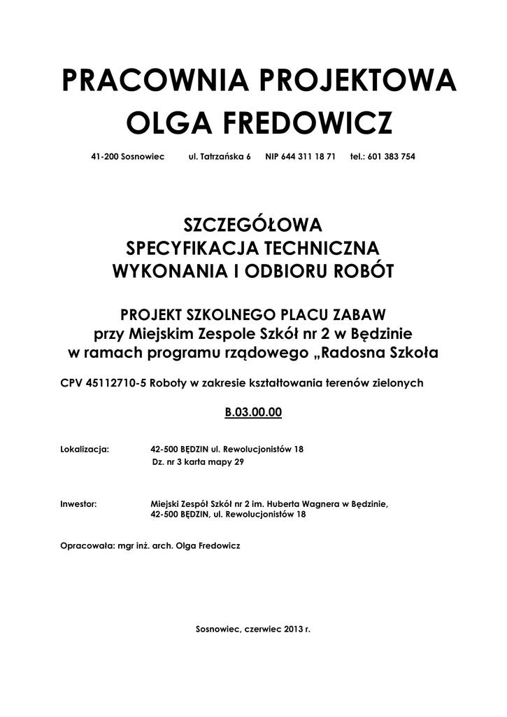 PRACOWNIA PROJEKTOWA OLGA FREDOWICZ 41-200 Sosnowiec ul. Tatrzańska 6 NIP 644 311 18 71 tel.: 601 383 754 SZCZEGÓŁOWA SPECYFIKACJA TECHNICZNA WYKONANIA I ODBIORU ROBÓT PROJEKT SZKOLNEGO PLACU ZABAW przy Miejskim Zespole Szkół nr 2 w Będzinie w ramach programu rządowego „Radosna Szkoła CPV 45112710-5 Roboty w zakresie kształtowania terenów zielonych B.03.00.00 Lokalizacja: 42-500 BĘDZIN ul. Rewolucjonistów 18 Dz. nr 3 karta mapy 29 Inwestor: Miejski Zespół Szkół nr 2 im. Huberta Wagnera w Będzinie, 42-500 BĘDZIN, ul. Rewolucjonistów 18 Opracowała: mgr inż. arch. Olga Fredowicz Sosnowiec, czerwiec 2013 r. SZCZEGÓŁOWA SPECYFIKACJA TECHNICZNA B-03.00.00 1. WSTĘP 1.1 Przedmiot SST Przedmiotem niniejszej specyfikacji technicznej ( SST ) są wymagania ogólne dotyczące wykonania i odbioru robót w zakresie kształtowania terenów zielonych na terenie szkolnego placu zabaw w MZS nr 2 w Będzinie w ramach programu rządowego „Radosna Szkoła”. 1.2 Zakres stosowania SST Specyfikacja techniczna stosowana jest jako dokument przetargowy oraz kontraktowy przy zlecaniu i realizacji robót wymienionych w pkt 1.1 1.3 Zakres robót objętych SST: -roboty pomiarowe, -przygotowanie i oczyszczenie terenu pod nasadzenia wraz z nasadzeniami, -nawiezienie i rozplantowanie warstwami nawiezionej na grubość ok.50 cm ziemi urodzajnejpod planowany trawnik i nasadzenia roślinne, -założenie trawnika z rolki, 2. MATERIAŁY 2.1 Ogólne wymagania dotyczące materiałów Ogólne wymagania dotyczące materiałów, ich pozyskiwania i składowania, podano w SST B01.00.00 „Wymagania ogólne”. 2.2 Szczegółowe wymagania dotyczące materiałów 2.2.1. Ziemia urodzajna Ziemia urodzajna powinna zawierać co najmniej 2% części organicznych -ziemia pozyskana w innym miejscu i dostarczona na plac budowy – nie może być zagruzowana, przerośnięta korzeniami, zasolona lub zanieczyszczona chemicznie. 2.2.2. Materiał roślinny a) Trawnik darniowy z rolki Trawy z rolki należy zamówić 5% więcej niż wynosi powierzchnia przeznaczona pod trawnik, gdyż trzeba przewidzieć straty przy układaniu. Trawa jest wysiewana na cienką warstwę torfowego podłoża na folii. Taka darń ma grubość około 3 cm i jest cięta na kawałki o wymiarach 50 x 200 cm (ciężar rolki wynosi ok. 15 kg). Trawa wysiewana wprost do gruntu jest gęsta i bardzo dobrze wygląda, ale w czasie oddzielania jej od podłoża skracane są korzenie - nawet o połowę. Istnieje zatem ryzyko, że będzie się długo ukorzeniała, co może doprowadzić do jej żółknięcia. Natomiast trawa z folii - choć delikatniejsza z wyglądu - ma całe korzenie, dlatego lepiej wrasta w podłoże i nie przesycha na krawędziach. Cechy trawnika darniowego: -darń jest gęsta, niezachwaszczona i zdrowa, jednakowego koloru na całej powierzchni; -ziemia w strefie korzeni ma tę samą grubość, jest lekko wilgotna i się nie kruszy; -pas rozwiniętej darni podniesiony oburącz za jedną krawędź nie przerywa się, a tym bardziej nie rozpada na kawałki b) Nawozy mineralne Nawozy mineralne powinny być w opakowaniu, z podanym składem chemicznym (zawartość azotu, fosforu, potasu - N.P.K.). Nawozy należy zabezpieczyć przed zawilgoceniem i zbryleniem w czasie transportu i przechowywania- Azofoska. c)Nasiona trawy Nasiona traw najczęściej występują w postaci gotowych mieszanek z nasion różnych gatunków. Gotowa mieszanka traw powinna mieć oznaczony procentowy skład gatunkowy, klasę, numer normy wg której została wyprodukowana, oraz zdolność kiełkowania. d) Krzewy iglaste- Thuja occidentalis Dostarczone sadzonki powinny być zgodne z normą PN-R-67023 i PN-R-67022, właściwie oznaczone, tzn. muszą mieć etykiety, na których podana jest nazwa łacińska, forma, wybór, numer normy. Sadzonki powinny być prawidłowo uformowane z zachowaniem pokroju charakterystycznego dla gatunku i odmiany oraz posiadać następujące cechy: pąk szczytowy przewodnika powinien być wyraźnie uformowany, przyrost ostatniego roku powinien wyraźnie i prosto przedłużać przewodnik, system korzeniowy powinien być skupiony i prawidłowo rozwinięty, na korzeniach szkieletowych powinny występować liczne korzenie drobne. U roślin sadzonych z bryłą korzeniową, np. krzewów iglastych, bryła korzeniowa powinna być prawidłowo uformowana i nie uszkodzona, pędy korony krzewów nie powinny być przycięte, chyba że jest to cięcie formujące, np. u form kulistych. Wady niedopuszczalne: - silne uszkodzenia mechaniczne roślin, - odrosty podkładki poniżej miejsca szczepienia, - ślady żerowania szkodników, - oznaki chorobowe, - zwiędnięcie i pomarszczenie kory na korzeniach i częściach naziemnych, - martwice i pęknięcia kory, - uszkodzenie lub przesuszenie bryły korzeniowej. Wysokość roślin- ok. 1,5m. e) Świerk srebrny-Picea pungens Wysokość roślin- ok. 1,5m. Dostarczone sadzonki powinny być zgodne z normą PN-R-67023 i PN-R-67022, właściwie oznaczone, tzn. muszą mieć etykiety, na których podana jest nazwa łacińska, forma, wybór, numer normy. Sadzonki powinny być prawidłowo uformowane z zachowaniem pokroju charakterystycznego dla gatunku i odmiany oraz posiadać następujące cechy: pąk szczytowy przewodnika powinien być wyraźnie uformowany, przyrost ostatniego roku powinien wyraźnie i prosto przedłużać przewodnik, system korzeniowy powinien być skupiony i prawidłowo rozwinięty, na korzeniach szkieletowych powinny występować liczne korzenie drobne. U roślin sadzonych z bryłą korzeniową, np. krzewów iglastych, bryła korzeniowa powinna być prawidłowo uformowana i nie uszkodzona, pędy korony krzewów nie powinny być przycięte. Wady niedopuszczalne: - silne uszkodzenia mechaniczne roślin, - odrosty podkładki poniżej miejsca szczepienia, - ślady żerowania szkodników, - oznaki chorobowe, - zwiędnięcie i pomarszczenie kory na korzeniach i częściach naziemnych, - martwice i pęknięcia ko