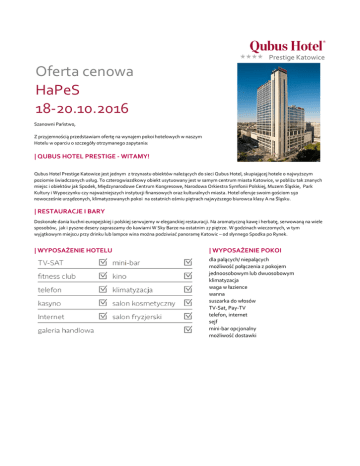 Prestige Katowice Oferta cenowa HaPeS 18-20.10.2016 Szanowni Państwo, Z przyjemnością przedstawiam ofertę na wynajem pokoi hotelowych w naszym Hotelu w oparciu o szczegóły otrzymanego zapytania: | QUBUS HOTEL PRESTIGE - WITAMY! Qubus Hotel Prestige Katowice jest jednym z trzynastu obiektów należących do sieci Qubus Hotel, skupiającej hotele o najwyższym poziomie świadczonych usług. To czterogwiazdkowy obiekt usytuowany jest w samym centrum miasta Katowice, w pobliżu tak znanych miejsc i obiektów jak Spodek, Międzynarodowe Centrum Kongresowe, Narodowa Orkiestra Symfonii Polskiej, Muzem Śląskie, Park Kultury i Wypoczynku czy najważniejszych instytucji finansowych oraz kulturalnych miasta. Hotel oferuje swoim gościom 150 nowocześnie urządzonych, klimatyzowanych pokoi na ostatnich ośmiu piętrach najwyższego biurowca klasy A na Śląsku. | RESTAURACJE I BARY Doskonałe dania kuchni europejskiej i polskiej serwujemy w eleganckiej restauracji. Na aromatyczną kawę i herbatę, serwowaną na wiele sposobów, jak i pyszne desery zapraszamy do kawiarni W Sky Barze na ostatnim 27 piętrze. W godzinach wieczornych, w tym wyjątkowym miejscu przy drinku lub lampce wina można podziwiać panoramę Katowic – od słynnego Spodka po Rynek. | WYPOSAŻENIE HOTELU | WYPOSAŻENIE POKOI dla palących/ niepalących możliwość połączenia z pokojem jednoosobowym lub dwuosobowym klimatyzacja waga w łazience wanna suszarka do włosów TV-Sat, Pay-TV telefon, internet sejf mini-bar opcjonalny możliwość dostawki Prestige Katowice | OFERTA Oferta specjalna na wydarzenie HaPeS w Qubus Hotel Prestige Katowice. KOD HAPES2016 Oferta specjalna na wydarzenie HaPeS w Qubus Hotel Prestige Katowice. Oferta obowiązuje w terminie od 16.10.2016 do 20.10.2016. Założenie rezerwacji w niniejszej ofercie jest możliwe od 01.08.2016 do 19.10.2016. Cena obejmuje: - pobyt w komfortowym pokoju jednoosobowym lub dwuosobowym, - śniadanie w formie bufetu składające się z ponad 100 świeżych produktów, - dostęp do bezprzewodowego Internetu, - podatek VAT. Warunki płatności i anulacji: - Dot Pay - oferta płatna na stronie internetowej, - płatność w hotelu - Recepcja skontaktuje się z Państwem w celu zagwarantowania rezerwacji, - możliwość bezkosztowej anulacji rezerwacji do godziny 18:00 w dniu przyjazdu. CENA specjalna dla rezerwacji dokonanej w dniach: poniedziałek-piątek CENA specjalna dla rezerwacji dokonanej w dniach: piątek poniedziałek Pokój 1-osobowy 260 PLN 190 PLN Pokój 2-osobowy 340 PLN 260 PLN STANDARD POKOJU Oferta ważna przy rezerwacji za pośrednictwem strony interentowej www.qubushotel.com. W miejscu "kod promocyjny" należy wpisać : HAPES2016 Podane ceny zawierają podatek VAT i śniadanie | DODATKOWE INFORMACJE: TYP USŁUGI PARKING (piętrowy, podziemny, monitorowany) – doliczony do łącznej faktury (naliczany dobowo) Natalia Dorszewska Specjalista ds. Sprzedaży i Marketingu nr tel. 32 601 0 884, kom. 601 572 297 nr fax 32 601 0 885 [email protected] CENA JEDNOSTKOWA 15 EUR /doba Qubus Hotel Prestige Katowice ul. Uniwersytecka 13 40-007 Katowice tel.: (+48 32) 601 0 100 fax: (+48 32) 601 0 200