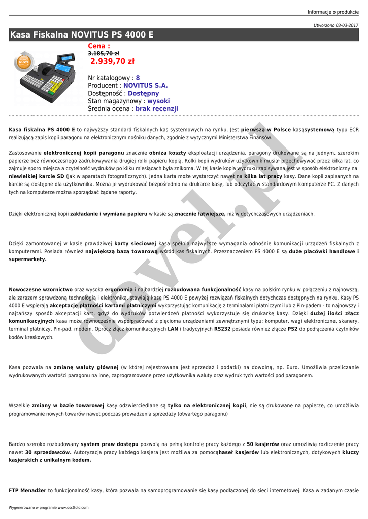 Informacje o produkcie Utworzono 03-03-2017 Kasa Fiskalna NOVITUS PS 4000 E Cena : 3.185,70 zł 2.939,70 zł Nr katalogowy : 8 Producent : NOVITUS S.A. Dostępność : Dostępny Stan magazynowy : wysoki Średnia ocena : brak recenzji Kasa fiskalna PS 4000 E to najwyższy standard fiskalnych kas systemowych na rynku. Jest pierwszą w Polsce kasąsystemową typu ECR realizującą zapis kopii paragonu na elektronicznym nośniku danych, zgodnie z wytycznymi Ministerstwa Finansów. l Zastosowanie elektronicznej kopii paragonu znacznie obniża koszty eksploatacji urządzenia, paragony drukowane są na jednym, szerokim papierze bez równoczesnego zadrukowywania drugiej rolki papieru kopią. Rolki kopii wydruków użytkownik musiał przechowywać przez kilka lat, co zajmuje sporo miejsca a czytelność wydruków po kilku miesiącach była znikoma. W tej kasie kopia wydruku zapisywana jest w sposób elektroniczny na .p niewielkiej karcie SD (jak w aparatach fotograficznych). Jedna karta może wystarczyć nawet na kilka lat pracy kasy. Dane kopii zapisanych na karcie są dostępne dla użytkownika. Można je wydrukować bezpośrednio na drukarce kasy, lub odczytać w standardowym komputerze PC. Z danych tych na komputerze można sporządzać żądane raporty. ve l Dzięki elektronicznej kopii zakładanie i wymiana papieru w kasie są znacznie łatwiejsze, niż w dotychczasowych urządzeniach. Dzięki zamontowanej w kasie prawdziwej karty sieciowej kasa spełnia najwyższe wymagania odnośnie komunikacji urządzeń fiskalnych z komputerami. Posiada również największą bazą towarową wśród kas fiskalnych. Przeznaczeniem PS 4000 E są duże placówki handlowe i supermarkety. Nowoczesne wzornictwo oraz wysoka ergonomia i najbardziej rozbudowana funkcjonalność kasy na polskim rynku w połączeniu z najnowszą, da ale zarazem sprawdzoną technologią i elektroniką, stawiają kasę PS 4000 E powyżej rozwiązań fiskalnych dotychczas dostępnych na rynku. Kasy PS 4000 E wspierają akceptację płatności kartami płatniczymi wykorzystując komunikację z terminalami płatniczymi lub z Pin-padem - to najnowszy i najtańszy sposób akceptacji kart, gdyż do wydruków potwierdzeń płatności wykorzystuje się drukarkę kasy. Dzięki dużej ilości złącz komunikacyjnych kasa może równocześnie współpracować z pięcioma urządzeniami zewnętrznymi typu: komputer, wagi elektroniczne, skanery, terminal płatniczy, Pin-pad, modem. Oprócz złącz komunikacyjnych LAN i tradycyjnych RS232 posiada również złącze PS2 do podłączenia czytników kodów kreskowych. Kasa pozwala na zmianę waluty głównej (w której rejestrowana jest sprzedaż i podatki) na dowolną, np. Euro. Umożliwia przeliczanie wydrukowanych wartości paragonu na inne, zaprogramowane przez użytkownika waluty oraz wydruk tych wartości pod paragonem. Wszelkie zmiany w bazie towarowej kasy odzwierciedlane są tylko na elektronicznej kopii, nie są drukowane na papierze, co umożliwia programowanie nowych towarów nawet podczas prowadzenia sprzedaży (otwartego paragonu) Bardzo szeroko rozbudowany system praw dostępu pozwolą na pełną kontrolę pracy każdego z 50 kasjerów oraz umożliwią rozliczenie pracy nawet 30 sprzedawców. Autoryzacja pracy każdego kasjera jest możliwa za pomocąhaseł kasjerów lub elektronicznych, dotykowych kluczy kasjerskich z unikalnym kodem. FTP Menadżer to funkcjonalność kasy, która pozwala na samoprogramowanie się kasy podłączonej do sieci internetowej. Kasa w zadanym czasie Wygenerowano w programie www.oscGold.com potrafi połączyć się z dostępnym w internecie serwerem FTP, pobrać z niego dane do przeprogramowania, przesłać do niego informacje o obrotach, raportach itp. Pozwala to na obniżenie kosztów w każdym sklepie poprzez rezygnację z komputera na zapleczu wraz z oprogramowaniem. Kasa posiada funkcjonalność portu PC2 tak jak drukarki fiskalne Novitus. Dzięki temu istnieje możliwość drukowania pełnej gamy wydruków niefiskalnych identycznie jak ma to miejsce w przypadku drukarek fiskalnych a także odczytywania danych ostatniego paragonu wydrukowanego na kasie. Ta ostatnia funkcja pozwala na wykorzystanie kasy jako źródła danych dla systemów monitorujących oraz lojalnościowych. Cechy wyróżniające kasę PS 4000 E: Możliwość zaprogramowania do 60 000 towarów Możliwość zaprogramowania 5 000 kodów dowiązanych Zmiany w bazie towarowej "drukowane" są tylko na elektronicznej kopii, co pozwala na programowanie nowych towarów również w otwartym paragonie Możliwość oprogramowania 129 (30 x 4 + 9) klawiszy jako klawisze kodów bezpośrednich lub jako klawisze funkcyjne Klawiszom kodów bezpośrednich można nadać dodatkowe funkcje: zmianę zaprogramowanej ceny, sprzedaż z zadaną ilością, wymusić zakończenie paragonu gotówką lub inną formą płatności Klawiszom funkcyjnym można przypisać dowolną z 77 dostępnych funkcji menu kasy Prowadzenie przez kasę stanów magazynowych zaprogramowanych towarów l DANE TECHNICZNE da ve l .p Nazwa: PS 4000 E Typ: Kasa systemowa z elektroncizną kopia paragonu Przeznaczenie: praca w sklepach, marketach i supermarketach PARAMETRY URZĄDZENIA Liczba towarów: 60 000 Liczba stawek PTU: 7 Liczba kodów dowiązanych: 5 000 Liczba grup towarowych: 64 Liczba kasjerów: 50 + 30 sprzedawców Rabaty/narzuty: tak Pojemność bufora ON-LINE: 10 000 Opakowania: 64 Nazwa towaru: 18 lub 40 znaków MECHANIZM DRUKUJĄCY Rodzaj: termiczny Typ: Citizen LT286 Szerokość papieru: 57 mm KLAWIATURA Rodzaj: alfanumeryczna + qwrty Liczba klawiszy: 38 + 30 Klawisze szybkiej sprzedaży: 129 (30 x 4 poziomy + 9) WYŚWIETLACZE Klient: LCD, alfanumeryczny 2 x 16 znaków Kasjer: LCD, alfanumeryczny 4 x 20 znaków ZŁĄCZA Złącza komunikacyjne: 3 x RS232, 1 x PS2, 1 x Ethernet Współpraca z urządzeniami: komputer, waga, skaner, modem, terminal EFT, Pin-Pad, drukarka zamówień (kuchenna) Sterowanie szufladą: tak, 6V, 12V, 24