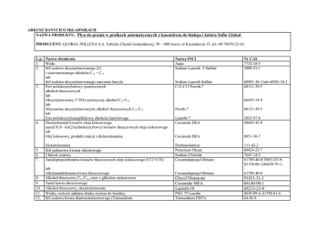 ARKUSZ DANYCH O SKŁADNIKACH NAZWA PRODUKTU: Płyn do prania w pralkach automatycznych z kaszmirem do białego i koloru Sofin Global PRODUCENT: GLOBAL POLLENA S.A. Fabryka Chemii Gospodarczej, 59 – 400 Jawor, ul Kuziennicza 15, tel.+48 76870-32-63, L.p. Nazwa chemiczna 1. Woda 2. Sól sodowa oksyetylenowanego (2) i siarczanowanego alkoholu C12 ÷ C14 lub Sól sodowa oksyetylenowanego siarczanu laurylu 3. Eter polioksyetylenowy syntetycznych alkoholi tłuszczowych lub Oksyetylenowany (7 EO) syntetyczny alkohol C12-C13 lub Mieszanina oksyetylenowanych alkoholi tłuszczowych C12-C15 lub Eter polioksyetylenoglikolowy alkoholu laurylowego 4. Dietanoloamid kwasów oleju kokosowego (amid N,N –bis(2-hydroksyetylowy) kwasów tłuszczowych oleju kokosowego lub Olej kokosowy, produkt reakcji z dietanoloaminą Dietanoloamina 5. 6. 7. 8. 9. 10. 11. 12. Sól potasowa kwasu oleinowego Chlorek sodowy Amidopropylobetaina kwasów tłuszczowych oleju kokosowego (C12÷C18) lub Alkiloamidobetaina kwasu tłuszczowego Alkohol tłuszczowy C16-C18, ester z glikolem etylenowym Amid kawsu tłuszczowego Alkohol tłuszczowy, oksyetylenowany Wodny roztwór adduktu tlenku etylenu do lanoliny Sól sodowa kwasu diaminotertaoctowego (Tetrasodium Nazwa INCI Aqua Sodium Laureth -2 Sulfate Nr CAS 7732-18-5 3088-31-1 Sodium Laureth Sulfate C12-C15 Pareth-7 68891-38-3 lub 68585-34-2 68131-39-5 66455-14-9 Pareth-7 68131-39-5 Laureth-7 Cocamide DEA 3055-97-8 68603-42-9 Cocamide DEA 8051-30-7 Diethanolamine Potassium Oleate Sodium Chloride Cocamidopropyl Betaine 111-42-2 68424-23-7 7647-14-5 61789-40-0;70851-07-9; 83138-08-3;86438-79-1; Cocamidopropyl Betaine 61789-40-0 Glycol Distearate Cocamide MEA Laureth-10 91031-31-1 68140-00-1 68213-23-0 PEG-75 Lanolin Tetrasodium EDTA 8039-09-6; 61790-81-6 64-02-8 13. 14. ethylenediaminetetraacetate) 2-hydroksy-1,2,3-propanotrikarboksylowy kwas monohydrat Kompozycja zapachowa 15. 16. Hydrolizat protein kaszmiru Środek konserwujący 17. Barwnik Citric Acid Perfum (Butylphenyl Methylpropional, Citronellol, Linalool) Hydrolyzed Keratin Methylchloroisothiazolinone Methylisothiazolinone 2-Bromo-2-Nitropropane-1,3 Diol CI 16255 5949-29-1 69430-36-0 26172-55-4 2682-20-4 52-51-7 2611-82-7