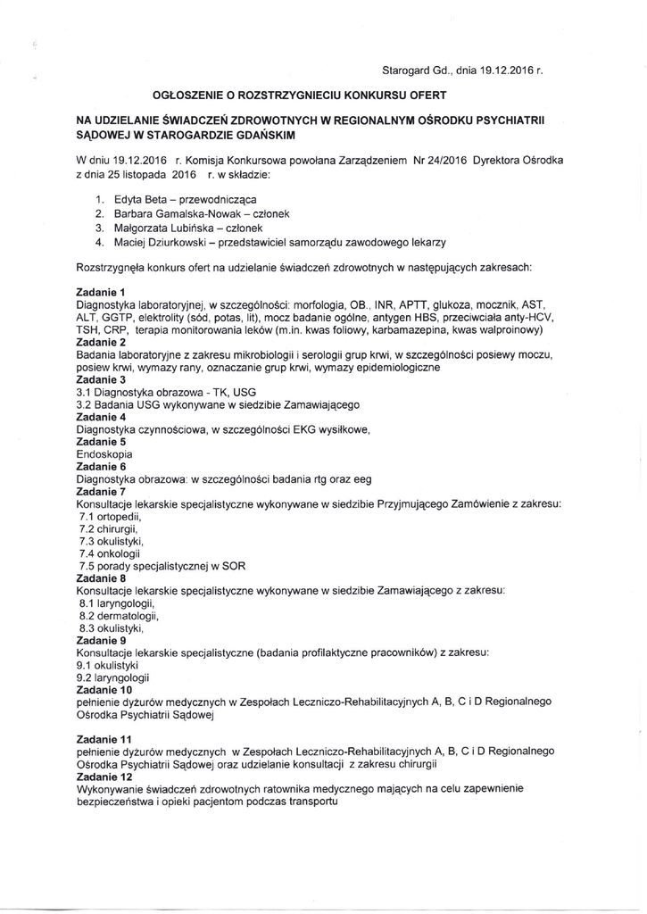 Starogard Gd., dnia 19.12.2016 r. OGŁOSZENIE O ROZSTRZYGNIĘCIU KONKURSU OFERT NA UDZIELANIE ŚWIADCZEŃ ZDROWOTNYCH W REGIONALNYM OŚRODKU PSYCHIATRII SĄDOWEJ W STAROGARDZIE GDAŃSKIM W dniu 19.12.2016 r. Komisja Konkursowa powołana Zarządzeniem Nr 24/2016 Dyrektora Ośrodka z dnia 25 listopada 2016 r. w składzie: 1. Edyta Beta - przewodnicząca 2. Barbara Gamalska-Nowak - członek 3. Małgorzata Lubińska - członek 4. Maciej Dziurkowski - przedstawiciel samorządu zawodowego lekarzy Rozstrzygnęła konkurs ofert na udzielanie świadczeń zdrowotnych w następujących zakresach: Zadanie 1 Diagnostyka laboratoryjnej, w szczególności: morfologia, OB., INR, APTT, glukoza, mocznik, AST, ALT, GGTP, elektrolity (sód, potas, lit), mocz badanie ogólne, antygen HBS, przeciwciała anty-HCV, TSH, CRP, terapia monitorowania leków (m.in. kwas foliowy, karbamazepina, kwas walproinowy) Zadanie 2 Badania laboratoryjne z zakresu mikrobiologii i serologii grup krwi, w szczególności posiewy moczu, posiew krwi, wymazy rany, oznaczanie grup krwi, wymazy epidemiologiczne Zadanie 3 3.1 Diagnostyka obrazowa - TK, USG 3.2 Badania USG wykonywane w siedzibie Zamawiającego Zadanie 4 Diagnostyka czynnościowa, w szczególności EKG wysiłkowe. Zadanie 5 Endoskopia Zadanie 6 Diagnostyka obrazowa: w szczególności badania rtg oraz eeg Zadanie 7 Konsultacje lekarskie specjalistyczne wykonywane w siedzibie Przyjmującego Zamówienie z zakresu: 7.1 ortopedii, 7.2 chirurgii, 7.3 okulistyki, 7.4 onkologii 7.5 porady specjalistycznej w SOR Zadanie 8 Konsultacje lekarskie specjalistyczne wykonywane w siedzibie Zamawiającego z zakresu: 8.1 laryngologii, 8.2 dermatologii, 8.3 okulistyki. Zadanie 9 Konsultacje lekarskie specjalistyczne (badania profilaktyczne pracowników) z zakresu: 9.1 okulistyki 9.2 laryngologii Zadanie 10 pełnienie dyżurów medycznych w Zespołach Leczniczo-Rehabilitacyjnych A, B, C i D Regionalnego Ośrodka Psychiatrii Sądowej Zadanie 11 pełnienie dyżurów medycznych w Zespołach Leczniczo-Rehabilitacyjnych A, B, C i D Regionalnego Ośrodka Psychiatrii Sądowej oraz udzielanie konsultacji z zakresu chirurgii Zadanie 12 Wykonywanie świadczeń zdrowotnych ratownika medycznego mających na celu zapewnienie bezpieczeństwa i opieki pacjentom podczas transportu Wybrano 16 (szesnaście) najkorzystniejszych ofert dla Udzielającego zamówienia w przeliczeniu na punkty zgodnie z kryterium wyboru stanowiącym załącznik nr 1 do Zarządzenia Dyrektora Ośrodka nr 24/2016 z dnia 25 listopada 2016 r. - szczegółowe warunki konkursu ofert na udzielanie świadczeń zdrowotnych w Regionalnym Ośrodku Psychiatrii Sądowej w Starogardzie Gdańskim w zakresie świadczeń zdrowotnych w następujących zakresach : Zadanie 1 Diagnostyka laboratoryjnej, w szczególności: morfologia, OB., INR, APTT, glukoza, mocznik, AST, ALT, GGTP, elektrolity (sód, potas, lit), mocz badanie ogólne, antygen HBS, przeciwciała anty-HCV, TSH, CRP, terapia monitorowania leków (m.in. kwas foliowy, karbamazepina, kwas walproinowy) oferta nr 15 Szpital dla Nerwowo I Psychicznie Chorych im. Stanisława Kryzana Zadanie 2 Badania laboratoryjne z zakresu mikrobiologii i serologii grup krwi, w szczególności posiewy moczu, posiew krwi, wymazy rany, oznaczanie grup krwi, wymazy epidemiologiczne Oferta nr 14 Koclewskle Centrum Zdrowia Sp. z o.o. Zadanie 3 3.1 Diagnostyka obrazowa - TK, USG oferta nr 13 „TK Medica" Sp. z o.o. 83-200 3.2 Badania USG wykonywane w siedzibie Zamawiającego oferta nr 11 Indywidualna Specjalistyczna Praktyka Lekarska Krzysztof Zając Zadanie 4 Diagnostyka czynnościowa, w szczególności EKG wysiłkowe. Oferta nr 14 Koclewskle Centrum Zdrowia Sp. z o.o. Zadanie 5 Endoskopia Oferta nr 14 Koclewskle Centrum Zdrowia Sp. z o.o. Zadanie 6 Diagnostyka obrazowa: w szczególności badania rtg oraz eeg oferta nr 15 Szpital dla Nerwowo i Psychicznie Chorych im. Stanisława Kryzana Zadanie 7 Konsultacje lekarskie specjalistyczne wykonywane w siedzibie Przyjmującego Zamówienie z zakresu: 7.1 ortopedii, 7.2 chirurgii, 7.3 okulistyki, 7.4 onkologii 7.5 porady specjalistycznej w SOR Oferta nr 14 Koclewskle Centrum Zdrowia Sp. z o.o. Zadanie 8 Konsultacje lekarskie specjalistyczne wykonywane w siedzibie Zamawiającego z zakresu: 8.1 laryngologii, oferta nr 8 Indywidualna Specjalistyczna Praktyka Lekarska Marta Nowakowska 8.2 dermatologii, oferta nr 9 Indywidualna Specjalistyczna Praktyka Lekarska Katarzyna Machalica-Putrym 8.3 okulistyki, oferta nr 1 Indywidualna Specjalistyczna Praktyka Lekarska Jarosław Kruczek Zadanie 9 Konsultacje lekarskie specjalistyczne (badania profilaktyczne pracowników) z zakresu: 9.1 okulistyki oferta nr 1 Indywidualna Specjalistyczna Praktyka Lekarska Jarosław Kruczek 9.2 laryngologii oferta nr 8 Indywidualna Specjalistyczna Praktyka Lekarska Marta Nowakowska Zadanie 10 pełnienie dyżurów medycznych w Zespołach Leczniczo-Rehabilitacyjnych A, B, C i D Regionalnego Ośrodka Psychiatrii Sądowej oferta nr 2 Indywidualna Specjalistyczna Praktyka Lekarska Krzysztof Żuk oferta nr 3 Indywidualna Specjalistyczna Praktyka Lekarska Grzegorz Nowacki oferta nr 4 Indywidualna Praktyka Lekarska Paweł Kuczyński oferta nr 5 Indywidualna Specjalistyczna Praktyka Lekarska Krystyna Włoch oferta nr 6 Indywidualna Specjalistyczna Praktyka Lekarska Krzysztof Woźny oferta nr 7 Indywidualna Specjalistyczna Praktyka Lekarska Ryszard Wardeński oferta nr 16 Indywidualna Specjalistyczna Praktyka Lekarska Iwona Mikołajczyk Zadanie 11 pełnienie dyżurów medycznych w Zespołach Leczniczo-Rehabilitacyjnych A, B, C i D Regionalnego Ośrodka Psychiatrii Sądowej oraz udzielanie konsultacji z zakresu chirurgii oferta nr 1 Indywidualna Specjalistyczna Praktyka Lekarska - Piotr Szymański Zadanie 12 Wykonywanie świadczeń zdrowotnych ratownika medycznego mających na celu zapewnienie bezpieczeństwa i opieki pacjentom podczas transportu oferta nr 12 Andrzej Bryjak - Ratownik medyczny W imieniu Komisji Kon