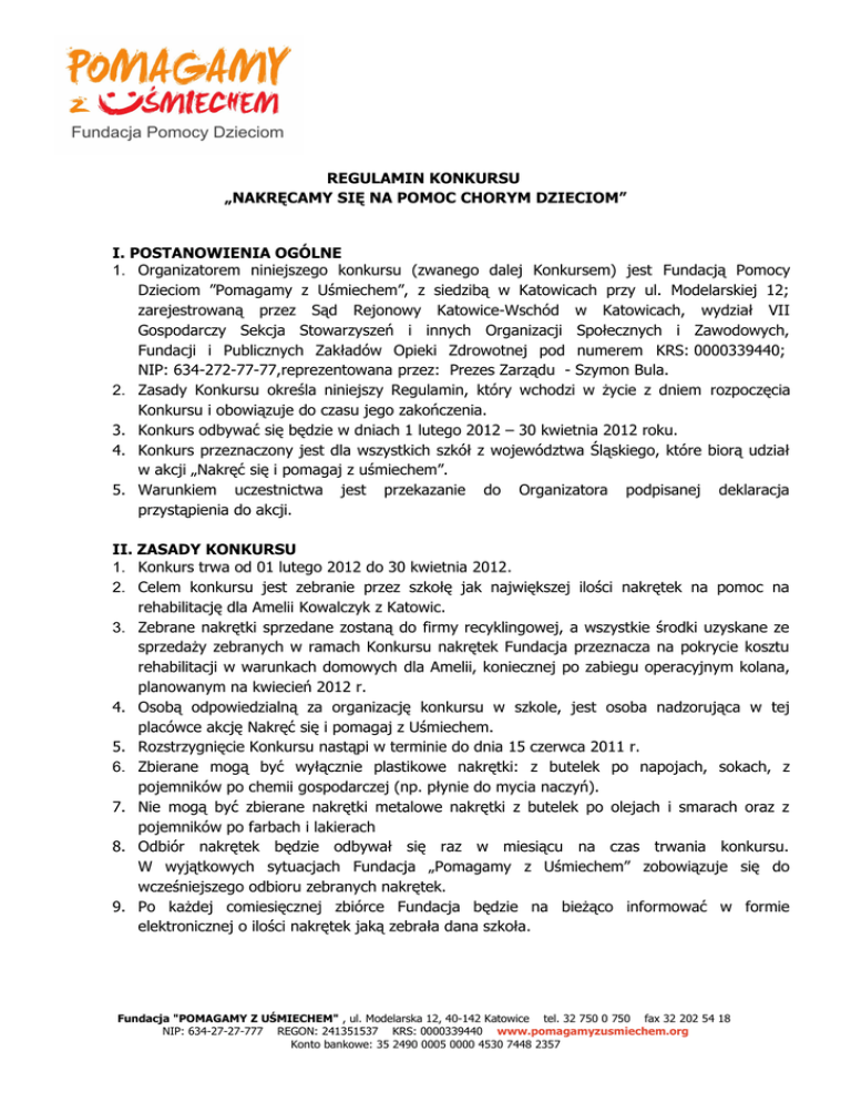 REGULAMIN KONKURSU „NAKRĘCAMY SIĘ NA POMOC CHORYM DZIECIOM” I. POSTANOWIENIA OGÓLNE 1. Organizatorem niniejszego konkursu (zwanego dalej Konkursem) jest Fundacją Pomocy Dzieciom ”Pomagamy z Uśmiechem”, z siedzibą w Katowicach przy ul. Modelarskiej 12; zarejestrowaną przez Sąd Rejonowy Katowice-Wschód w Katowicach, wydział VII Gospodarczy Sekcja Stowarzyszeń i innych Organizacji Społecznych i Zawodowych, Fundacji i Publicznych Zakładów Opieki Zdrowotnej pod numerem KRS: 0000339440; NIP: 634-272-77-77,reprezentowana przez: Prezes Zarządu - Szymon Bula. 2. Zasady Konkursu określa niniejszy Regulamin, który wchodzi w życie z dniem rozpoczęcia Konkursu i obowiązuje do czasu jego zakończenia. 3. Konkurs odbywać się będzie w dniach 1 lutego 2012 – 30 kwietnia 2012 roku. 4. Konkurs przeznaczony jest dla wszystkich szkół z województwa Śląskiego, które biorą udział w akcji „Nakręć się i pomagaj z uśmiechem”. 5. Warunkiem uczestnictwa jest przekazanie do Organizatora podpisanej deklaracja przystąpienia do akcji. II. ZASADY KONKURSU 1. Konkurs trwa od 01 lutego 2012 do 30 kwietnia 2012. 2. Celem konkursu jest zebranie przez szkołę jak największej ilości nakrętek na pomoc na rehabilitację dla Amelii Kowalczyk z Katowic. 3. Zebrane nakrętki sprzedane zostaną do firmy recyklingowej, a wszystkie środki uzyskane ze sprzedaży zebranych w ramach Konkursu nakrętek Fundacja przeznacza na pokrycie kosztu rehabilitacji w warunkach domowych dla Amelii, koniecznej po zabiegu operacyjnym kolana, planowanym na kwiecień 2012 r. 4. Osobą odpowiedzialną za organizację konkursu w szkole, jest osoba nadzorująca w tej placówce akcję Nakręć się i pomagaj z Uśmiechem. 5. Rozstrzygnięcie Konkursu nastąpi w terminie do dnia 15 czerwca 2011 r. 6. Zbierane mogą być wyłącznie plastikowe nakrętki: z butelek po napojach, sokach, z pojemników po chemii gospodarczej (np. płynie do mycia naczyń). 7. Nie mogą być zbierane nakrętki metalowe nakrętki z butelek po olejach i smarach oraz z pojemników po farbach i lakierach 8. Odbiór nakrętek będzie odbywał się raz w miesiącu na czas trwania konkursu. W wyjątkowych sytuacjach Fundacja „Pomagamy z Uśmiechem” zobowiązuje się do wcześniejszego odbioru zebranych nakrętek. 9. Po każdej comiesięcznej zbiórce Fundacja będzie na bieżąco informować w formie elektronicznej o ilości nakrętek jaką zebrała dana szkoła. Fundacja "POMAGAMY Z UŚMIECHEM" , ul. Modelarska 12, 40-142 Katowice tel. 32 750 0 750 fax 32 202 54 18 NIP: 634-27-27-777 REGON: 241351537 KRS: 0000339440 www.pomagamyzusmiechem.org Konto bankowe: 35 2490 0005 0000 4530 7448 2357 III. ROZSTRZYGNIĘCIE KONKURSU 1. Spośród wszystkich szkół biorących udział w konkursie, zostaną wyłonione trzy szkoły, które zebrały największą ilość nakrętek. 2. Liczy się ostateczna waga nakrętek uzyskana po segregacji nakrętek i ich zważeniu przez pracownika firmy recyklingowej Vivasto SA. 3. Rozstrzygnięcie konkursu nastąpi 15 maja 2012 r. 4. Wyniki Konkursu zostaną opublikowane dnia 15 maja 2012 o godz. 12:00 na stronie www.pomagamyzusmiechem.pl 5. Nagrodzone szkoły zostaną poinformowane o wynikach Konkursu drogą mailową lub oraz telefonicznie. IV. NAGRODY 1. Dla szkół, które zebrały największą ilość nakrętek, przeznaczone są następujące nagrody: I MIEJSCE - dofinansowanie 1.000 zł do wycieczki szkolnej dla najlepszej klasy, II MIEJSCE - dofinansowanie 500 zł do wycieczki szkolnej dla najlepszej klasy, III MIEJSCE - bilety do Multikina dla najlepszej klasy, 2. Nagrody, o których mowa w ust. 1 zostaną przekazane Zwycięzcom Konkursu przez Organizatora w ciągu trzech dni roboczych od daty ogłoszenia wyników Konkursu. 3. Koszt nagród pokrywa firma recyklingowa Vivasto S.A. 4. Organizator zastrzega sobie prawo do publikowania informacji o Zwycięzcy na stronie internetowej www.pomagamyzusmiechem.pl. IV. POSTANOWIENIA KOŃCOWE 1. Decyzje Organizatora Konkursu mają charakter ostateczny i nie przysługuje od nich odwołanie. 2. Przystąpienie do udziału w Konkursie jest jednoznaczne z przyjęciem warunków niniejszego Regulaminu. 3. W sprawach nieuregulowanych niniejszym Regulaminem zastosowanie mają odpowiednie przepisy kodeksu cywilnego. 5. Strona internetowa organizatora konkursu - Fundacji „Pomagamy z Uśmiechem”: www.pomagamyzusmiechem.org Fundacja "POMAGAMY Z UŚMIECHEM" , ul. Modelarska 12, 40-142 Katowice tel. 32 750 0 750 fax 32 202 54 18 NIP: 634-27-27-777 REGON: 241351537 KRS: 0000339440 www.pomagamyzusmiechem.org Konto bankowe: 35 2490 0005 0000 4530 7448 2357