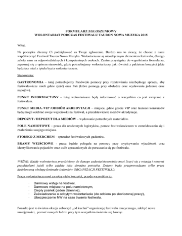 FORMULARZ ZGŁOSZENIOWY WOLONTARIAT PODCZAS FESTIWALU TAURON NOWA MUZYKA 2015 Witaj, Na początku chcemy Ci podziękować za Twoje zgłoszenie. Bardzo nas to cieszy, że chcesz z nami współtworzyć Festiwal Tauron Nowa Muzyka. Wolontariusze są nieodłącznym elementem festiwalu, dlatego zależy nam na odpowiedzialnych i kompetentnych osobach. Zanim przystąpisz do wypełniania formularza, zapoznaj się z opisem stanowisk, gdzie potrzebujemy wolontariuszy, jak również z pakietem korzyści jakie będziesz miał z tytułu bycia wolontariuszem. Stanowiska: GASTRONOMIA – tutaj potrzebujemy Panów(do pomocy przy rozstawianiu niezbędnego sprzętu, aby festiwalowicze mieli gdzie zjeść) oraz Pań (które pomogą przy obsłudze oraz wydawaniu jedzenie oraz napojów). PUNKT INFORMACYJNY – tutaj wolontariusze będą informować o wszystkim co jest związane z festiwalem. PUNKT MEDIA /VIP /ODBIÓR AKREDYTACJI – miejsce, gdzie goście VIP oraz laureaci konkursów będą mogli odebrać swoje wejściówki na festiwal, a przedstawiciele mediów akredytacje. DEPOZYT / DEPOZYT DLA MEDIÓW – wydawanie potrzebnych materiałów. POLE NAMIOTOWE – praca dla urodzonych logistyków, pomoc festiwalowiczom w zameldowaniu się i znalezieniu swojego miejsca. STOISKO Z MERCHEM – sprzedaż festiwalowych gadżetów. BRAMY WEJŚCIOWE - praca będzie polegała na pomocy przy wypisywaniu wjazdówek oraz identyfikowaniu pojazdów oraz osób uprawnionych do poruszania się po festiwalu. WAŻNE: Każdy wolontariusz przydzielony do danego zadania/stanowiska musi liczyć się z rotacją i nowymi przydziałami jeżeli tylko zajdzie taka doraźna potrzeba. Zmiany będą przeprowadzane tylko przez dedykowaną obsługę festiwalu (członków ORGANIZACJI FESTIWALU). Praca wolontariusza nosi za sobą wiele korzyści, przede wszystkim to: · · · · · Darmowy wstęp na festiwal, Darmowe miejsce na polu namiotowym, Ciepły posiłek (jeden dziennie), Za świadczenie o odbytym wolontariacie (do odbioru po skończonej pracy), Ubezpieczenie NW na czas trwania festiwalu. Ponadto jest to świetna okazja zobaczyć „od kuchni” organizację festiwalu muzycznego, zdobyć nowe umiejętności, poznać nowych ludzi i przy tym wszystkim świetnie się bawiąc. W razie pytań, pozostaje do Wasze dyspozycji pod mailem: [email protected]. Powodzenia! FORMULARZ ZGŁOSZENIOWY TWOJE DANE: IMIĘ I NAZWISKO DATA URODZENIA TELEFON KOMÓRKOWY ADRES E-MAIL MIASTO Kliknij tutaj, aby wprowadzić tekst. Kliknij tutaj, aby wprowadzić tekst. Kliknij tutaj, aby wprowadzić tekst. Kliknij tutaj, aby wprowadzić tekst. Kliknij tutaj, aby wprowadzić tekst. TWOJE DOŚWIADCZENIE: PRACE / STAŻE: WOLONTARIAT: SZKOLENIA: JĘZYKI OBCE: Kliknij tutaj, aby wprowadzić tekst. Kliknij tutaj, aby wprowadzić tekst. Kliknij tutaj, aby wprowadzić tekst. Język angielski: Wybierz element. Język niemiecki: Wybierz element. Język hiszpański: Wybierz element. Język francuski: Wybierz element. ZAINTERESOWANIA: TWOJE OCZEKIWANIA: Zależy nam, abyś mógł pracować na stanowisku, które odpowiada Twoim oczekiwaniom, dlatego przy każdym stanowisku zaznacz numerem, gdzie najbardziej byś chciał pracować (od 1 do 8). 1 to tam, gdzie chcesz najbardziej, a 8 to najmniej. Każda cyfrę można wypisać tylko raz. Dziewczyny przy stanowiskach dla mężczyzn pozostawiają puste pole (wpisujecie numery od 1 do 7). Przykład: najbardziej zależy Ci na pracy przy gastronomii (wpisujesz 1), ale możesz też pracować przy depozycie (wpisujesz 2), następnie odpowiada Ci praca przy punkcie media (wpisujesz 3) oraz punkcie informacyjnym (wpisujesz 4) itd. Może zdarzyć się sytuacja, że na dane stanowisko będzie więcej osób chętnych niż potrzebujemy. Wtedy wybierzemy osoby, które naszym zdaniem będą posiadały wymagane kompetencje. GASTRONOMIA PUNKT INFORMACYJNY PUNKT VIP / PRESS / KONKURSY DEPOZYT POLE NAMIOTOWE STOISKO NOWA MUZYKA MERCH DEPOZYT DLA MEDIÓW BRAMY WJAZDOWE Wybierz element. Wybierz element. Wybierz element. Wybierz element. Wybierz element. Wybierz element. Wybierz element. Wybierz element. Chcemy również, żebyście mogli być na koncertach, na których Wam zależy, gdy skończycie swoją pracę, dlatego wpisz proszę artystów, na które koncerty chciałbyś pójść: Kliknij tutaj, aby wprowadzić tekst. NASZE PYTANIA: Szukamy osób odpowiedzialnych i uczciwych. Osób, którzy chcą pomóc nam w organizacji festiwalu. Prosimy o odpowiedzi na poniższe pytania: 1)Dlaczego właśnie Ciebie mamy wybrać na wolontariusza Festiwalu Tauron Nowa Muzyka? Kliknij tutaj, aby wprowadzić tekst. 2) Które z Twoich cech charakteru przydarzą się w pracy podczas festiwalu i dlaczego? (opisz przynajmniej 3 cechy)? Kliknij tutaj, aby wprowadzić tekst. 3) Dlaczego chcesz zostać wolontariuszem Festiwalu Tauron Nowa Muzyka? Kliknij tutaj, aby wprowadzić tekst. 4) Dlaczego chcesz pracować na stanowiskach, które wybrałe ś jakie pierwsze 3? Kliknij tutaj, aby wprowadzić tekst. 5) Czy chcesz miejsce na polu namiotowym? Wybierz element. Wyrażam zgodę na przetwarzanie moich danych osobowych zawartych w przesłanym formularzu dla potrzeb niezbędnych w procesie rekrutacji prowadzonym przez More Music Agency, zgodnie z ustawą z dnia 29.08.1997roku o ochronie danych osobowych (Dz. U. 1997 Nr 133 poz.883).