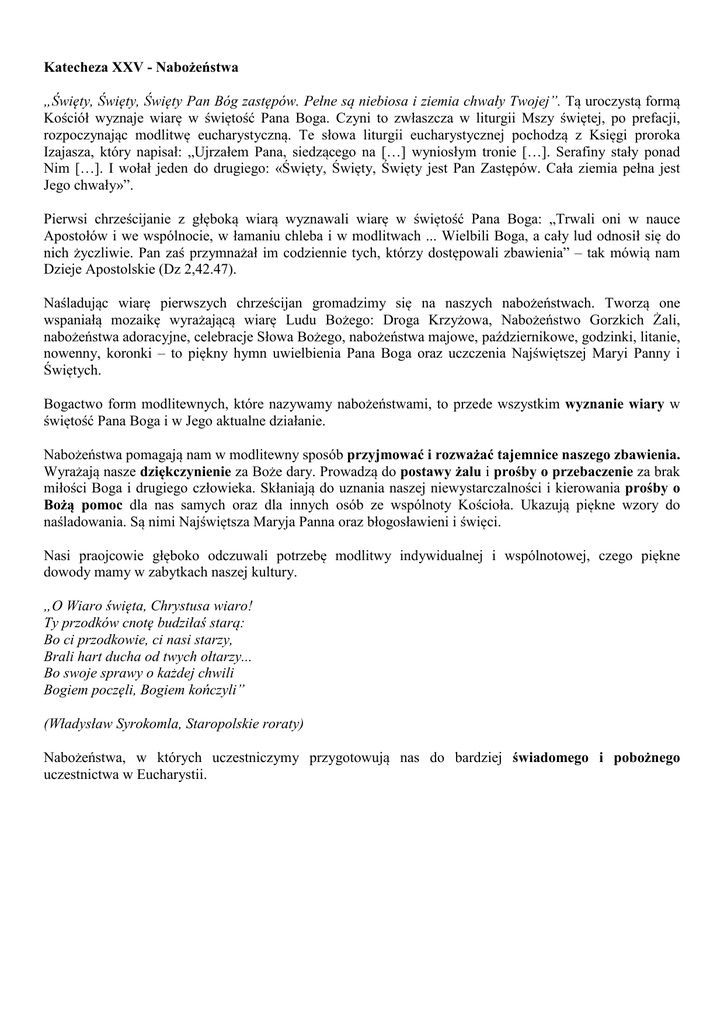 Katecheza XXV - Nabożeństwa „Święty, Święty, Święty Pan Bóg zastępów. Pełne są niebiosa i ziemia chwały Twojej”. Tą uroczystą formą Kościół wyznaje wiarę w świętość Pana Boga. Czyni to zwłaszcza w liturgii Mszy świętej, po prefacji, rozpoczynając modlitwę eucharystyczną. Te słowa liturgii eucharystycznej pochodzą z Księgi proroka Izajasza, który napisał: „Ujrzałem Pana, siedzącego na […] wyniosłym tronie […]. Serafiny stały ponad Nim […]. I wołał jeden do drugiego: «Święty, Święty, Święty jest Pan Zastępów. Cała ziemia pełna jest Jego chwały»”. Pierwsi chrześcijanie z głęboką wiarą wyznawali wiarę w świętość Pana Boga: „Trwali oni w nauce Apostołów i we wspólnocie, w łamaniu chleba i w modlitwach ... Wielbili Boga, a cały lud odnosił się do nich życzliwie. Pan zaś przymnażał im codziennie tych, którzy dostępowali zbawienia” – tak mówią nam Dzieje Apostolskie (Dz 2,42.47). Naśladując wiarę pierwszych chrześcijan gromadzimy się na naszych nabożeństwach. Tworzą one wspaniałą mozaikę wyrażającą wiarę Ludu Bożego: Droga Krzyżowa, Nabożeństwo Gorzkich Żali, nabożeństwa adoracyjne, celebracje Słowa Bożego, nabożeństwa majowe, październikowe, godzinki, litanie, nowenny, koronki – to piękny hymn uwielbienia Pana Boga oraz uczczenia Najświętszej Maryi Panny i Świętych. Bogactwo form modlitewnych, które nazywamy nabożeństwami, to przede wszystkim wyznanie wiary w świętość Pana Boga i w Jego aktualne działanie. Nabożeństwa pomagają nam w modlitewny sposób przyjmować i rozważać tajemnice naszego zbawienia. Wyrażają nasze dziękczynienie za Boże dary. Prowadzą do postawy żalu i prośby o przebaczenie za brak miłości Boga i drugiego człowieka. Skłaniają do uznania naszej niewystarczalności i kierowania prośby o Bożą pomoc dla nas samych oraz dla innych osób ze wspólnoty Kościoła. Ukazują piękne wzory do naśladowania. Są nimi Najświętsza Maryja Panna oraz błogosławieni i święci. Nasi praojcowie głęboko odczuwali potrzebę modlitwy indywidualnej i wspólnotowej, czego piękne dowody mamy w zabytkach naszej kultury. „O Wiaro święta, Chrystusa wiaro! Ty przodków cnotę budziłaś starą: Bo ci przodkowie, ci nasi starzy, Brali hart ducha od twych ołtarzy... Bo swoje sprawy o każdej chwili Bogiem poczęli, Bogiem kończyli” (Władysław Syrokomla, Staropolskie roraty) Nabożeństwa, w których uczestniczymy przygotowują nas do bardziej świadomego i pobożnego uczestnictwa w Eucharystii.