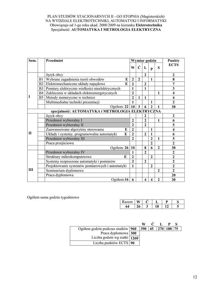 PLAN STUDIÓW STACJONARNYCH II - GO STOPNIA (Magisterskich) NA WYDZIALE ELEKTROTECHNIKI, AUTOMATYKI I INFORMATYKI Obowiązuje od 1-go roku akad. 2008/2009 na kierunku Elektrotechnika Specjalność: AUTOMATYKA I METROLOGIA ELEKTRYCZNA Sem. I II III Przedmiot B1 B2 B3 B4 B5 Wymiar godzin W Ć L P S Język obcy 2 Wybrane zagadnienia teorii obwodów E 2 2 1 Elektromechaniczne układy napędowe E 2 2 Pomiary elektryczne wielkości nieelektrycznych 1 1 Zakłócenia w układach elektroenergetycznych 2 1 Metody numeryczne w technice 2 1 1 Multimedialne techniki prezentacji 1 1 Ogółem: 22 10 3 6 2 1 specjalność: AUTOMATYKA i METROLOGIA ELEKTRYCZNA Język obcy 2 Przedmiot wybieralny I 2 2 1 Przedmiot wybieralny II 2 2 Zaawansowane algorytmy sterowania E 2 1 Układy i systemy. programowalne automatyki E 2 2 1 Przedmiot wybieralny III 2 2 1 Praca przejściowa 2 Ogółem: 26 10 8 6 2 Przedmiot wybieralny IV 1 2 Struktury mikrokomputerowe E 2 2 Systemy rozproszone automatyki i pomiarów 2 2 Projektowanie systemów pomiarowych i automatyki 1 2 Seminarium dyplomowe 2 Praca dyplomowa Ogółem:16 6 4 4 2 Punkty ECTS 2 8 7 3 4 4 2 30 2 6 5 4 6 5 2 30 2 2 2 2 2 20 30 Ogółem suma godzin tygodniowo Razem W 64 26 Ogółem godzin podczas studiów Praca dyplomowa Liczba godzin wg siatki Liczba punktów ECTS Ć 3 L 18 P 12 S 5 W Ć L P S 960 390 45 270 180 75 300 1260 90 12 Przedmioty wybieralne Przedmiot wybieralny I 2w, 2l, 1s 6 ECTS 2w, 2l 4 ECTS 2w, 2p, 1s 5 ECTS 1w, 2l 2 ECTS 1. Narzędzia modelowania w automatyce i rob. 2. Modelowanie systemów Przedmiot wybieralny II 1. Przetworniki i systemy pomiarowe 2. Przemysłowe sieci komputerowe Przedmiot wybieralny III 1. Komputerowe systemy sterowania 2. Systemy mikroprocesorowe w automatyce Przedmiot wybieralny IV 1. Systemy teleinformatyczne 2. Algorytmy przetwarzania sygnałów Analiza spełnienia standardów kształcenia Jest Standard 1. Liczba godzin 960 900 2. Liczba ECTS 90 90 3. Treści kierunkowe 270 165 B1. Wybrane zagadnienia teorii obwodów 75 B2. Elektromechaniczne systemy napędowe 60 B3. Pomiary elektr. wielkości nieelektrycznych 30 B4. Zakłócenia w układach elektroenergetycznych 45 B5. Metody numeryczne w technice 60 4. Praca dyplomowa 20 ECTS 5. Przedmioty wybieralne 255 220,5 godz Wymagana liczba godzin przedmiotów wybieralnych: 0,3*(960-165-60)=220,5 godzin 6. Lab+proj+ćw+sem 570 godz 59.4 % 50 % 13