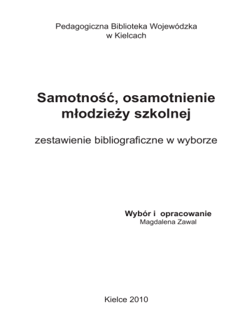 Pedagogiczna Biblioteka Wojewódzka w Kielcach Samotność, osamotnienie młodzieży szkolnej zestawienie bibliograficzne w wyborze Wybór i opracowanie Magdalena Zawal Kielce 2010 2 Wydawnictwa ciągłe 1. Dołęga, Zofia : Poczucie samotności a zachowania agresywne uczniów / Zofia Dołęga // „Psychologia Wychowawcza”. – 1999, nr 2, s. 146-153 2. Dołęga, Zofia : Rozumienie samotności przez dzieci i młodzież / Zofia Dołęga // „Psychologia Wychowawcza”. – 1997, nr 5, s. 436448 3. Górecki, Mirosław : O różnym rozumieniu samotności / Mirosław Górecki // „Pedagogika Społeczna”. – 2006, nr 3, s. 37-58. – Bibliogr. 4. Jagieła, Jarosław : Samotność w szkole / Jagieła Jarosław // „Psychologia w Szkole” . – 2004, nr 2, s. 3-16 [Samotność uczniów, skąd się bierze samotność. Typy samotności, jak przeciwdziałać] 5. Jakubowska, Luba : Współczesne oblicza samotności wśród młodzieży / Luba Jakubowska // „Kultura i Edukacja”. – 2004, nr 4, s. 75-84. – Bibliogr. 6. Kawula, Stanisław : Samotność licealistów / Stanisław Kawula // „Wychowanie na Co Dzień”. – 1999, nr 1/2, s.14-20. – Bibliogr. [Oblicza samotności i rozmiary tego zjawiska. Badanie i analiza przypadku] 7. Kozłowski, Waldemar : Samotność i osamotnienie / Waldemar Kozłowski // „Nowa Szkoła”. – 1996, nr 5, s. 19-21 8. Piotrów, Ewa : Osamotnienie a poziom lęku u młodzieży w wieku dorastania na przykładzie uczniów Zespołu Szkół Rolniczych w Słupsku / Ewa Piotrów // „Edukacja” . – 2004, nr 1, s. 95-105 [Polska młodzież w świetle zmian transformacyjnych. Poczucie osa- 3 motnienia młodzieży i poziom lęku w świetle badań własnych] 9. Szymańska, Justyna : Oblicza osamotnienia dzieci i młodzieży we współczesnym świecie / Justyna Szymańska // „Studia Pedagogiczno-Artystyczne”. – T. 6 (2006), s. 275-286 10. Zawadzki, Patryk : Poczucie alienacji, samotności i depresji u współczesnej młodzieży / Patryk Zawadzki // „Wychowanie na co Dzień”. – 2007, nr 12, s. 10-13. – Bibliogr. Wydawnictwa zwarte 11. Dołęga, Zofia : Samotność młodzieży - analiza teoretyczna i studia empiryczne / Zofia Dołęga. – Katowice : Wydawnictwo Uniwersytetu Śląskiego, 2003. – 205, [1]. – Bibliogr. Czytelnia Pedagogiczna Uniwersytetu Humanistyczno - Przyrodniczego Jana Kochanowskiego 12. Kozak, Stanisław : Patologie wśród dzieci i młodzieży : leczenie i profilaktyka / Stanisław Kozak. – Warszawa : Centrum Doradztwa i Informacji „Difin”, 2007. – 264 s. – Bibliogr. [Praca omawia pojęcie, rodzaje i przyczyny zjawisk patologicznych. Autor przedstawia psychospołeczne uwarunkowania patologii indywidualnych dzieci i młodzieży (anoreksja, bulimia, internetoholizm, lekomania, seksoholizm, pornografia, samookaleczenia, samobójstwa dzieci i młodzieży). Zwraca uwagę na patologię cywilizacji konsumpcyjnej i chorób cywilizacyjnych (zakupoholizm, alkoholizm, uzależnienie od narkotyków, nikotynizm, depresje dziecięce, nerwice dziecięce, nieśmiałość i samotność dzieci i młodzieży, psychopatie). Ostatnie rozdziały dotyczą zagadnień związanych z patologią rodzin (agresja i przemoc rodziców wobec dzieci, przemoc seksualna, zaburzenia emocjonalne, przestępczość nieletnich) i patologią zachowań w grupach społecznych (subkultury, „fala” w wojsku, pseudokibice, sekty religijne)] Sygn. 243629 Wypożyczalnia Pedagogicznej Biblioteki Wojewódz- 4 kiej Sygn. 244113 Czytelnia Pedagogicznej Biblioteki Wojewódzkiej 13. Mastalski, Janusz : Samotność globalnego nastolatka / Janusz Mastalski. – Kraków : Wydawnictwo Naukowe Papieskiej Akademii Teologicznej, 2007. – 658, [2] s. – Bibliogr. Biblioteka Narodowa 14. Niebrzydowski, Leon : Poczucie samotności a otwartość w stosunkach międzyludzkich studentów pierwszych lat studiów // W : Funkcje psychologii w dobie przemian społeczno-kulturowych w Polsce / red. Władysława Pilecka, Maria Kliś. –Kraków : Wydawnictwo Naukowe Wyższej Szkoły Pedagogicznej, 1997. – S. 108-118 Czytelnia Pedagogiczna Uniwersytetu Humanistyczno - Przyrodniczego Jana Kochanowskiego 15. Rembowski, Józef : Samotność / Józef Rembowski. – Gdańsk : Wydawnictwo Uniwersytetu Gdańskiego, 1992. – 157 s. – Bibliogr. Biblioteka Narodowa 16. Samotność i osamotnienie : [praca zbiorowa / pod red. Marii Szyszkowskiej]. – Warszawa : Instytut Wydawniczy Związków Zawodowych, 1988. – 132, [4] s. Sygn.198849, 198850, 198851, 198852 Wypożyczalnia Pedagogicznej Biblioteki Wojewódzkiej