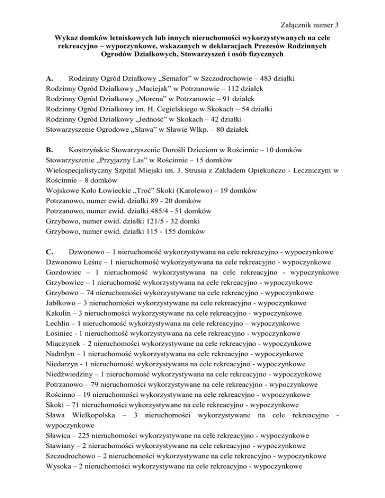 Załącznik numer 3 Wykaz domków letniskowych lub innych nieruchomości wykorzystywanych na cele rekreacyjno – wypoczynkowe, wskazanych w deklaracjach Prezesów Rodzinnych Ogrodów Działkowych, Stowarzyszeń i osób fizycznych A. Rodzinny Ogród Działkowy „Semafor” w Szczodrochowie – 483 działki Rodzinny Ogród Działkowy „Maciejak” w Potrzanowie – 112 działek Rodzinny Ogród Działkowy „Morena” w Potrzanowie – 91 działek Rodzinny Ogród Działkowy im. H. Cegielskiego w Skokach – 54 działki Rodzinny Ogród Działkowy „Jedność” w Skokach – 42 działki Stowarzyszenie Ogrodowe „Sława” w Sławie Wlkp. – 80 działek B. Kostrzyńskie Stowarzyszenie Dorośli Dzieciom w Rościnnie – 10 domków Stowarzyszenie „Przyjazny Las” w Rościnnie – 15 domków Wielospecjalistyczny Szpital Miejski im. J. Strusia z Zakładem Opiekuńczo - Leczniczym w Rościnnie – 8 domków Wojskowe Koło Łowieckie „Troć” Skoki (Karolewo) – 19 domków Potrzanowo, numer ewid. działki 89 - 20 domków Potrzanowo, numer ewid. działki 485/4 - 51 domków Grzybowo, numer ewid. działki 121/5 - 32 domki Grzybowo, numer ewid. działki 115 - 155 domków C. Dzwonowo – 1 nieruchomość wykorzystywana na cele rekreacyjno - wypoczynkowe Dzwonowo Leśne – 1 nieruchomość wykorzystywana na cele rekreacyjno - wypoczynkowe Gozdowiec – 1 nieruchomość wykorzystywana na cele rekreacyjno - wypoczynkowe Grzybowice – 1 nieruchomość wykorzystywana na cele rekreacyjno - wypoczynkowe Grzybowo – 74 nieruchomości wykorzystywane na cele rekreacyjno - wypoczynkowe Jabłkowo – 3 nieruchomości wykorzystywane na cele rekreacyjno - wypoczynkowe Kakulin – 3 nieruchomości wykorzystywane na cele rekreacyjno - wypoczynkowe Lechlin – 1 nieruchomość wykorzystywana na cele rekreacyjno – wypoczynkowe Łosiniec - 1 nieruchomość wykorzystywana na cele rekreacyjno - wypoczynkowe Miączynek – 2 nieruchomości wykorzystywane na cele rekreacyjno - wypoczynkowe Nadmłyn – 1 nieruchomość wykorzystywana na cele rekreacyjno - wypoczynkowe Niedarzyn - 1 nieruchomość wykorzystywana na cele rekreacyjno - wypoczynkowe Niedźwiedziny – 1 nieruchomość wykorzystywana na cele rekreacyjno - wypoczynkowe Potrzanowo – 79 nieruchomości wykorzystywane na cele rekreacyjno - wypoczynkowe Rościnno – 19 nieruchomości wykorzystywane na cele rekreacyjno - wypoczynkowe Skoki – 71 nieruchomości wykorzystywane na cele rekreacyjno - wypoczynkowe Sława Wielkopolska – 3 nieruchomości wykorzystywane na cele rekreacyjno wypoczynkowe Sławica – 225 nieruchomości wykorzystywane na cele rekreacyjno - wypoczynkowe Stawiany – 2 nieruchomości wykorzystywane na cele rekreacyjno - wypoczynkowe Szczodrochowo – 2 nieruchomości wykorzystywane na cele rekreacyjno - wypoczynkowe Wysoka – 2 nieruchomości wykorzystywane na cele rekreacyjno - wypoczynkowe