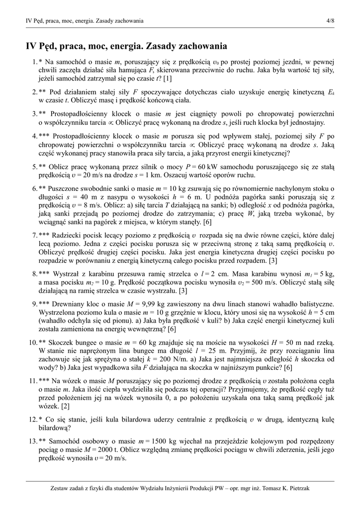 Zestaw zadań z fizyki dla Wydziału Inżynierii Produkcji
