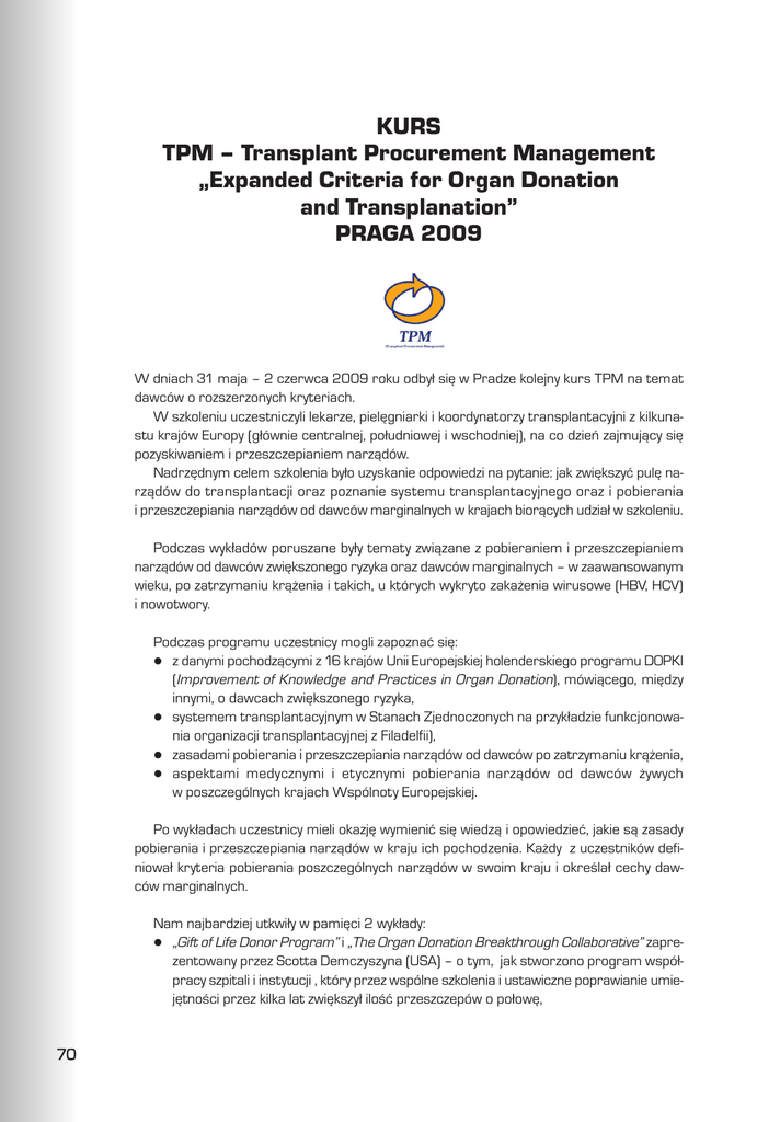 KURS TPM Transplant Procurement Management Expanded Criteria for Organ Donation and Transplanation PRAGA 2009 W dniach 31 maja 2 czerwca 2009 roku odby³ siê w Pradze kolejny kurs TPM na temat dawców o rozszerzonych kryteriach. W szkoleniu uczestniczyli lekarze, pielêgniarki i koordynatorzy transplantacyjni z kilkunastu krajów Europy (g³ównie centralnej, po³udniowej i wschodniej), na co dzieñ zajmuj¹cy siê pozyskiwaniem i przeszczepianiem narz¹dów. Nadrzêdnym celem szkolenia by³o uzyskanie odpowiedzi na pytanie: jak zwiêkszyæ pulê narz¹dów do transplantacji oraz poznanie systemu transplantacyjnego oraz i pobierania i przeszczepiania narz¹dów od dawców marginalnych w krajach bior¹cych udzia³ w szkoleniu. Podczas wyk³adów poruszane by³y tematy zwi¹zane z pobieraniem i przeszczepianiem narz¹dów od dawców zwiêkszonego ryzyka oraz dawców marginalnych w zaawansowanym wieku, po zatrzymaniu kr¹¿enia i takich, u których wykryto zaka¿enia wirusowe (HBV, HCV) i nowotwory. Podczas programu uczestnicy mogli zapoznaæ siê: z danymi pochodz¹cymi z 16 krajów Unii Europejskiej holenderskiego programu DOPKI (Improvement of Knowledge and Practices in Organ Donation), mówi¹cego, miêdzy innymi, o dawcach zwiêkszonego ryzyka, l systemem transplantacyjnym w Stanach Zjednoczonych na przyk³adzie funkcjonowania organizacji transplantacyjnej z Filadelfii), l zasadami pobierania i przeszczepiania narz¹dów od dawców po zatrzymaniu kr¹¿enia, l aspektami medycznymi i etycznymi pobierania narz¹dów od dawców ¿ywych w poszczególnych krajach Wspólnoty Europejskiej. l Po wyk³adach uczestnicy mieli okazjê wymieniæ siê wiedz¹ i opowiedzieæ, jakie s¹ zasady pobierania i przeszczepiania narz¹dów w kraju ich pochodzenia. Ka¿dy z uczestników definiowa³ kryteria pobierania poszczególnych narz¹dów w swoim kraju i okrela³ cechy dawców marginalnych. Nam najbardziej utkwi³y w pamiêci 2 wyk³ady: l Gift of Life Donor Program i The Organ Donation Breakthrough Collaborative zaprezentowany przez Scotta Demczyszyna (USA) o tym, jak stworzono program wspó³pracy szpitali i instytucji , który przez wspólne szkolenia i ustawiczne poprawianie umiejêtnoci przez kilka lat zwiêkszy³ iloæ przeszczepów o po³owê, 70 Uczestnicy szkolenia z Polski w towarzystwie Scotta W. Demczyszyna dyrektora Transplant Coordinator Services Gift of Life Donor Program (USA, Philadelphia) l Nord Italy Transplant Program zaprezentowany przez Giuseppe Piccolo mówi¹cy o tym, ¿e wiek dawcy nie jest ograniczeniem (we W³oszech najstarszy dawca p³uc mia³ 67 lat, w¹troby 91 lat, serca -71 lat, nerek- 89 lat) oraz przypominaj¹cy o naczelnej zasadzie dok³adnego badania dawców, by nie przenosiæ chorób nowotworowych lub zakanych, lecz z drugiej strony stwierdzenie zero ryzyka = zero transplantacji. Atmosfera Pragi i program towarzysz¹cy zorganizowany przez czeskich gospodarzy z KST (Koordinaèni Støedisko Transplantaci) w po³¹czeniu z otwartoci¹, zaanga¿owaniem i fachowoci¹ dyrektora TPM Martiego Manyalicha wywar³a na wszystkich niezapomniane wra¿enia. Z ¿alem opuszczalimy Pragê, ale i z zadowoleniem ,¿e poznalimy tak wspania³ych przyjació³ i zyskalimy nowe spojrzenie na przeszczepianie narz¹dów i impuls do dalszej pracy. Uczestnicy forum TPM Anna Pszenny, Jacek Bicki, Adam Parulski 71