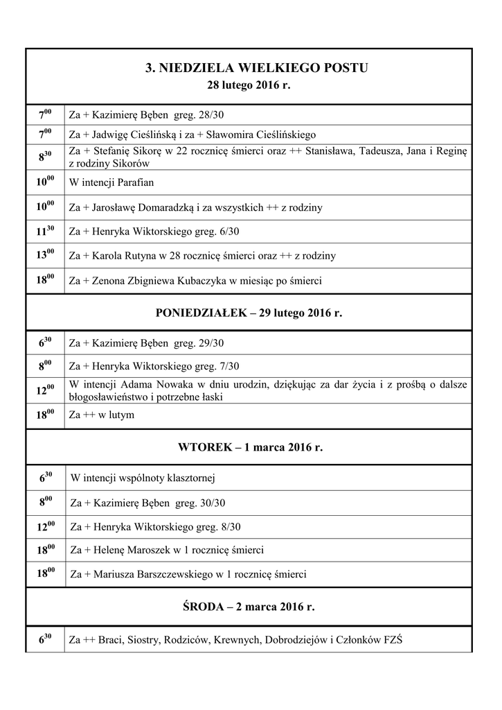 3. NIEDZIELA WIELKIEGO POSTU 28 lutego 2016 r. 700 Za + Kazimierę Bęben greg. 28/30 700 Za + Jadwigę Cieślińską i za + Sławomira Cieślińskiego Za + Stefanię Sikorę w 22 rocznicę śmierci oraz ++ Stanisława, Tadeusza, Jana i Reginę z rodziny Sikorów 830 1000 W intencji Parafian 1000 Za + Jarosławę Domaradzką i za wszystkich ++ z rodziny 1130 Za + Henryka Wiktorskiego greg. 6/30 1300 Za + Karola Rutyna w 28 rocznicę śmierci oraz ++ z rodziny 1800 Za + Zenona Zbigniewa Kubaczyka w miesiąc po śmierci PONIEDZIAŁEK – 29 lutego 2016 r. 630 Za + Kazimierę Bęben greg. 29/30 800 Za + Henryka Wiktorskiego greg. 7/30 1200 W intencji Adama Nowaka w dniu urodzin, dziękując za dar życia i z prośbą o dalsze błogosławieństwo i potrzebne łaski 1800 Za ++ w lutym WTOREK – 1 marca 2016 r. 630 W intencji wspólnoty klasztornej 800 Za + Kazimierę Bęben greg. 30/30 1200 Za + Henryka Wiktorskiego greg. 8/30 1800 Za + Helenę Maroszek w 1 rocznicę śmierci 1800 Za + Mariusza Barszczewskiego w 1 rocznicę śmierci ŚRODA – 2 marca 2016 r. 630 Za ++ Braci, Siostry, Rodziców, Krewnych, Dobrodziejów i Członków FZŚ 800 Za + Henryka Wiktorskiego greg. 9/30 1200 Za + Jana w 8 rocznicę śmierci 1800 Msza św. Wspólnotowa CZWARTEK – 3 marca 2016 r. 630 W pewnej intencji 800 Za + Stanisława Boguszewskiego w 4 rocznicę śmierci oraz prośba o Boże błogosławieństwo dla całej rodziny 1200 Za + Henryka Wiktorskiego greg. 10/30 1800 O liczne i dobre powołania kapłańskie i zakonne PIĄTEK – 4 marca 2016 r. Święto św. Kazimierza, Królewicza 630 Za dusze w czyśćcu cierpiące 800 Za + Kazimierza Plawgo z okazji 25 rocznicy śmierci i za + Wiktorię Plawgo w 10 rocznicę śmierci 800 Za + Henryka Wiktorskiego greg. 11/30 1200 W intencji Straży Honorowej NSPJ 1800 Za + Kazimierza Stawarskiego 1800 W intencji o. Kazimierza, z okazji imienin - od FZŚ SOBOTA – 5 marca 2016 r. 630 800 1200 1800 Za + Henryka Wiktorskiego greg. 12/30 W intencji Żywego Różańca oraz za kapłanów i siostry zakonne pracujących w naszej parafii Za + Henryka Pienio w 7 rocznicę śmierci oraz za + Ignacego Ślusarczyka i Wandę Kiszka Za + rodziców z obu stron: Wacława i Józefę, Hilarego i Zofię