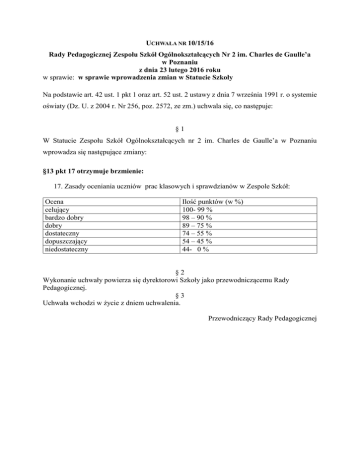 UCHWAŁA NR 10/15/16 Rady Pedagogicznej Zespołu Szkół Ogólnokształcących Nr 2 im. Charles de Gaulle’a w Poznaniu z dnia 23 lutego 2016 roku w sprawie: w sprawie wprowadzenia zmian w Statucie Szkoły Na podstawie art. 42 ust. 1 pkt 1 oraz art. 52 ust. 2 ustawy z dnia 7 września 1991 r. o systemie oświaty (Dz. U. z 2004 r. Nr 256, poz. 2572, ze zm.) uchwala się, co następuje: §1 W Statucie Zespołu Szkół Ogólnokształcących nr 2 im. Charles de Gaulle’a w Poznaniu wprowadza się następujące zmiany: §13 pkt 17 otrzymuje brzmienie: 17. Zasady oceniania uczniów prac klasowych i sprawdzianów w Zespole Szkół: Ocena celujący bardzo dobry dobry dostateczny dopuszczający niedostateczny Ilość punktów (w %) 100- 99 % 98 – 90 % 89 – 75 % 74 – 55 % 54 – 45 % 44- 0 % §2 Wykonanie uchwały powierza się dyrektorowi Szkoły jako przewodniczącemu Rady Pedagogicznej. §3 Uchwała wchodzi w życie z dniem uchwalenia. Przewodniczący Rady Pedagogicznej