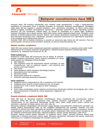 Komputer nawodnieniowy Aqua 300 Komputer AQUA 300 produkcji holenderskiej firmy HortiMax został zaprojektowany z myślą o zapotrzebowaniu plantatorów na nowoczesne, łatwe w obsłudze komputery do sterowania systemami nawadniającymi. Niewątpliwą zaletą AQUA 300 jest wygodna w obsłudze klawiatura i duŜy, ośmioliniowy wyświetlacz, na którym moŜna szybko dokonać przeglądu wszystkich wprowadzanych parametrów i zbiorczego zestawienia danych. Najczęściej uŜywane parametry, jak czas nawadniania, wielkość dawki, czy wartość EC wyświetlane są w sposób ciągły. Dodatkowo komputer wyposaŜony jest w klawisz pomocy, dzięki której moŜna uzyskać objaśnienie danej funkcji. Szczególny nacisk połoŜono na sposób programowania zaworów. Zawory o tych samych parametrach przypisywane są do jednej grupy. Dane dotyczące nawadniania (czas, częstotliwość, parametry nawoŜenia) umieszczane są w odpowiednich programach, te zaś przypisuje się do Ŝądanej grupy zaworów. Komputer AQUA 300 ma budowę modułową, co pozwala na rozszerzanie jego funkcji (do 100 zaworów). MoŜe być wykorzystywany równieŜ do kontroli procesów nawoŜenia, do ochrony antyprzymrozkowej, itd. Wybór modelu urządzenia AQUA 300 moŜe zawierać bardzo rozbudowane opcjonalne wyposaŜenie techniczne, co zapewnia szeroki wybór modeli dostosowanych do rozmaitych systemów nawadniających. Modułowa budowa komputera umoŜliwia jego łatwą rozbudowę, np. wstawianie kart kontroli pH, EC, itd. Model podstawowy Podstawowy model AQUA 300 przeznaczony jest do obsługi 20 zaworów i posiada 3 programy nawadniania. Zawory mogą być podzielone na 3 grupy. KaŜdy program ma następujące funkcje sterujące: Start zegarowy Start czujnikowy (moŜe być kontrolowany róŜnymi czujnikami, np. start tensjometryczny, start na podstawie sygnału z tacy startowej, start ochrony przed przymrozkami) Start ręczny Jedno dodatkowe wyjście sygnałowe dla kaŜdego programu Nawadnianie przed i po nawoŜeniu Sterowanie pompą Równoczesne otwarcie do 4 zaworów MoŜliwość cyklicznego powtarzania programów Opcje rozszerzeń Dodatkowe zawory (maksymalnie do 100, w modułach po 20 zaworów) Dodatkowe grupy zaworów (moduł rozszerzenia max. do 10 grup) Kontrola EC (1, 2 lub 3 zawory dozujące lub zawór mieszający) Kontrola pH Moduł meteo umoŜliwiający pomiar natęŜenia promieniowania słonecznego (radiacji) warunkującego start i wpływ tego promieniowania na wartość EC, pomiar temperatury, wilgotności, itp. Drukarka Zasada działania urządzenia AQUA 300 AQUA 300 słuŜy do sterowania systemem nawadniającym. Proces nawadniania jest uwarunkowany wieloma czynnikami, takimi jak: pH, EC, temperatura wody, szybkość parowania, nagromadzenie soli w podłoŜu i nasłonecznienie. W celu zapewnienia optymalnego wzrostu roślin, naleŜy ustalić pewien poziom wartości tych czynników w zaleŜności od rodzaju uprawy, pory dnia i roku, itp. Sterowanie systemem nawadniającym jest procesem ciągłej regulacji, uwarunkowanym zewnętrznymi czynnikami, np. pogodą, jakością doprowadzanej wody, itd. Aby uwzględnić oddziaływanie tych czynników, komputer musi mieć moŜliwość ich pomiaru (lub naleŜy wprowadzić do komputera odpowiednie wartości). W związku z powyŜszym, pomiary przeprowadzane są zarówno wewnątrz jak i na zewnątrz szklarni. Wielkościami, które moŜna mierzyć wewnątrz są: EC, pH, natęŜenie promieniowania słonecznego, natęŜenie przepływu, wartość czynnika startowego i wiele innych. Komputer reguluje wartość danego parametru na podstawie róŜnicy między wartością docelową zadaną przez uŜytkownika a wartością zmierzoną w danym czasie. Sterowanie parametrami realizowane jest poprzez mechanizmy wykonawcze, tzn. urządzenia nawadniające lub nawoŜące (zawory, itd.) Program Zawory i grupy zaworów Zawory moŜna przydzielać do poszczególnych grup w dowolny sposób, przy czym kaŜdy zawór moŜe być przypisany tylko do jednej z grup. KaŜdą grupę moŜna przydzielić do jednego z trzech programów nawadniania (w wersji podstawowej). Do określonej grupy zaworów podawany jest roztwór o tych samych wartościach pH i EC, z tą samą częstotliwością. Grupa składa się z określonej liczby zaworów. KaŜdy z zaworów w ramach danej grupy moŜe mieć róŜną wielkość dawki polewowej, określanej procentowo w odniesieniu do zadanej dla grupy dawki podstawowej. Program nawadniania KaŜdy program nawadniania posiada kilka opcji startowych. KaŜda funkcja zawiera szereg parametrów, które określają dawkę nawadniania, dozowanie lub brak poŜywek, włączanie zamgławiania, itd. MoŜna uaktywnić tylko jedną grupę zaworów w tym samym czasie. Jeśli nawadnianie powinno odbyć się w dalszych grupach zaworów, to komputer wstrzymuje pracę tych grup do czasu zakończenia realizacji programu aktualnie aktywnej grupy zaworów. Program zamgławiający moŜna uruchamiać równocześnie z innym programem nawadniającym. Opcje startu Program nawadniania, stosowany w AQUA 300, moŜna uruchamiać i zatrzymywać róŜnymi metodami. Dla kaŜdej grupy zaworów moŜna wybrać opcję startu zegarowego, dwie opcje startu cyklicznego, start sensorowy i start radiacyjny (jeśli komputer ma zainstalowaną rozszerzającą kartę meteo) lub kombinację kilku opcji startowych. Start ręczny: ręczne uruchomienie wybranej grupy zaworów, poprzez naciśnięcie przycisku startu na klawiaturze. Start zegarowy: automatyczne uruchamianie grupy zaworów o zadanej godzinie, w kaŜdym lub w wybranym dniu tygodnia Start cykliczny: automatyczny start grupy zaworów z ustalonymi czasami pauzy. MoŜna tu zaprogramować osobne długości przerw między startami dla dwóch okresów dnia, określając czas początku, czas cyklu i czas zakończenia dla danego okresu. Start radiacyjny: start po osiągnięciu zadanej progowej wartości natęŜenia promieniowania słonecznego. Start czujnikowy: start po odebran