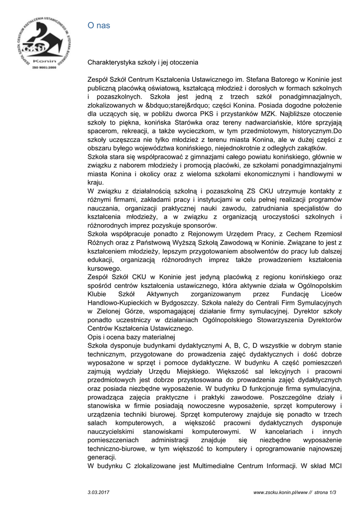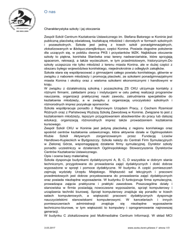O nas Charakterystyka szkoły i jej otoczenia Zespół Szkół Centrum Kształcenia Ustawicznego im. Stefana Batorego w Koninie jest publiczną placówką oświatową, kształcącą młodzież i dorosłych w formach szkolnych i pozaszkolnych. Szkoła jest jedną z trzech szkół ponadgimnazjalnych, zlokalizowanych w „starej” części Konina. Posiada dogodne położenie dla uczących się, w pobliżu dworca PKS i przystanków MZK. Najbliższe otoczenie szkoły to piękna, konińska Starówka oraz tereny nadwarciańskie, które sprzyjają spacerom, rekreacji, a także wycieczkom, w tym przedmiotowym, historycznym.Do szkoły uczęszcza nie tylko młodzież z terenu miasta Konina, ale w dużej części z obszaru byłego województwa konińskiego, niejednokrotnie z odległych zakątków. Szkoła stara się współpracować z gimnazjami całego powiatu konińskiego, głównie w związku z naborem młodzieży i promocją placówki, ze szkołami ponadgimnazjalnymi miasta Konina i okolicy oraz z wieloma szkołami ekonomicznymi i handlowymi w kraju. W związku z działalnością szkolną i pozaszkolną ZS CKU utrzymuje kontakty z różnymi firmami, zakładami pracy i instytucjami w celu pełnej realizacji programów nauczania, organizacji praktycznej nauki zawodu, zatrudniania specjalistów do kształcenia młodzieży, a w związku z organizacją uroczystości szkolnych i różnorodnych imprez pozyskuje sponsorów. Szkoła współpracuje ponadto z Rejonowym Urzędem Pracy, z Cechem Rzemiosł Różnych oraz z Państwową Wyższą Szkołą Zawodową w Koninie. Związane to jest z kształceniem młodzieży, lepszym przygotowaniem absolwentów do pracy lub dalszej edukacji, organizacją różnorodnych imprez także prowadzeniem kształcenia kursowego. Zespół Szkół CKU w Koninie jest jedyną placówką z regionu konińskiego oraz spośród centrów kształcenia ustawicznego, która aktywnie działa w Ogólnopolskim Klubie Szkół Aktywnych zorganizowanym przez Fundację Liceów Handlowo-Kupieckich w Bydgoszczy. Szkoła należy do Centrali Firm Symulacyjnych w Zielonej Górze, wspomagającej działanie firmy symulacyjnej. Dyrektor szkoły ponadto uczestniczy w działaniach Ogólnopolskiego Stowarzyszenia Dyrektorów Centrów Kształcenia Ustawicznego. Opis i ocena bazy materialnej Szkoła dysponuje budynkami dydaktycznymi A, B, C, D wszystkie w dobrym stanie technicznym, przygotowane do prowadzenia zajęć dydaktycznych i dość dobrze wyposażone w sprzęt i pomoce dydaktyczne. W budynku A część pomieszczeń zajmują wydziały Urzędu Miejskiego. Większość sal lekcyjnych i pracowni przedmiotowych jest dobrze przystosowana do prowadzenia zajęć dydaktycznych oraz posiada niezbędne wyposażenie. W budynku D funkcjonuje firma symulacyjna, prowadząca zajęcia praktyczne i praktyki zawodowe. Poszczególne działy i stanowiska w firmie posiadają nowoczesne wyposażenie, sprzęt komputerowy i urządzenia techniki biurowej. Sprzęt komputerowy znajduje się ponadto w trzech salach komputerowych, a większość pracowni dydaktycznych dysponuje nauczycielskimi stanowiskami komputerowymi. W kancelariach i innych pomieszczeniach administracji znajduje się niezbędne wyposażenie techniczno-biurowe, w tym większość to komputery i oprogramowanie najnowszej generacji. W budynku C zlokalizowane jest Multimedialne Centrum Informacji. W skład MCI 3.03.2017 www.zscku.konin.pl/www // strona 1/3 wchodzi czytelnia z 8 stanowiskami komputerowymi i dostępem do internetu oraz w znacznej części skomputeryzowana szkolna biblioteka, która szczyci się bogatym księgozbiorem i nowoczesnym wyposażeniem. W piwnicach budynku C znajduje się pracownia krawiecka oraz siłownie i salki przystosowane do ćwiczeń z zakresu wychowania fizycznego. Zajęcia WF odbywają się również na boisku szkolnym, które posiada urządzenia tzw. „zielonej sali”.. Otoczenie i plac szkolny nie mają bezpośredniego wyjścia na ulicę, stanowią więc bezpieczne i dogodne miejsce do przebywania i odpoczynku młodzieży. Tereny zielone i otoczenie szkoły są zadbane, uporządkowane i odpowiednio zagospodarowane. Wejście do głównego budynku posiada podjazd dla niepełnosprawnych. Przewiduje się dostosowanie całego budynku C i D do możliwości kształcenia osób niepełnosprawnych. W czasie przerw młodzież może korzystać z usług kawiarenki, zlokalizowanej na parterze budynku C. Organizacja pracy w placówce Zespół Szkół CKU w Koninie prowadzi kształcenie młodzieży i dorosłych zarówno w formach szkolnych i pozaszkolnych. Oferta edukacyjna szkoły jest bardzo bogata, jednak większość to kierunki ekonomiczne, handlowe, administracyjno-biurowe oraz informatyczne. W szkołach dla dorosłych funkcjonują różnorodne kierunki na poziomie szkoły średniej oraz policealnej, w tym również Liceum Ogólnokształcące. Proponowane kierunki i zawody są ciągle analizowane i dostosowywane w miarę możliwości do potrzeb lokalnego rynku pracy. W ostatnim czasie zwiększa się zapotrzebowanie na absolwentów technikum i szkół zawodowych. Od kilku lat zauważa się coraz większe zainteresowanie młodzieży kształceniem ogólnokształcącym, dlatego należy dążyć do wznowienia Liceum Ogólnokształcącego dla młodzieży, a ograniczać nabór do Liceów Profilowanych. Szkoły stacjonarne odbywają zajęcia w tygodniu od poniedziałku do piątku – młodzież w godzinach dopołudniowych, dorośli w godzinach popołudniowych. Słuchacze form zaocznych uczęszczają na zajęcia i konsultacje w soboty i niedziele. Słuchacze form pozaszkolnych, mogą mieć zajęcia w szkole lub poza szkołą w różne dni tygodnia i w różnych godzinach, w zależności od możliwości szkoły i życzeń kandydatów. Placówką kieruje Dyrektor Szkoły – mgr inż. Jan Wawrzyniak z pomocą Zespołu Kierowniczego, w skład którego wchodzą: a. wicedyrektor ds. kształcenia młodzieży – mgr Krzysztof Pachciarz b. wicedyrekt