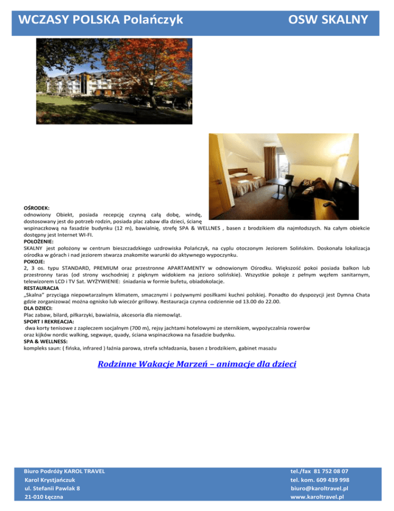 WCZASY POLSKA Polańczyk OSW SKALNY OŚRODEK: odnowiony Obiekt, posiada recepcję czynną całą dobę, windę, dostosowany jest do potrzeb rodzin, posiada plac zabaw dla dzieci, ścianę wspinaczkową na fasadzie budynku (12 m), bawialnię, strefę SPA & WELLNES , basen z brodzikiem dla najmłodszych. Na całym obiekcie dostępny jest Internet WI-FI. POŁOŻENIE: SKALNY jest położony w centrum bieszczadzkiego uzdrowiska Polańczyk, na cyplu otoczonym Jeziorem Solińskim. Doskonała lokalizacja ośrodka w górach i nad jeziorem stwarza znakomite warunki do aktywnego wypoczynku. POKOJE: 2, 3 os. typu STANDARD, PREMIUM oraz przestronne APARTAMENTY w odnowionym Ośrodku. Większość pokoi posiada balkon lub przestronny taras (od strony wschodniej z pięknym widokiem na jezioro solińskie). Wszystkie pokoje z pełnym węzłem sanitarnym, telewizorem LCD i TV Sat. WYŻYWIENIE: śniadania w formie bufetu, obiadokolacje. RESTAURACJA „Skalna” przyciąga niepowtarzalnym klimatem, smacznymi i pożywnymi posiłkami kuchni polskiej. Ponadto do dyspozycji jest Dymna Chata gdzie zorganizować można ognisko lub wieczór grillowy. Restauracja czynna codziennie od 13.00 do 22.00. DLA DZIECI: Plac zabaw, bilard, piłkarzyki, bawialnia, akcesoria dla niemowląt. SPORT I REKREACJA: dwa korty tenisowe z zapleczem socjalnym (700 m), rejsy jachtami hotelowymi ze sternikiem, wypożyczalnia rowerów oraz kijków nordic walking, segwaye, quady, ściana wspinaczkowa na fasadzie budynku. SPA & WELLNESS: kompleks saun: ( fińska, infrared ) łaźnia parowa, strefa schładzania, basen z brodzikiem, gabinet masażu Rodzinne Wakacje Marzeń – animacje dla dzieci Biuro Podróży KAROL TRAVEL Karol Krystjańczuk ul. Stefanii Pawlak 8 21-010 Łęczna tel./fax 81 752 08 07 tel. kom. 609 439 998 [email protected] www.karoltravel.pl WCZASY POLSKA Polańczyk OSW SKALNY Cena zawiera: 7 noclegów z wyżywieniem HB śniadania i obiadokolacje Animacje przez 5 dni pobytu 2-3 h dziennie prowadzone przez nasza kadrę instruktorów i animatorów czasu wolnego dla Dzieci codzienny dostęp do SPA dla całej rodziny wynajem rowerów z akcesoriami dla dzieci (1 dzień wypożyczenia w cenie ) dyskoteka w pianie z uczestnikami Akademii Przygody bezpłatny internet WI-FI parking dla Gości 8 dni ( 7 noclegów) 5 dni ( 4 noclegi) Cena zawiera: 7 lub 4 noclegi* w naszych obiektach – Hotel Skalny SPA oraz OW Dom na Skale Biuro Podróży KAROL TRAVEL Karol Krystjańczuk ul. Stefanii Pawlak 8 21-010 Łęczna tel./fax 81 752 08 07 tel. kom. 609 439 998 [email protected] www.karoltravel.pl WCZASY POLSKA Polańczyk OSW SKALNY 7 lub 4 śniadania* w formie bufetu 6 lub 3 obiady* w porze kolacji biesiada bieszczadzka przy wielkim ognisku z muzyką rejs jachtem (2 h) codzienny dostęp do strefy SPA wypożyczenie rowerów na 1 dobę/os. bezpłatny internet WI-FI parking dla Gości WYCIECZKI FAKULTATYWNE: Lwów miasto Lwa – dorośli 120 zł/os., młodzież 100 zł/os. (*wymagany paszport) Węgry winnym szlakiem – dorośli 130 zł, młodzież 110 zł Traperska wyprawa w Bieszczady – dorośli 89 zł, młodzież 65 zł Spływy pontonami doliną Sanu – dorośli 50 zł, młodzież 40 zł Wyprawa Szlakiem Łemka i Bojka – dorośli 80 zł, młodzież 50 zł Wyprawy 4×4 Szlakiem Watahy – od 120 zł / os. Lot szybowcem – od 120 zł / os. Rodziny na drezyny (drezyny rowerowe) – od 90 zł / os. Rejsy jachtem kabinowym po Solinie – od 30 zł Doba hotelowa: 14.00 – 16.00 Biuro Podróży KAROL TRAVEL Karol Krystjańczuk ul. Stefanii Pawlak 8 21-010 Łęczna tel./fax 81 752 08 07 tel. kom. 609 439 998 [email protected] www.karoltravel.pl